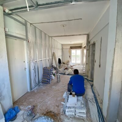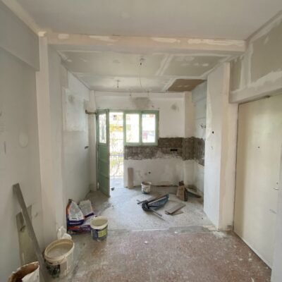 Αρχικά η ανακαίνιση σπιτιού ξεκίνησε με τις αποξηλώσεις και τα διάφορα γκρεμίσματα και χτισίματα τοίχων έτσι ώστε να δώσουμε στο διαμέρισμα τη δομή που μελετήσαμε αρχιτεκτονικά. Κατασκευάστηκαν νέες υδραυλικές και ηλεκτρολογικές εγκαταστάσεις και δημιουργήθηκαν νέες σωληνώσεις θέρμανσης με σώματα καλοριφέρ τον έλεγχο των οποίων τον έχει μία αντλία θερμότητας της εταιρείας LG, η οποία συνδυάζεται με έναν ηλιακό θερμοσίφωνα στην ταράτσα. Στα πατώματα τοποθετήθηκε βινυλικό δάπεδο της εταιρείας Tarkett, ενώ άλλαξαν τα εξωτερικά κουφώματα με ενεργειακά κουφώματα αλουμινίου.