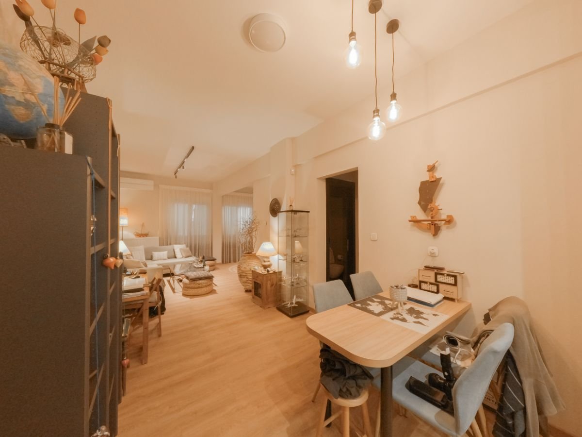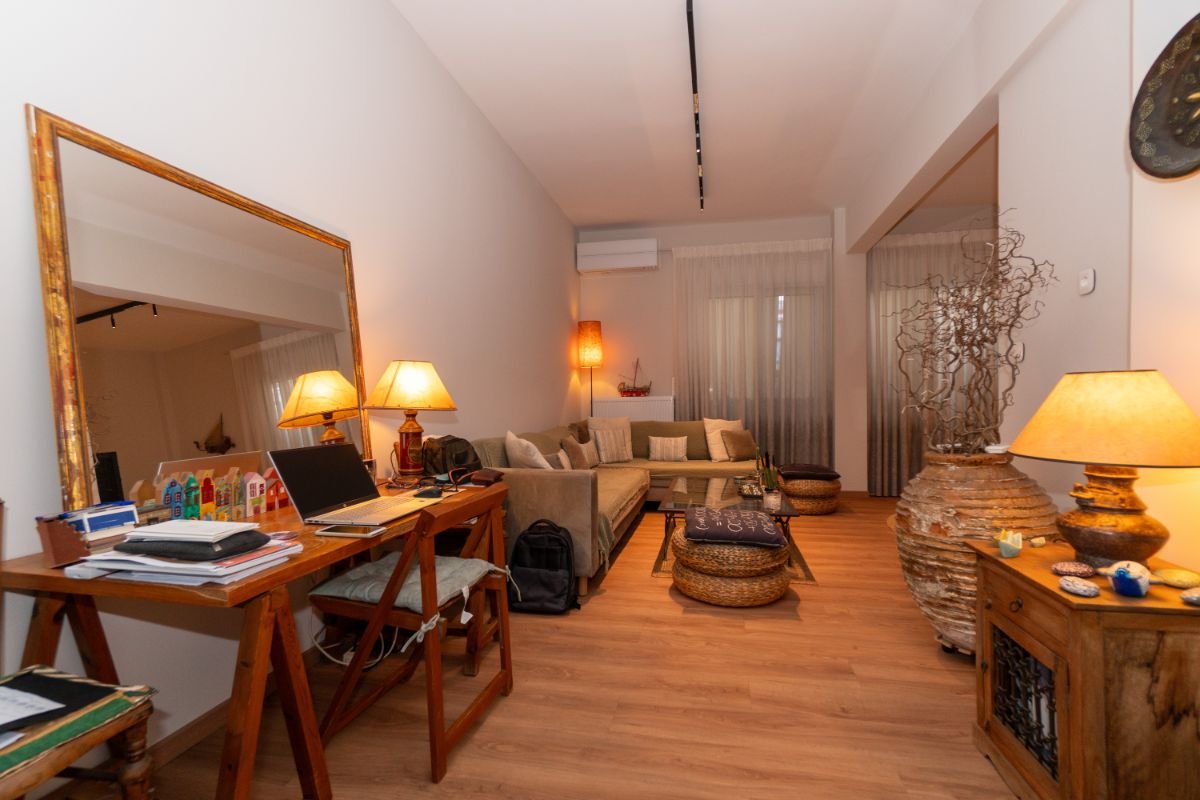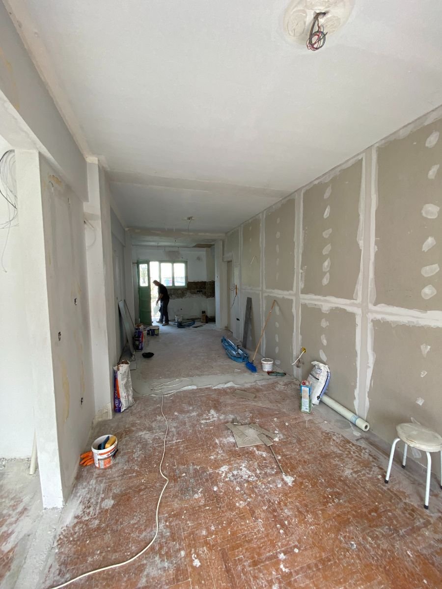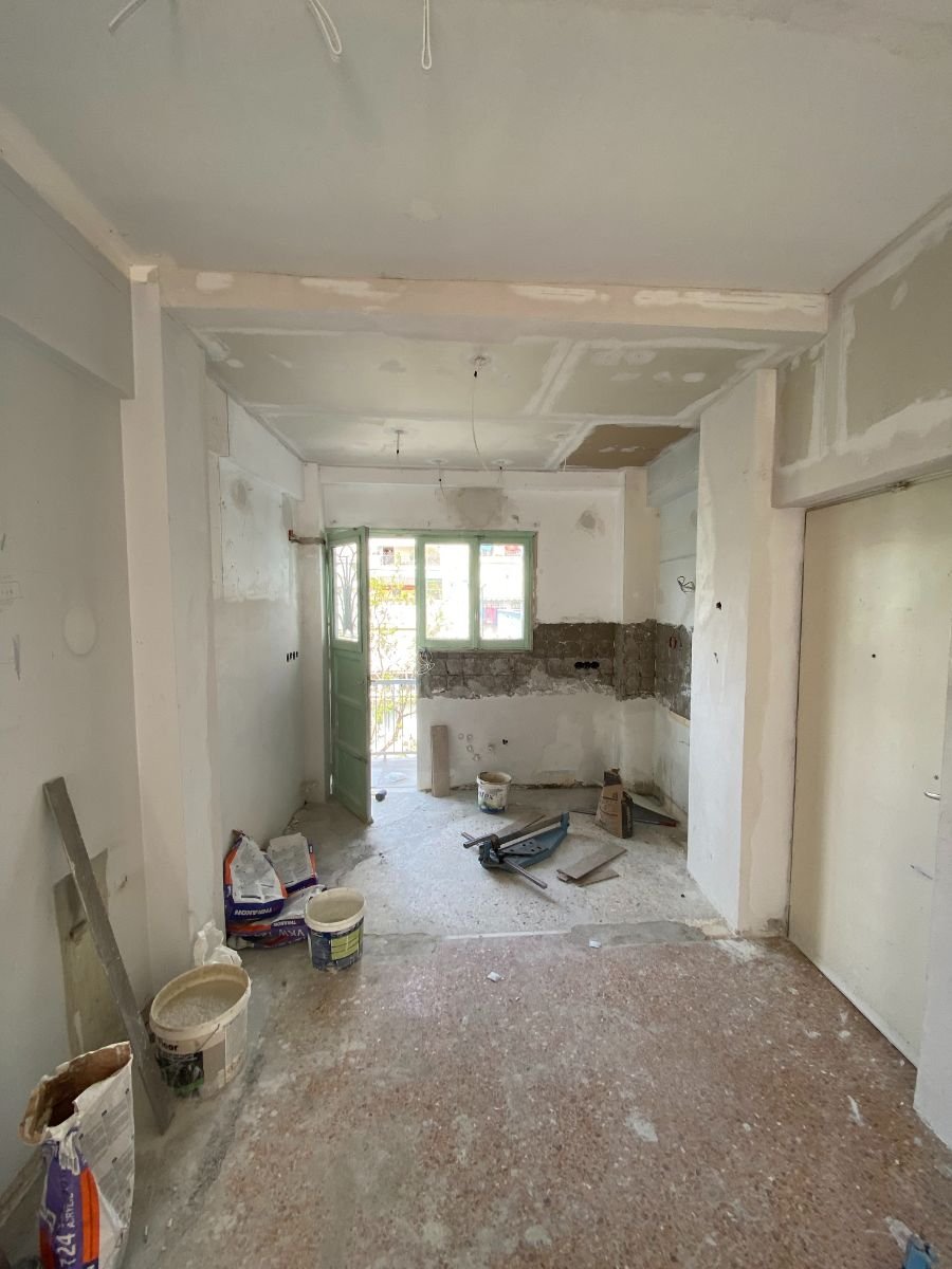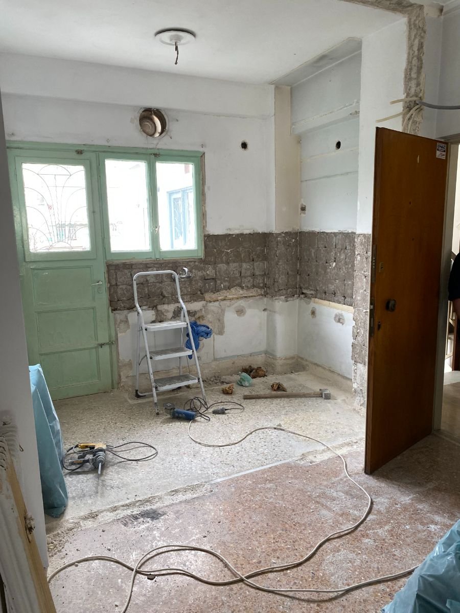 Αρχικά η ανακαίνιση σπιτιού ξεκίνησε με τις αποξηλώσεις και τα διάφορα γκρεμίσματα και χτισίματα τοίχων έτσι ώστε να δώσουμε στο διαμέρισμα τη δομή που μελετήσαμε αρχιτεκτονικά. Κατασκευάστηκαν νέες υδραυλικές και ηλεκτρολογικές εγκαταστάσεις και δημιουργήθηκαν νέες σωληνώσεις θέρμανσης με σώματα καλοριφέρ τον έλεγχο των οποίων τον έχει μία αντλία θερμότητας της εταιρείας LG, η οποία συνδυάζεται με έναν ηλιακό θερμοσίφωνα στην ταράτσα. Στα πατώματα τοποθετήθηκε βινυλικό δάπεδο της εταιρείας Tarkett, ενώ άλλαξαν τα εξωτερικά κουφώματα με ενεργειακά κουφώματα αλουμινίου.