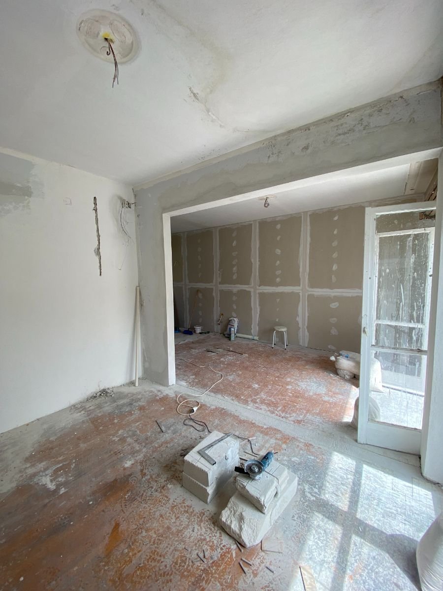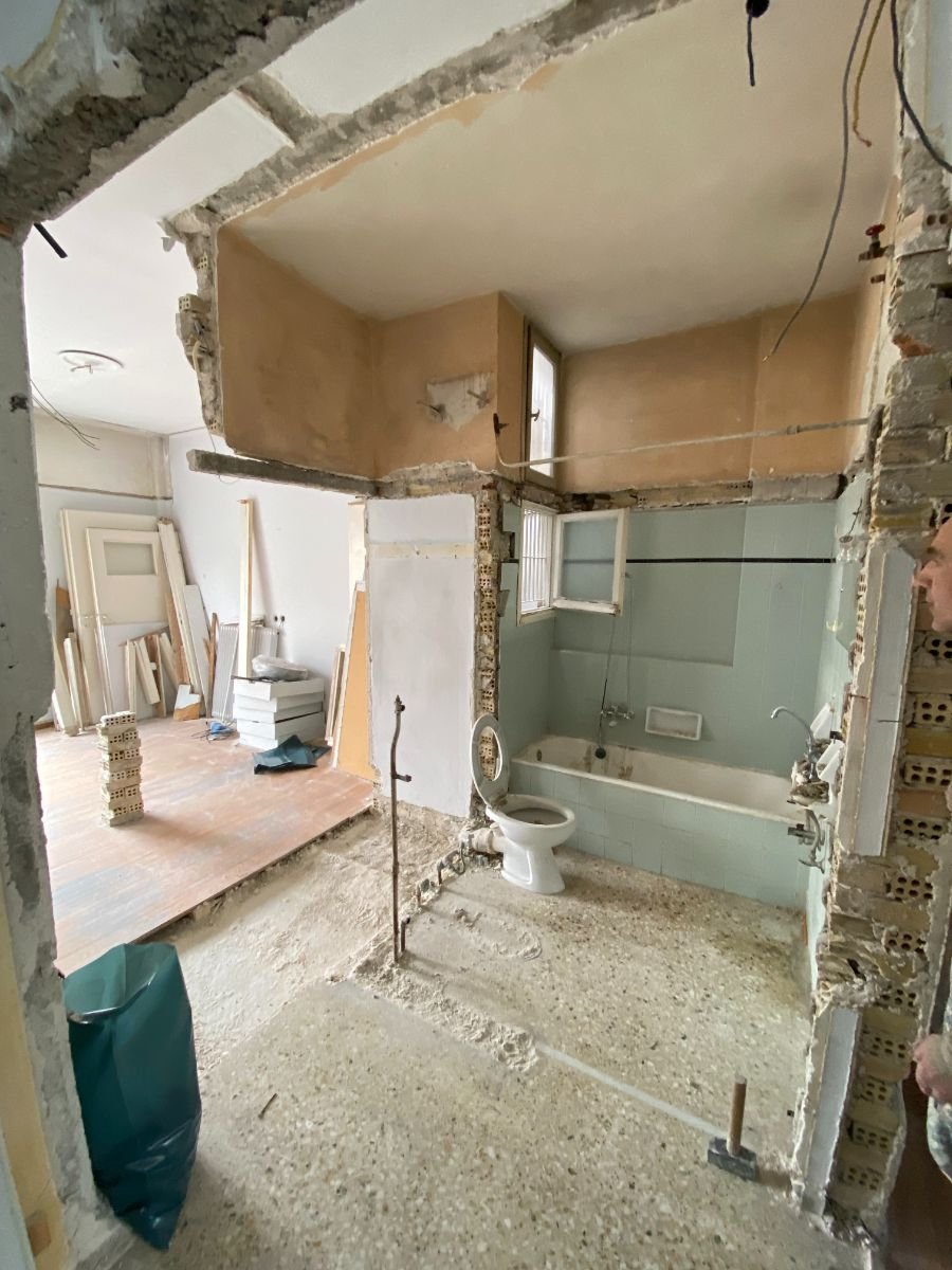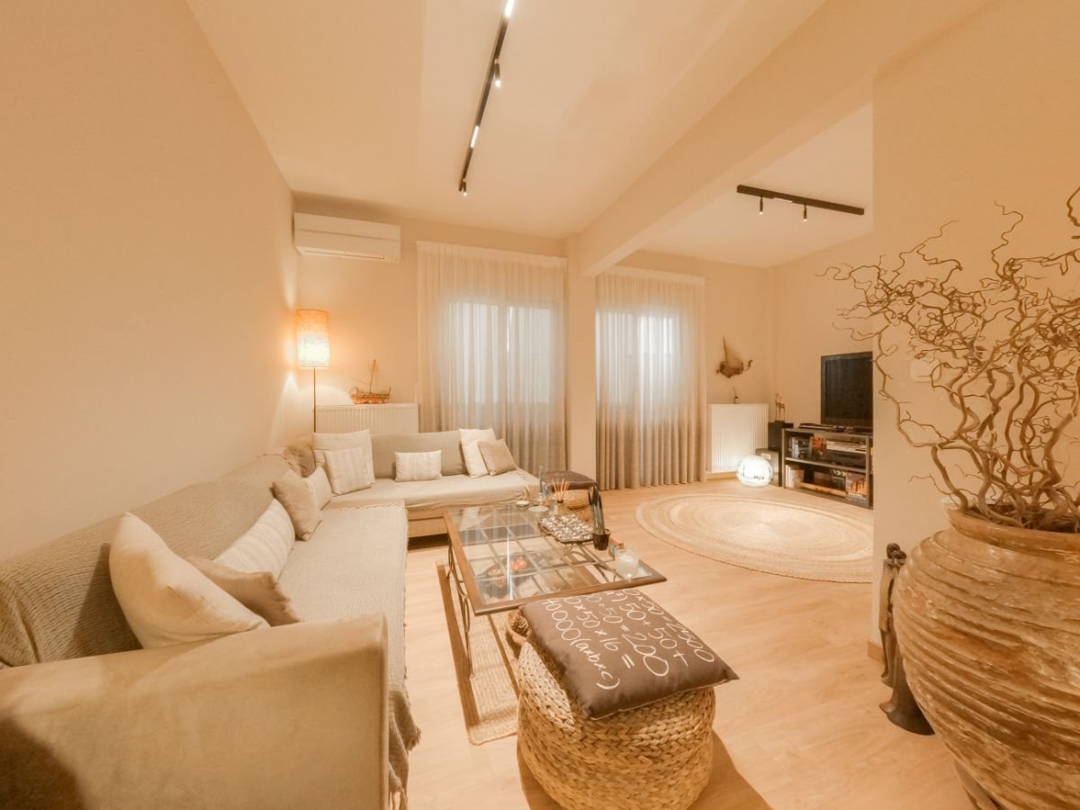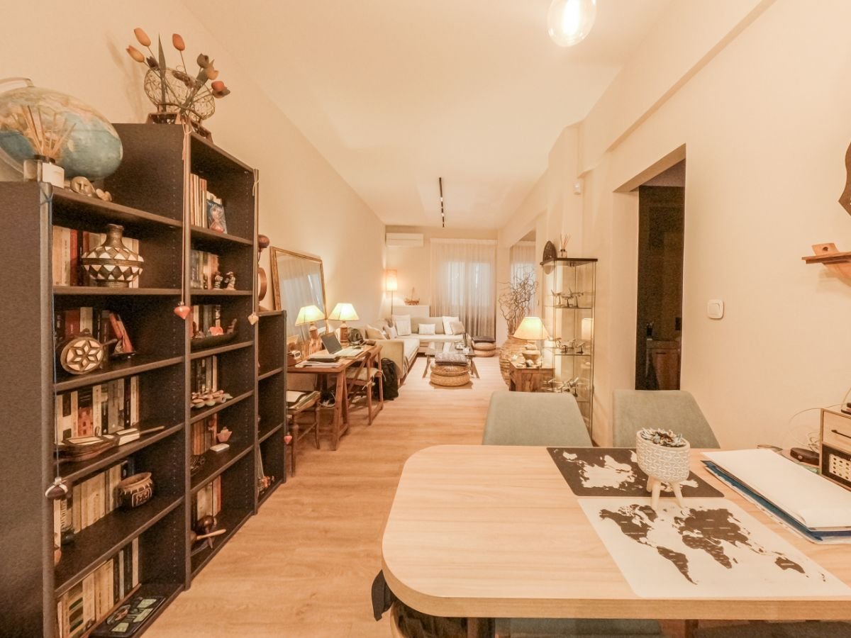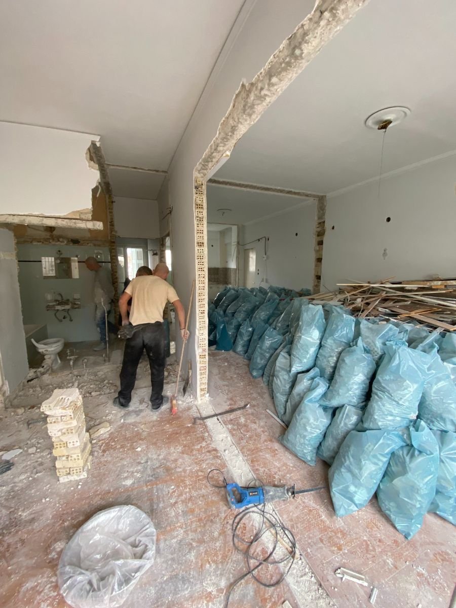 Αρχικά η ανακαίνιση σπιτιού ξεκίνησε με τις αποξηλώσεις και τα διάφορα γκρεμίσματα και χτισίματα τοίχων έτσι ώστε να δώσουμε στο διαμέρισμα τη δομή που μελετήσαμε αρχιτεκτονικά. Κατασκευάστηκαν νέες υδραυλικές και ηλεκτρολογικές εγκαταστάσεις και δημιουργήθηκαν νέες σωληνώσεις θέρμανσης με σώματα καλοριφέρ τον έλεγχο των οποίων τον έχει μία αντλία θερμότητας της εταιρείας LG, η οποία συνδυάζεται με έναν ηλιακό θερμοσίφωνα στην ταράτσα. Στα πατώματα τοποθετήθηκε βινυλικό δάπεδο της εταιρείας Tarkett, ενώ άλλαξαν τα εξωτερικά κουφώματα με ενεργειακά κουφώματα αλουμινίου.