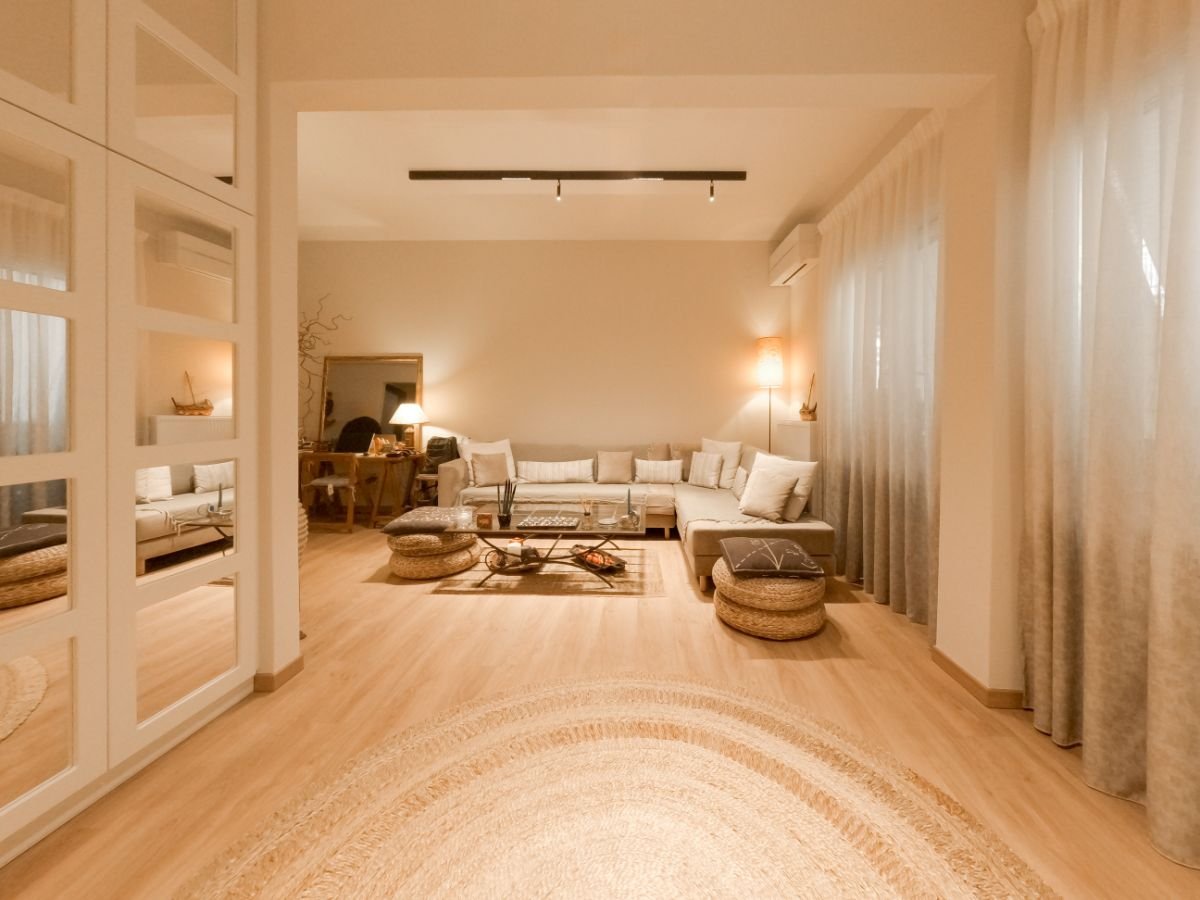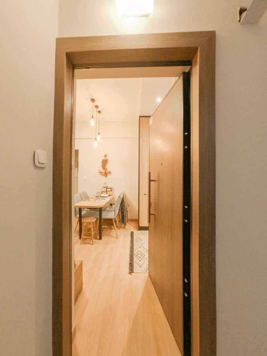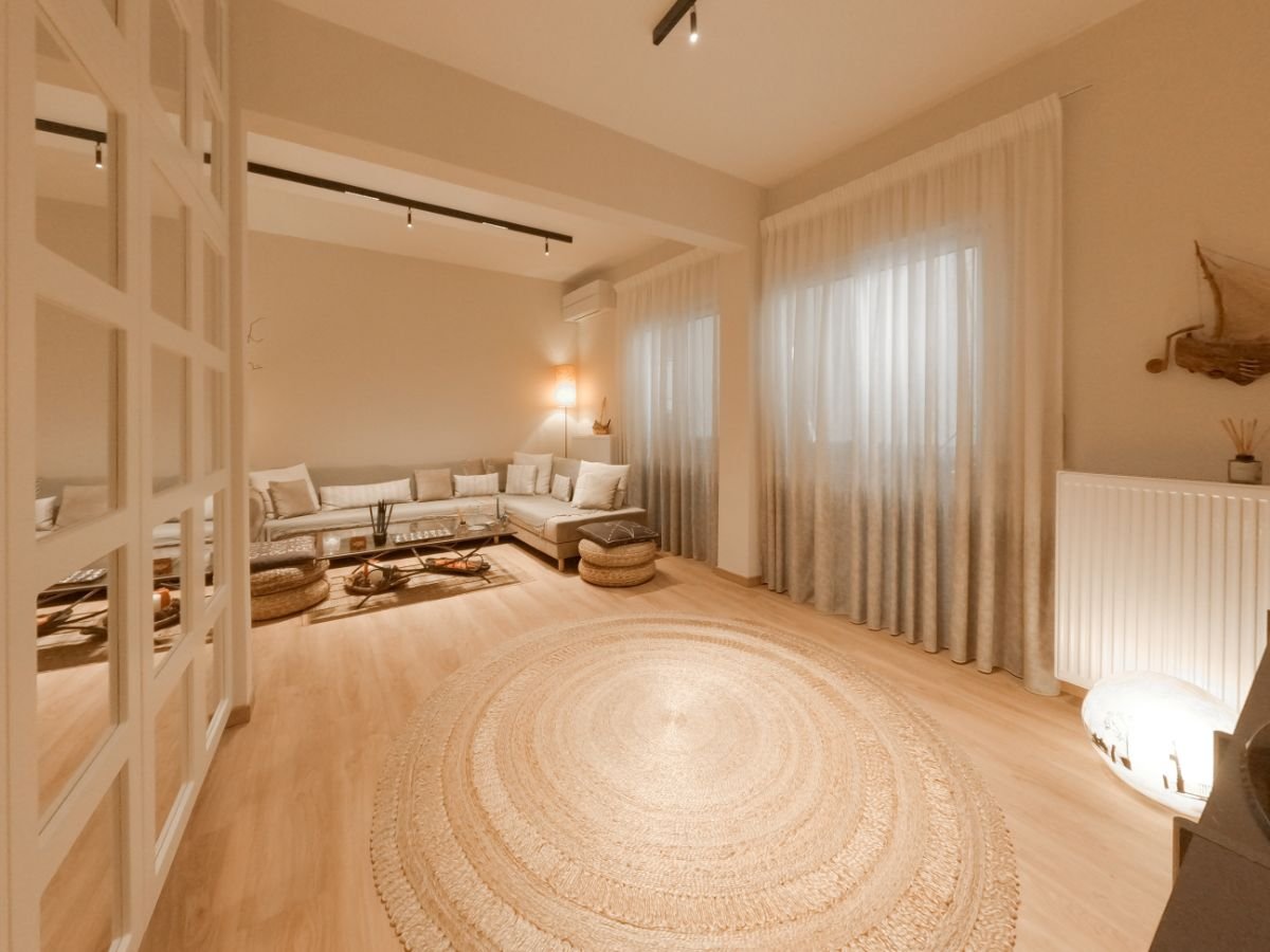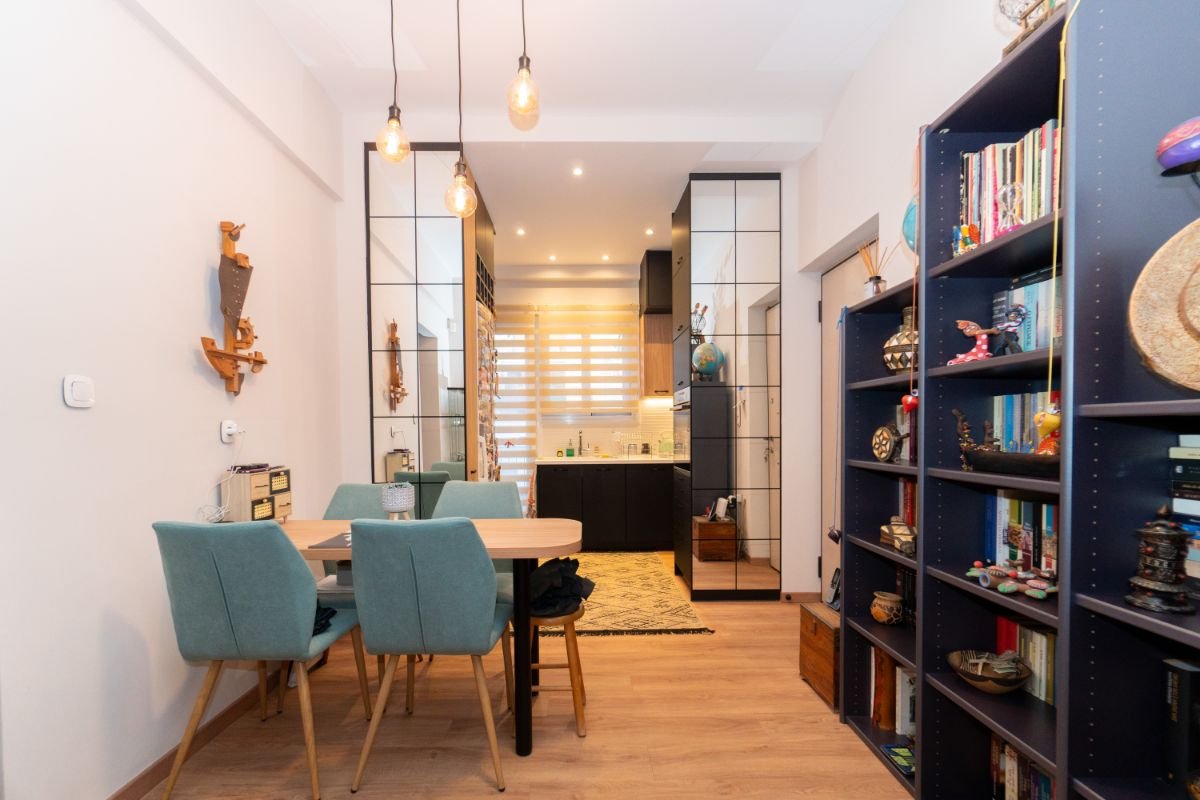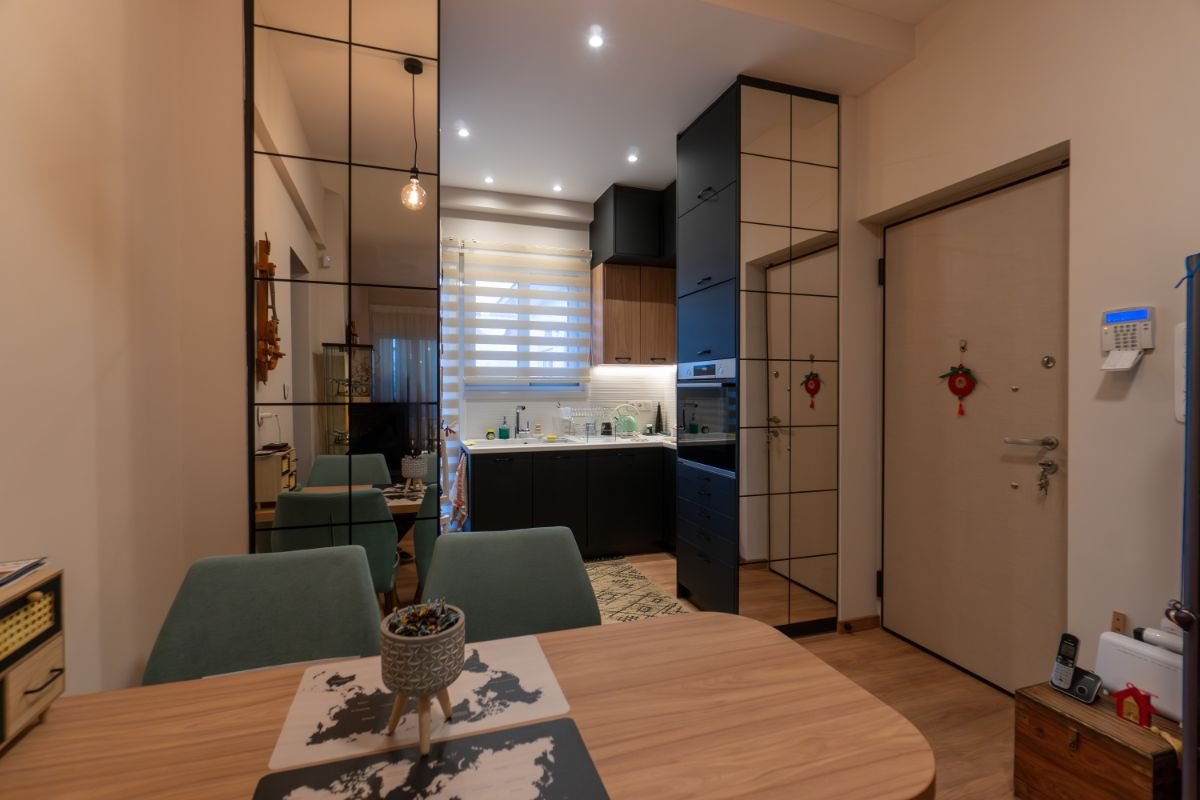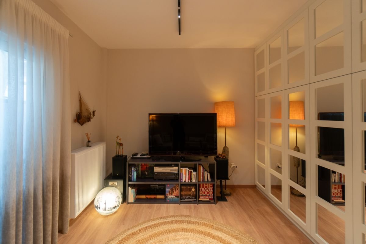 Με αυτόν τον τρόπο το διαμέρισμα αναβαθμίστηκε ενεργειακά και αυτό φάνηκε και στην πράξη σε μεγάλο βαθμό. Οι εσωτερικές πόρτες αντικαταστάθηκαν με νέες πόρτες Laminate και οι ντουλάπες έγιναν συρόμενες και λεπτομέρειες από καθρέπτες. Το μπάνιο μεταμορφώθηκε σε ένα πολύ λειτουργικό μπάνιο με πλακάκια σε γήινες αποχρώσεις. Η εξωτερική πόρτα εισόδου αντικαταστάθηκε με μία θωρακισμένη πόρτα και το διαμέρισμα χρωματίστηκε σε αποχρώσεις που δένουν με το υπόλοιπο σύνολο.