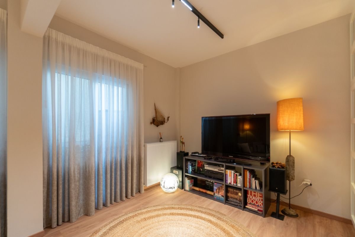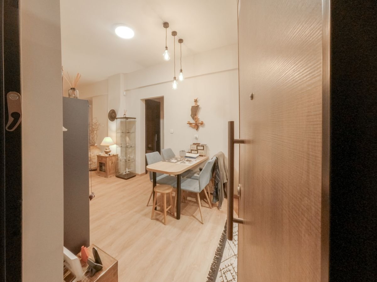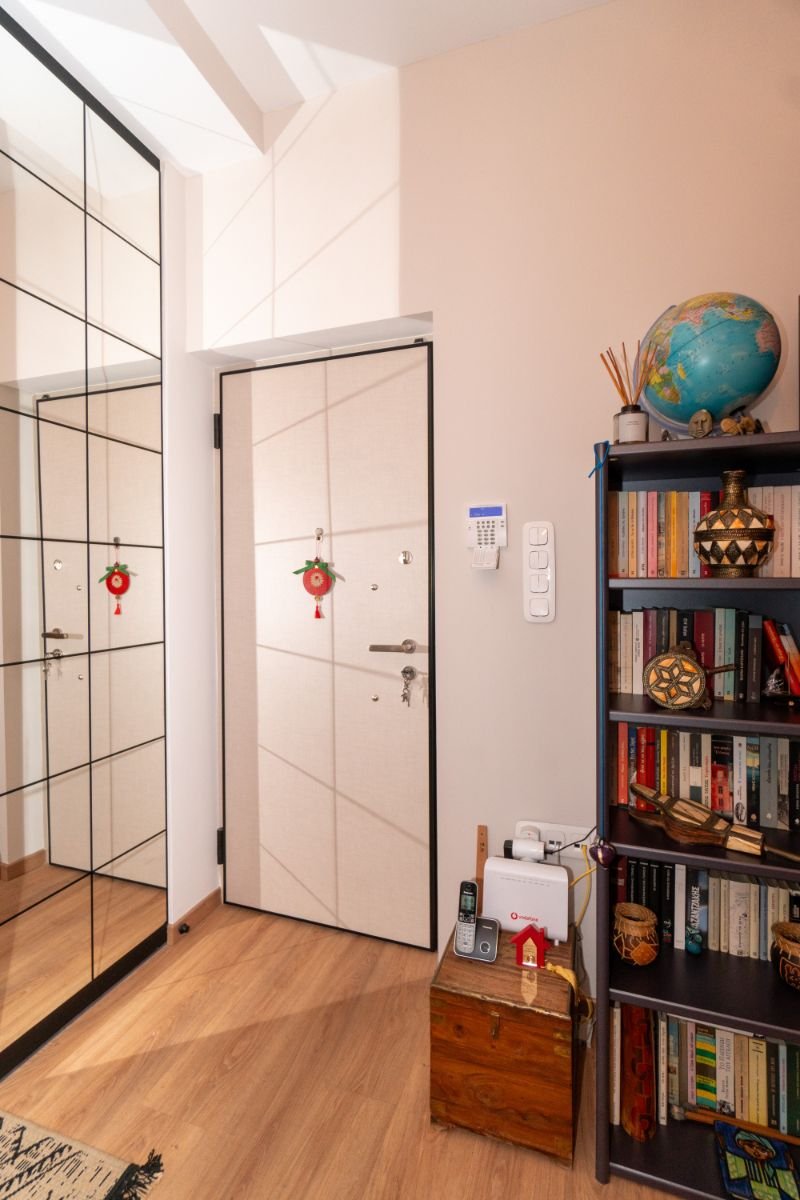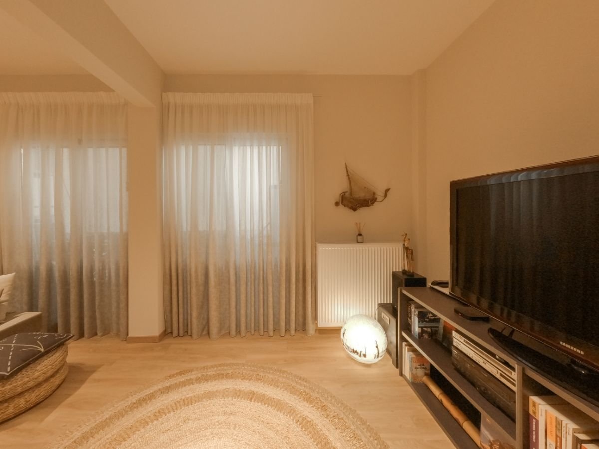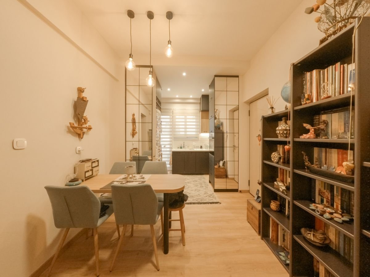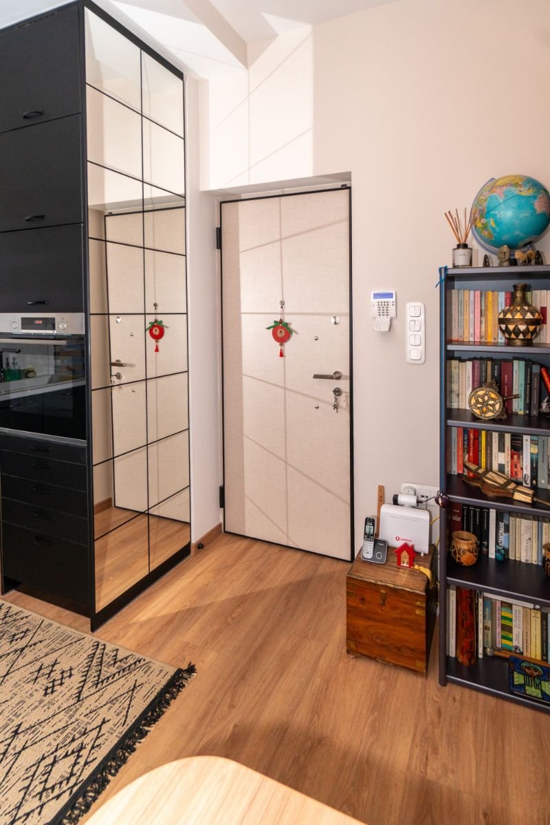 Με αυτόν τον τρόπο το διαμέρισμα αναβαθμίστηκε ενεργειακά και αυτό φάνηκε και στην πράξη σε μεγάλο βαθμό. Οι εσωτερικές πόρτες αντικαταστάθηκαν με νέες πόρτες Laminate και οι ντουλάπες έγιναν συρόμενες και λεπτομέρειες από καθρέπτες. Το μπάνιο μεταμορφώθηκε σε ένα πολύ λειτουργικό μπάνιο με πλακάκια σε γήινες αποχρώσεις. Η εξωτερική πόρτα εισόδου αντικαταστάθηκε με μία θωρακισμένη πόρτα και το διαμέρισμα χρωματίστηκε σε αποχρώσεις που δένουν με το υπόλοιπο σύνολο.