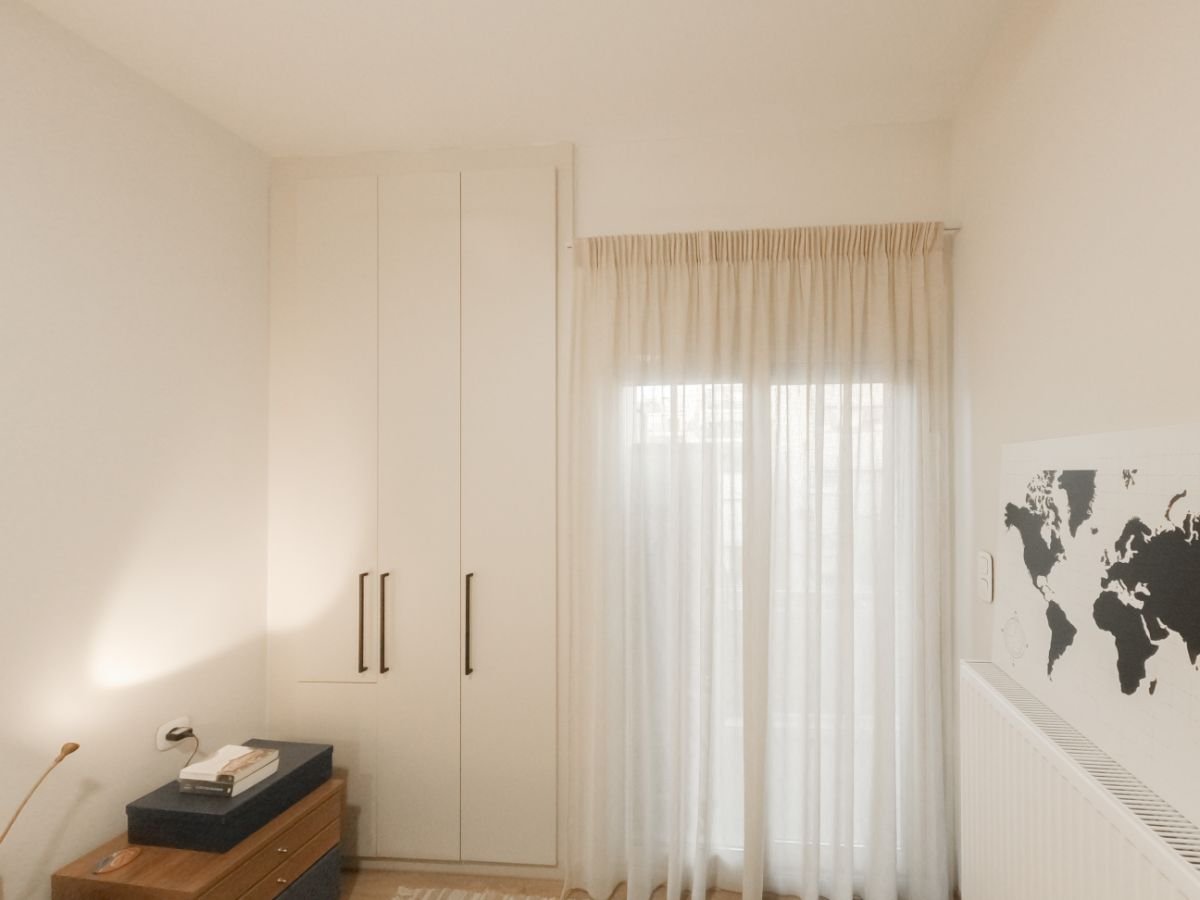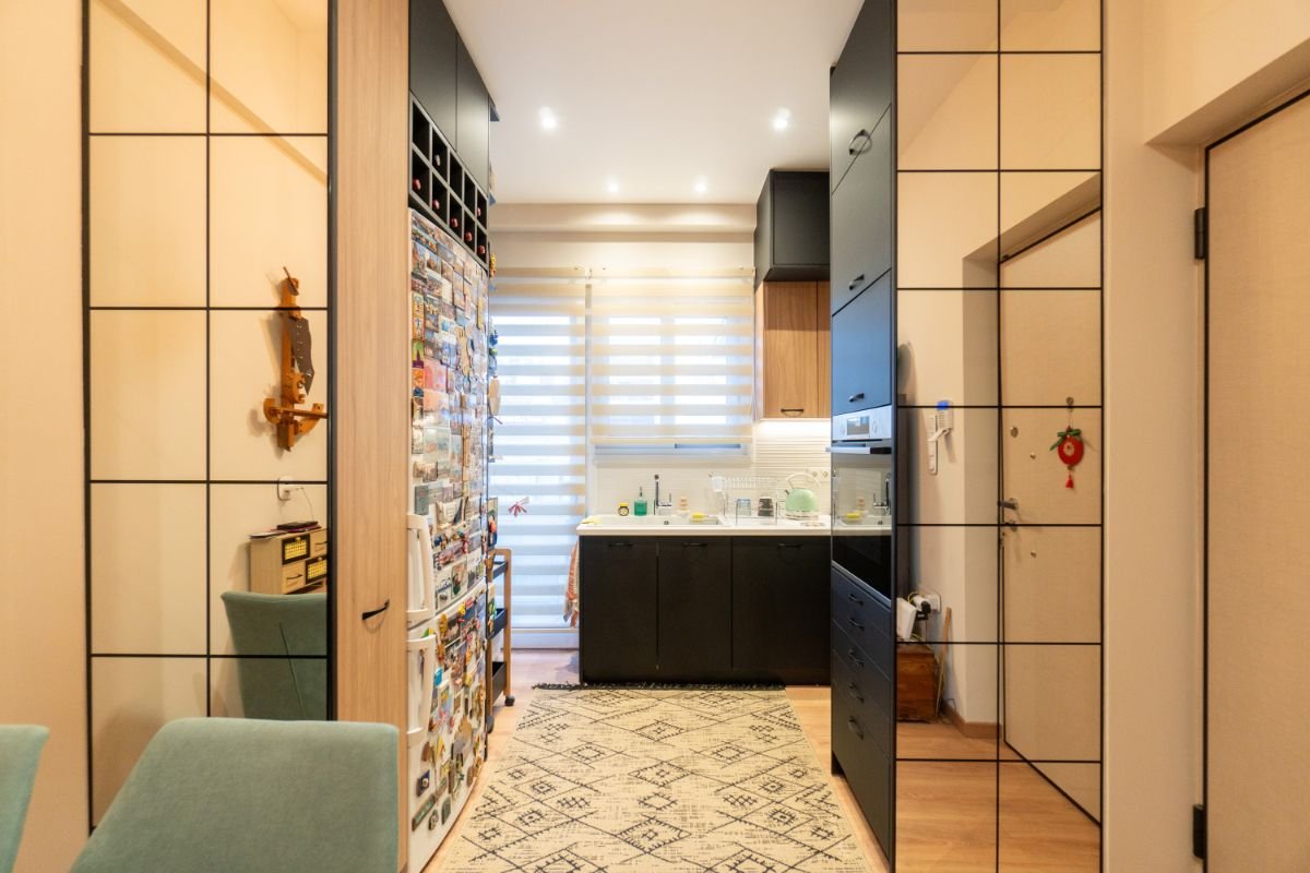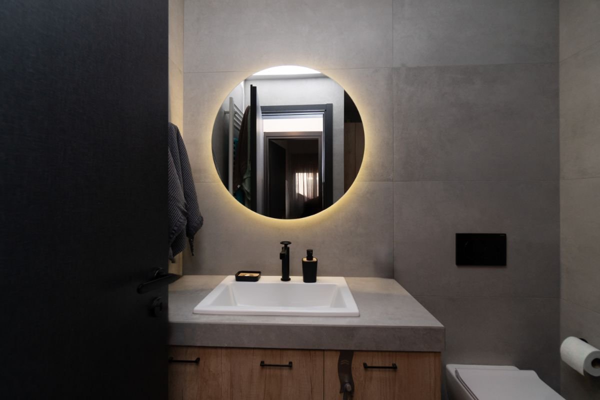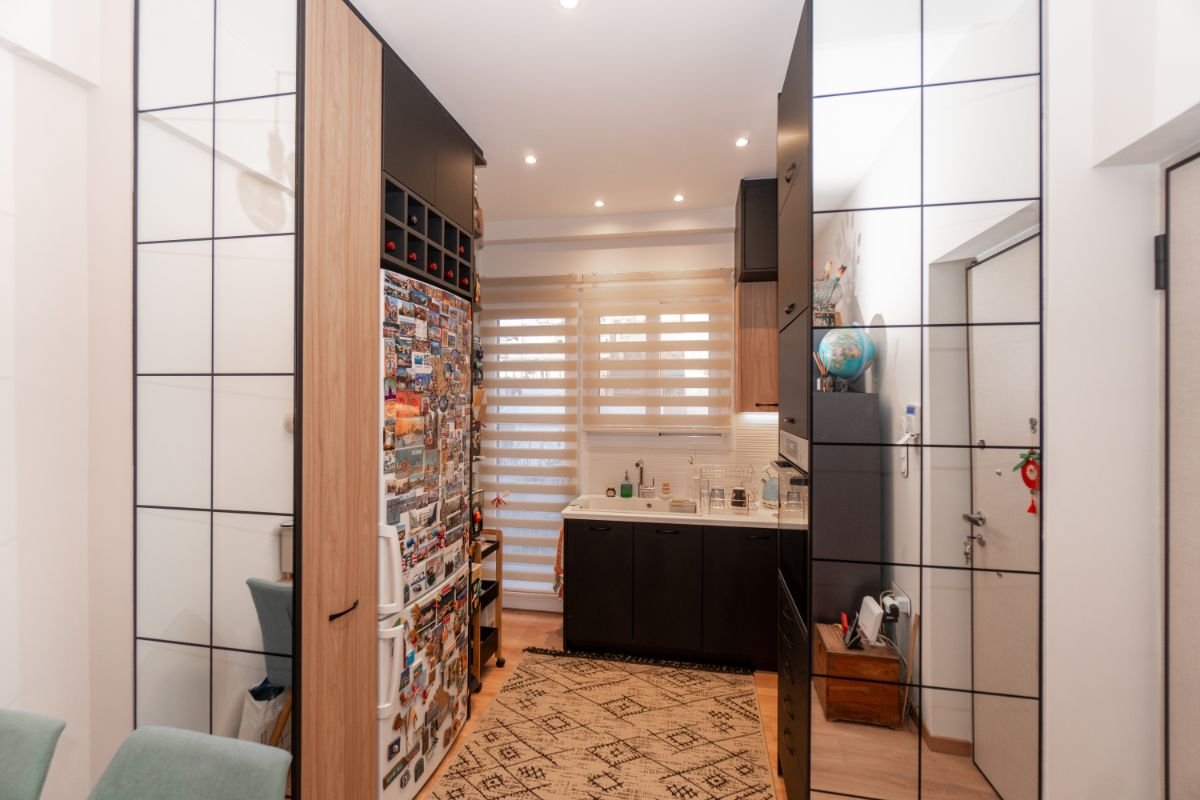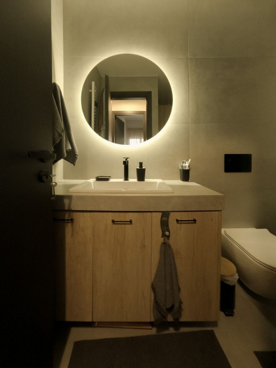 Με αυτόν τον τρόπο το διαμέρισμα αναβαθμίστηκε ενεργειακά και αυτό φάνηκε και στην πράξη σε μεγάλο βαθμό. Οι εσωτερικές πόρτες αντικαταστάθηκαν με νέες πόρτες Laminate και οι ντουλάπες έγιναν συρόμενες και λεπτομέρειες από καθρέπτες. Το μπάνιο μεταμορφώθηκε σε ένα πολύ λειτουργικό μπάνιο με πλακάκια σε γήινες αποχρώσεις. Η εξωτερική πόρτα εισόδου αντικαταστάθηκε με μία θωρακισμένη πόρτα και το διαμέρισμα χρωματίστηκε σε αποχρώσεις που δένουν με το υπόλοιπο σύνολο.