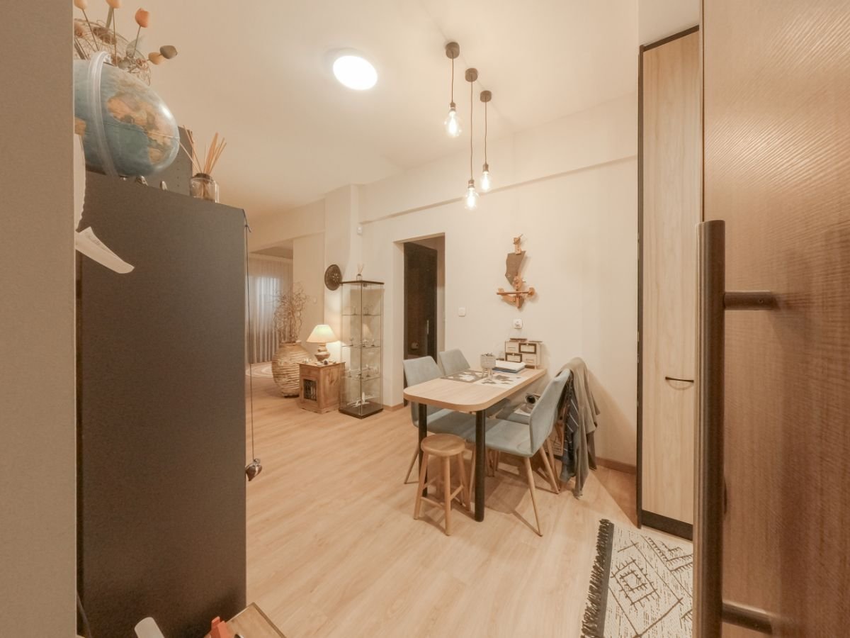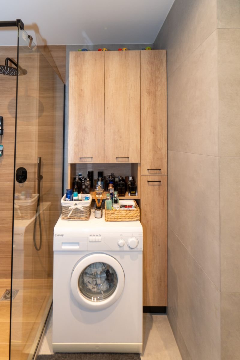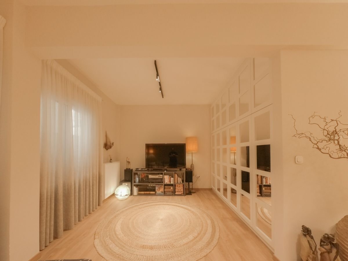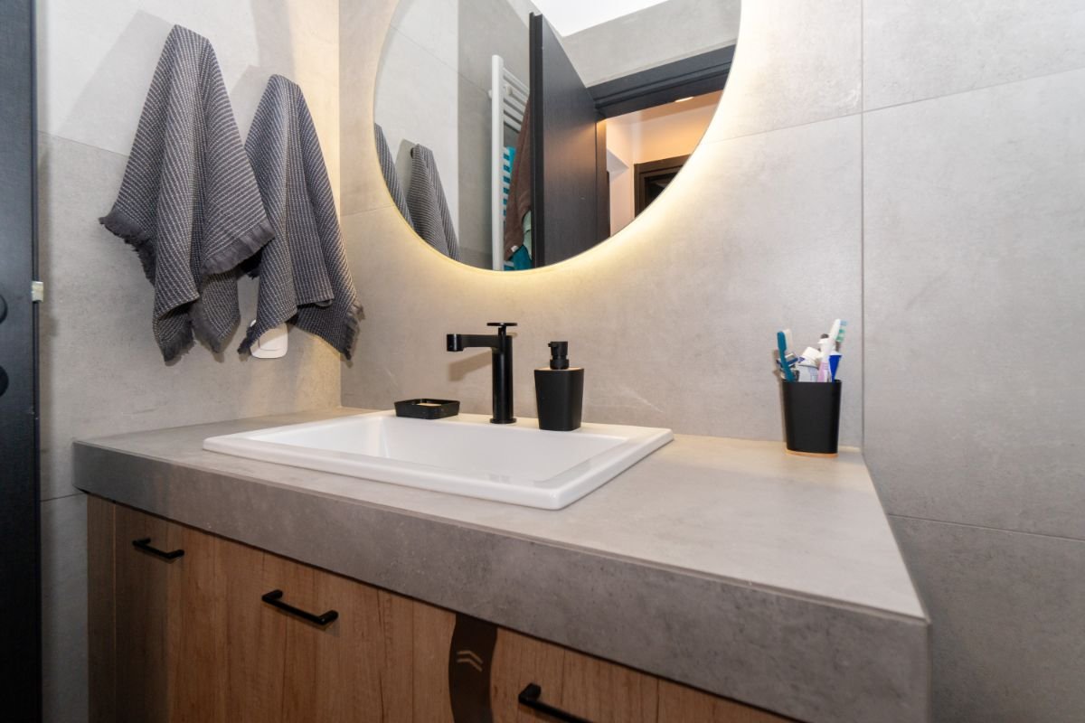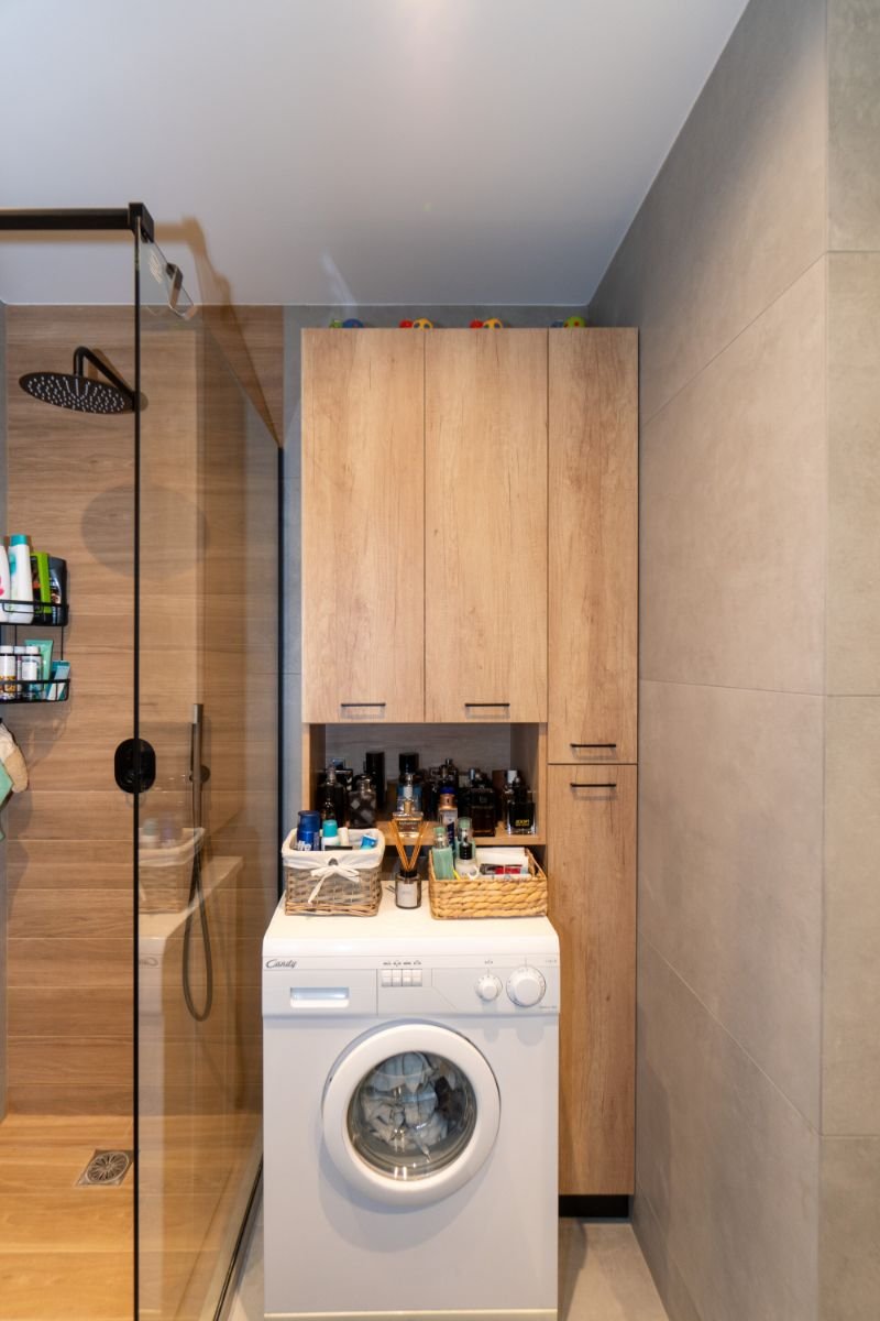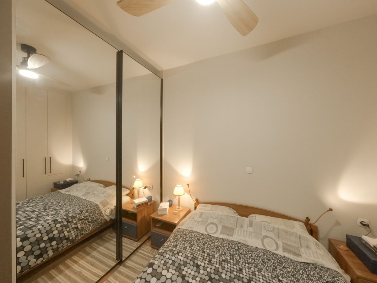 Με αυτόν τον τρόπο το διαμέρισμα αναβαθμίστηκε ενεργειακά και αυτό φάνηκε και στην πράξη σε μεγάλο βαθμό. Οι εσωτερικές πόρτες αντικαταστάθηκαν με νέες πόρτες Laminate και οι ντουλάπες έγιναν συρόμενες και λεπτομέρειες από καθρέπτες. Το μπάνιο μεταμορφώθηκε σε ένα πολύ λειτουργικό μπάνιο με πλακάκια σε γήινες αποχρώσεις. Η εξωτερική πόρτα εισόδου αντικαταστάθηκε με μία θωρακισμένη πόρτα και το διαμέρισμα χρωματίστηκε σε αποχρώσεις που δένουν με το υπόλοιπο σύνολο.