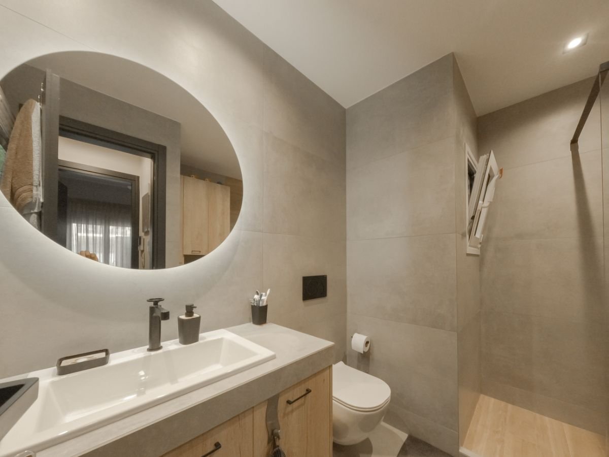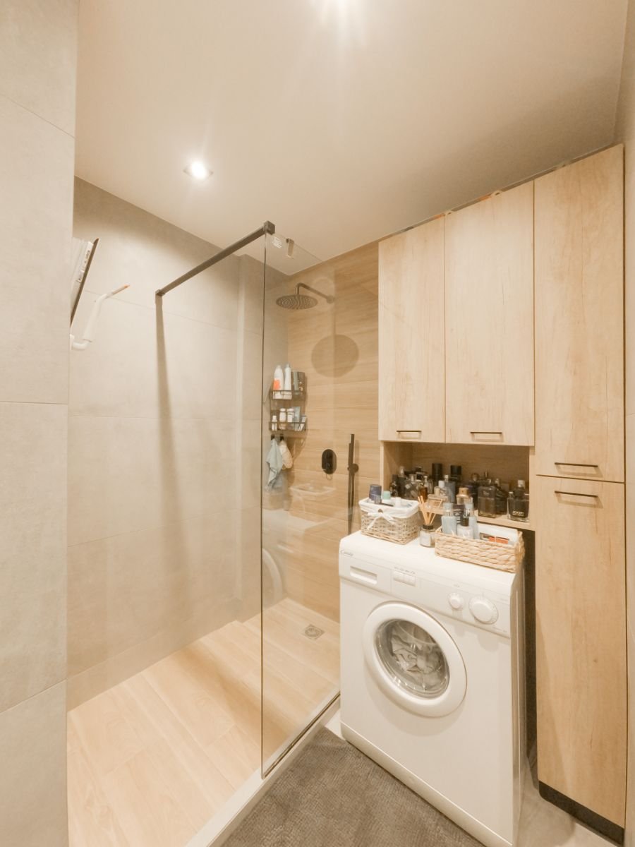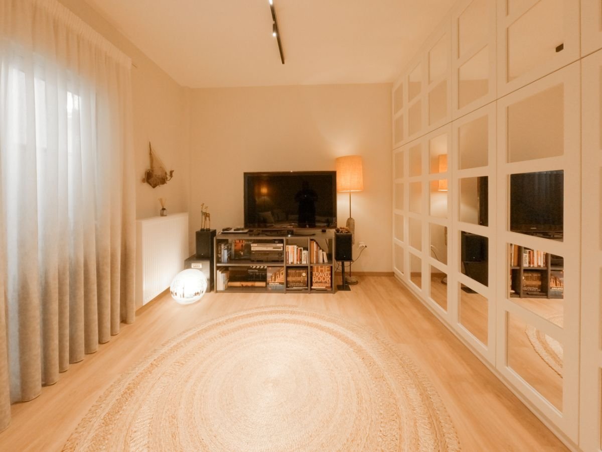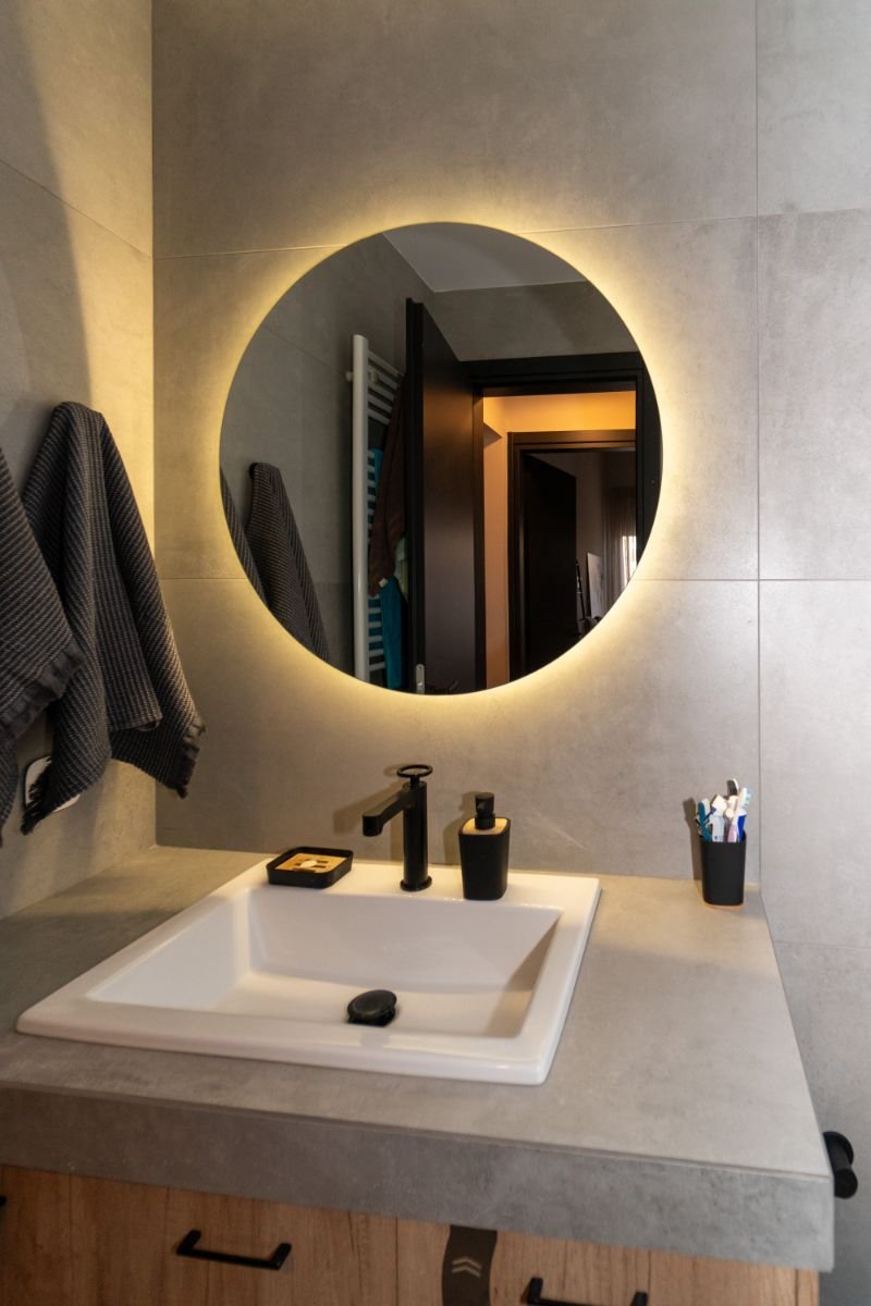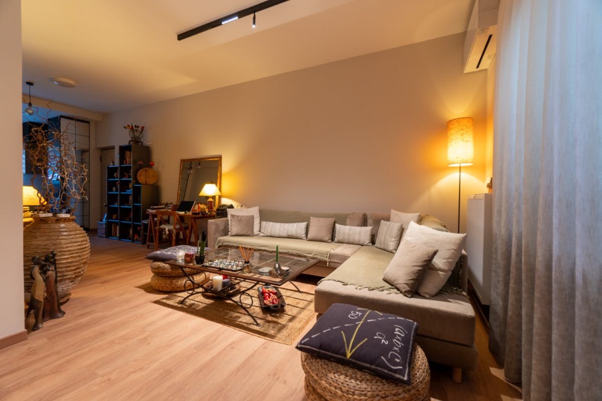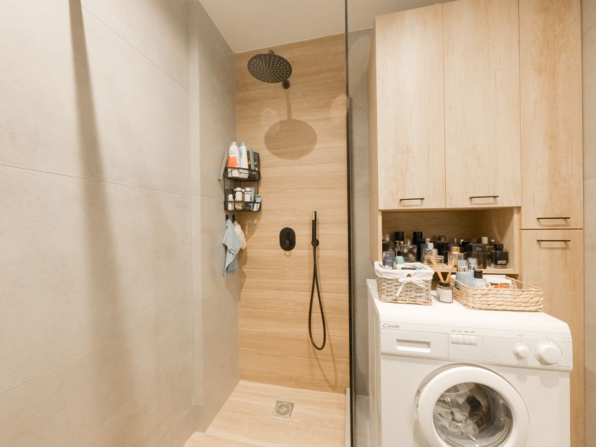 Με αυτόν τον τρόπο το διαμέρισμα αναβαθμίστηκε ενεργειακά και αυτό φάνηκε και στην πράξη σε μεγάλο βαθμό. Οι εσωτερικές πόρτες αντικαταστάθηκαν με νέες πόρτες Laminate και οι ντουλάπες έγιναν συρόμενες και λεπτομέρειες από καθρέπτες. Το μπάνιο μεταμορφώθηκε σε ένα πολύ λειτουργικό μπάνιο με πλακάκια σε γήινες αποχρώσεις. Η εξωτερική πόρτα εισόδου αντικαταστάθηκε με μία θωρακισμένη πόρτα και το διαμέρισμα χρωματίστηκε σε αποχρώσεις που δένουν με το υπόλοιπο σύνολο.