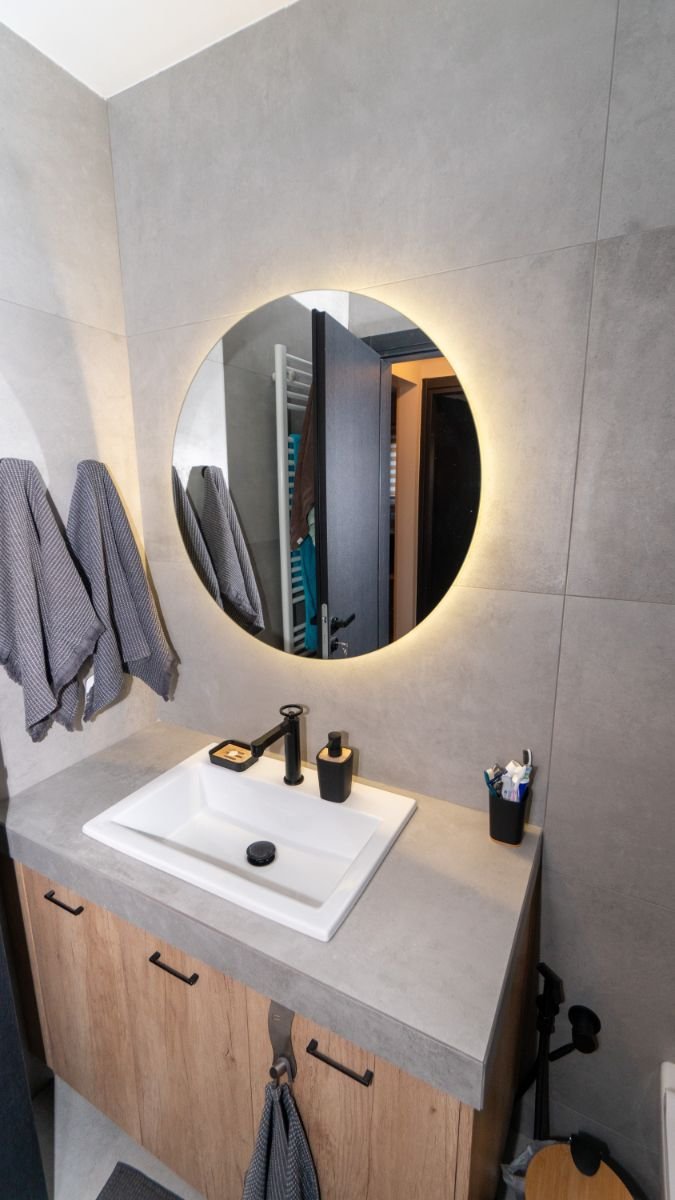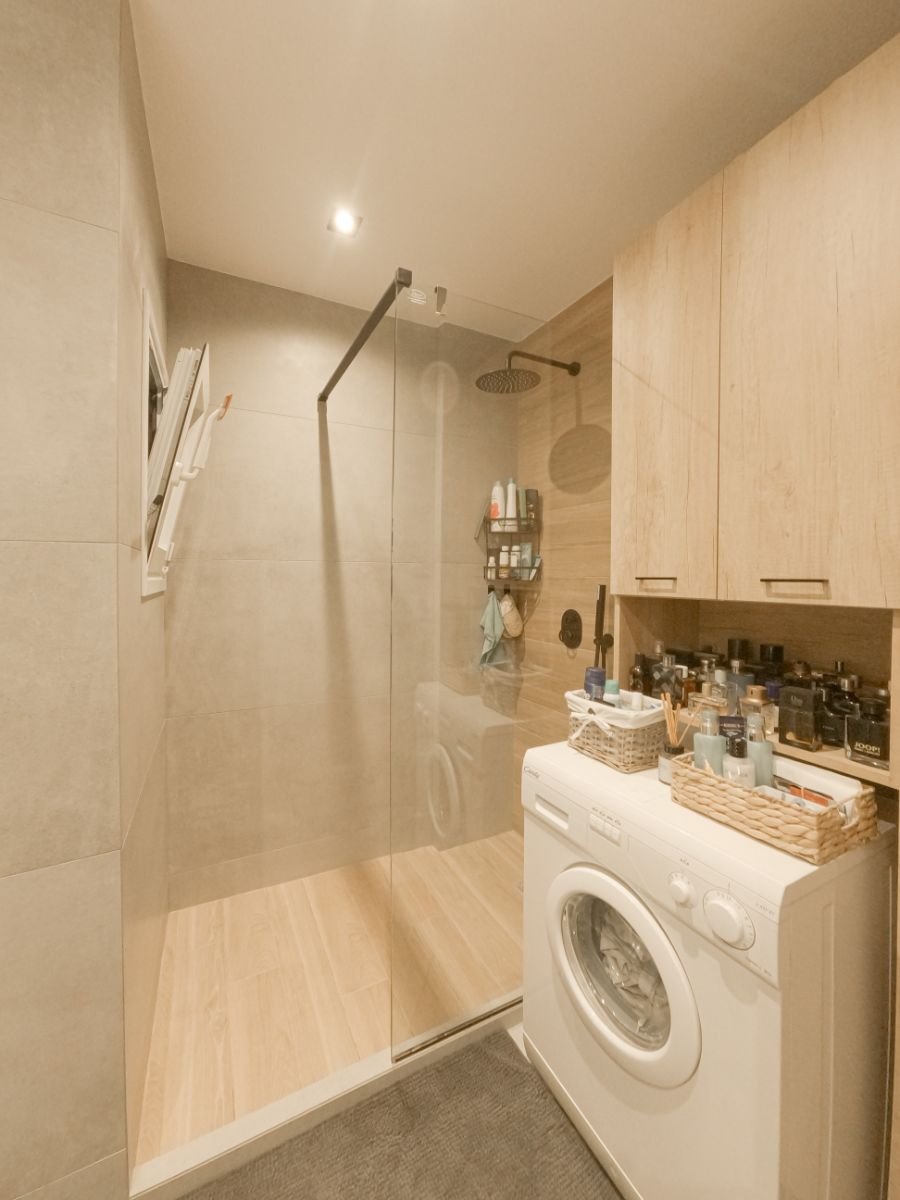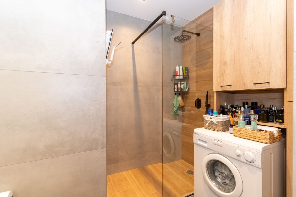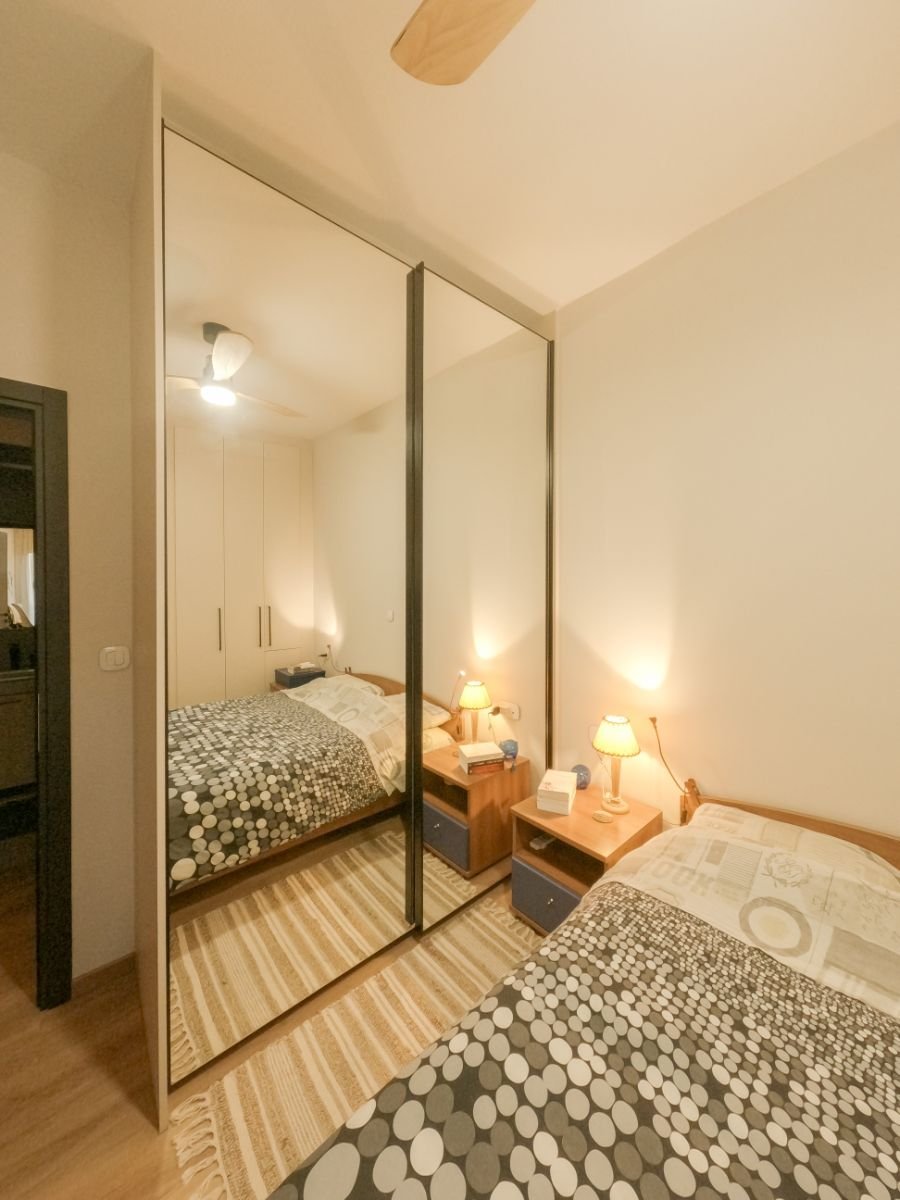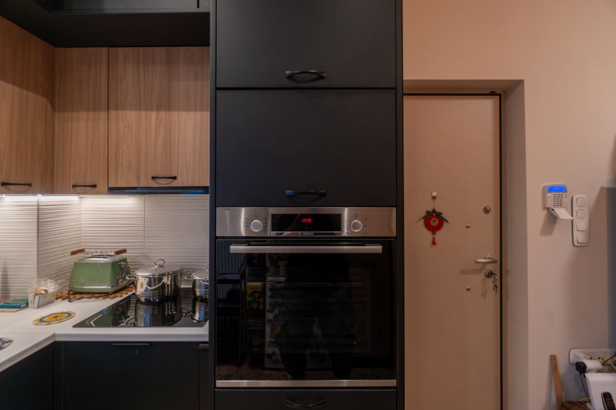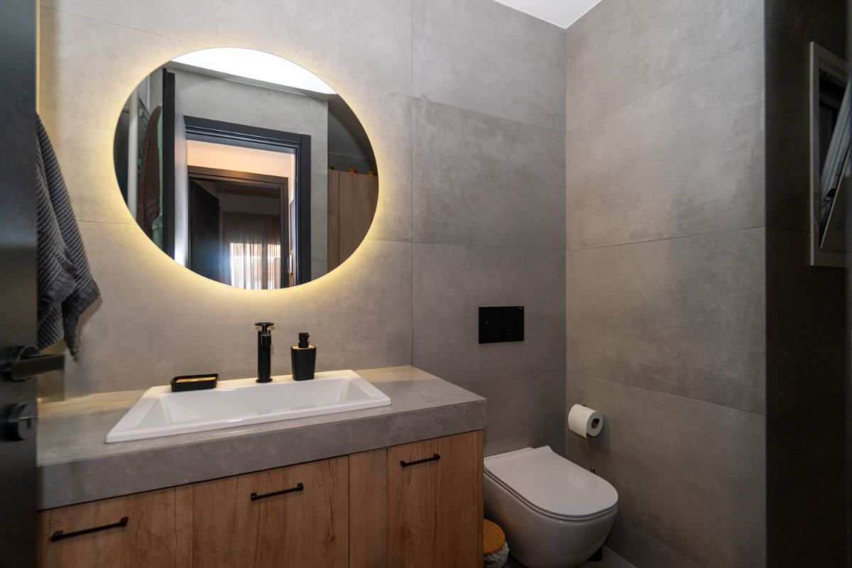 Με αυτόν τον τρόπο το διαμέρισμα αναβαθμίστηκε ενεργειακά και αυτό φάνηκε και στην πράξη σε μεγάλο βαθμό. Οι εσωτερικές πόρτες αντικαταστάθηκαν με νέες πόρτες Laminate και οι ντουλάπες έγιναν συρόμενες και λεπτομέρειες από καθρέπτες. Το μπάνιο μεταμορφώθηκε σε ένα πολύ λειτουργικό μπάνιο με πλακάκια σε γήινες αποχρώσεις. Η εξωτερική πόρτα εισόδου αντικαταστάθηκε με μία θωρακισμένη πόρτα και το διαμέρισμα χρωματίστηκε σε αποχρώσεις που δένουν με το υπόλοιπο σύνολο.