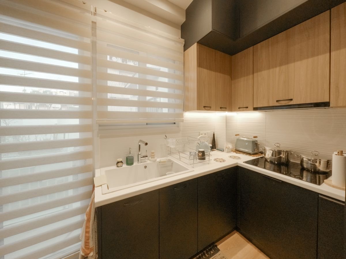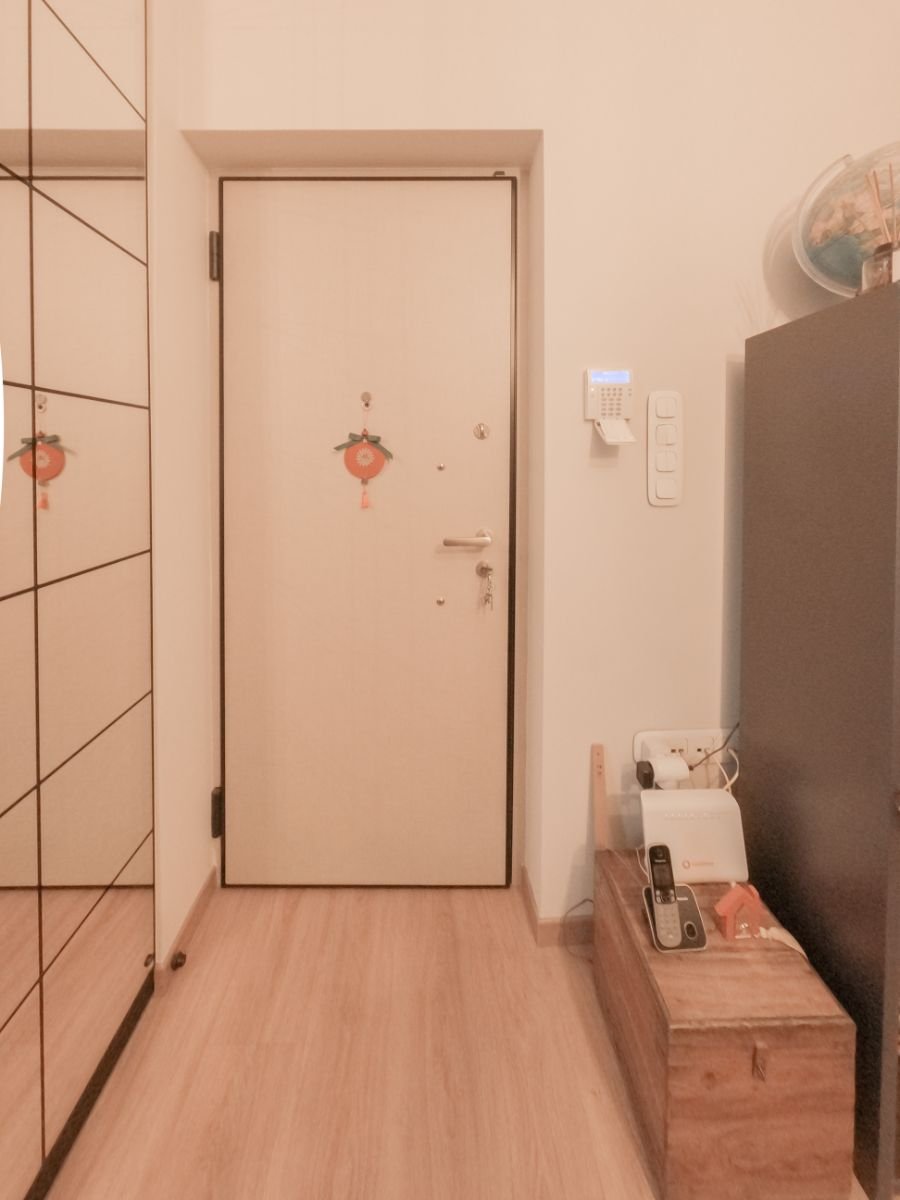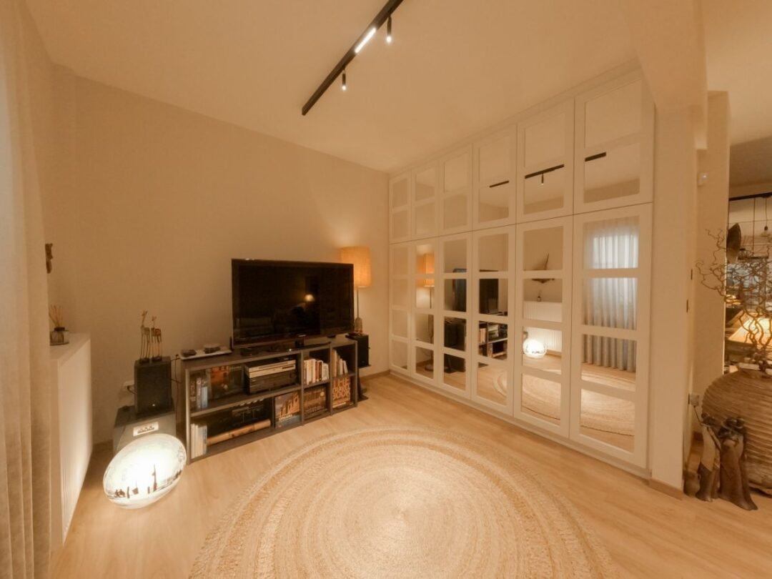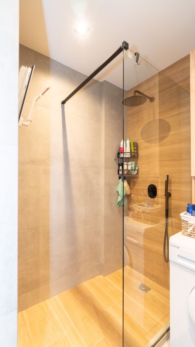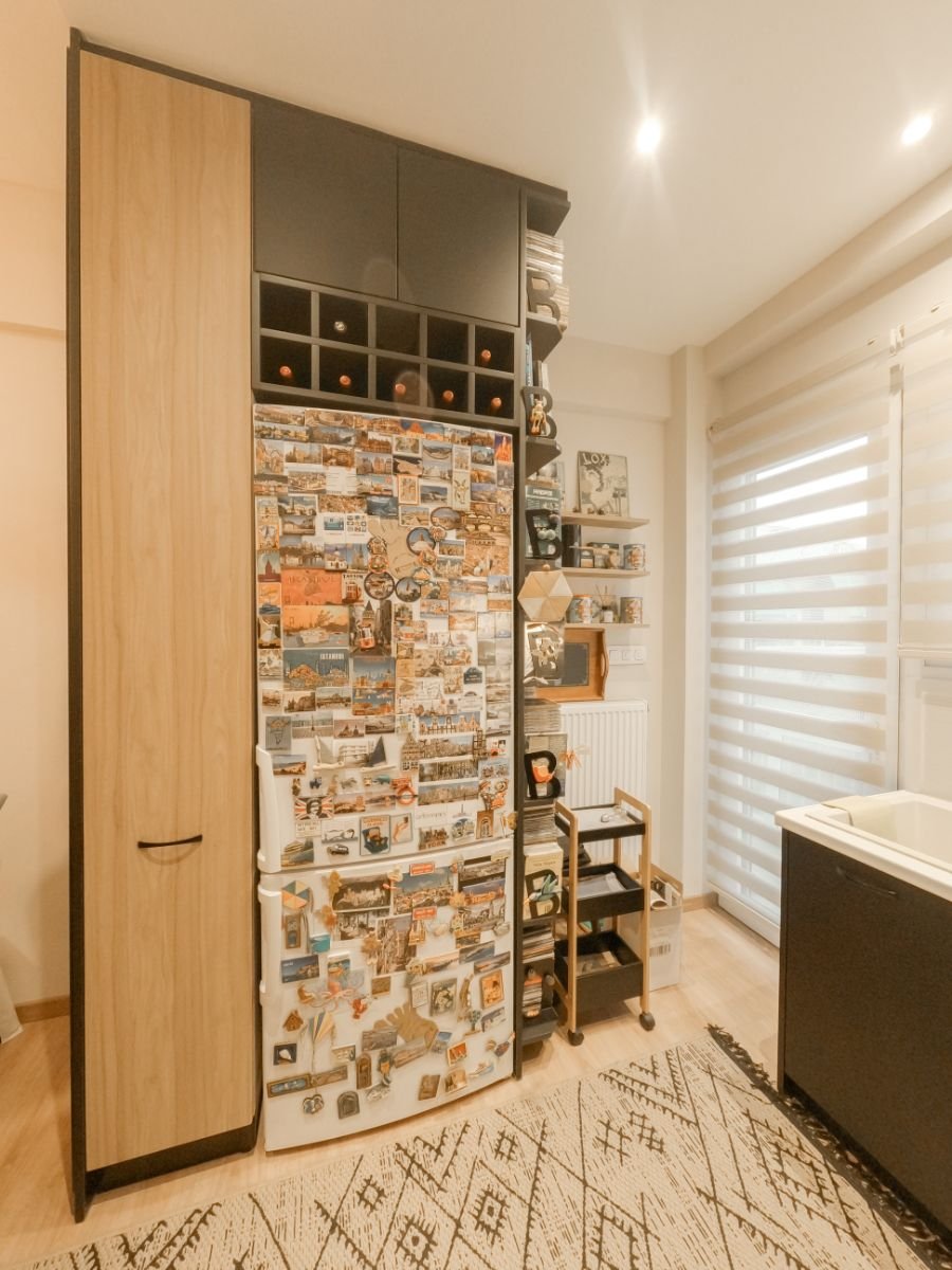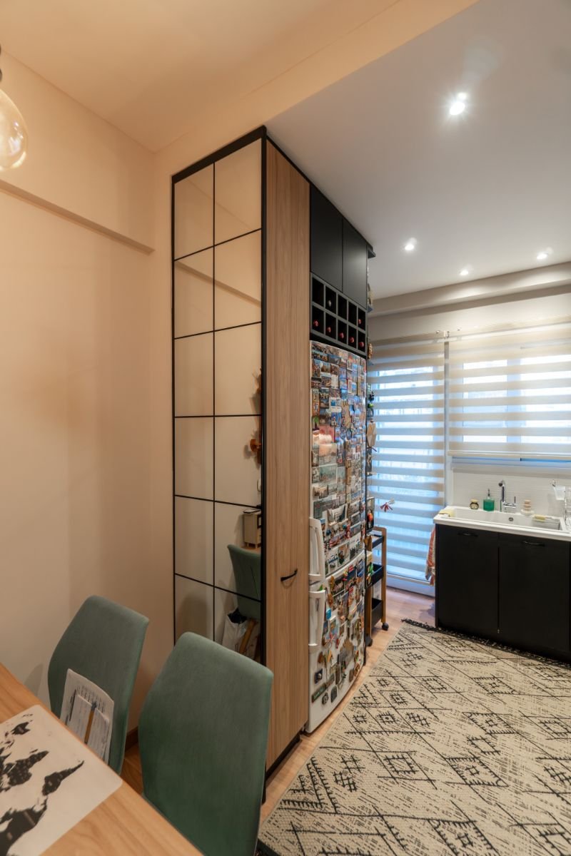 Με αυτόν τον τρόπο το διαμέρισμα αναβαθμίστηκε ενεργειακά και αυτό φάνηκε και στην πράξη σε μεγάλο βαθμό. Οι εσωτερικές πόρτες αντικαταστάθηκαν με νέες πόρτες Laminate και οι ντουλάπες έγιναν συρόμενες και λεπτομέρειες από καθρέπτες. Το μπάνιο μεταμορφώθηκε σε ένα πολύ λειτουργικό μπάνιο με πλακάκια σε γήινες αποχρώσεις. Η εξωτερική πόρτα εισόδου αντικαταστάθηκε με μία θωρακισμένη πόρτα και το διαμέρισμα χρωματίστηκε σε αποχρώσεις που δένουν με το υπόλοιπο σύνολο.