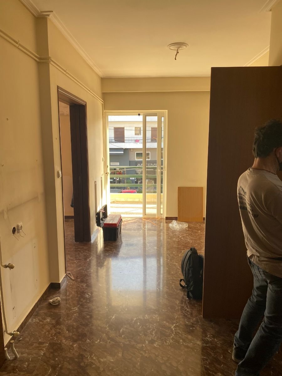 Στα δάπεδα τοποθετήθηκε ένα ιδιαίτερο πλακάκι μεγάλης διάστασης που δίνει μία πολυτέλεια στο διαμέρισμα. Η μία πόρτα εισόδου κλείστηκε και τοποθετήθηκε μία πλέον πόρτα ασφαλείας. Οι εσωτερικές πόρτες και οι ντουλάπες αντικαταστάθηκαν με νέες. Τέλος η ανακαίνιση σπιτιού ολοκληρώθηκε με τους τελικούς χρωματισμούς σε όμορφες αποχρώσεις.