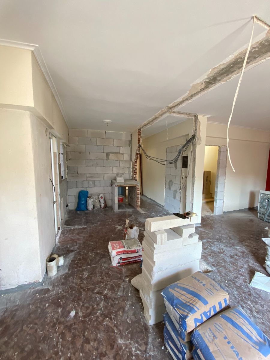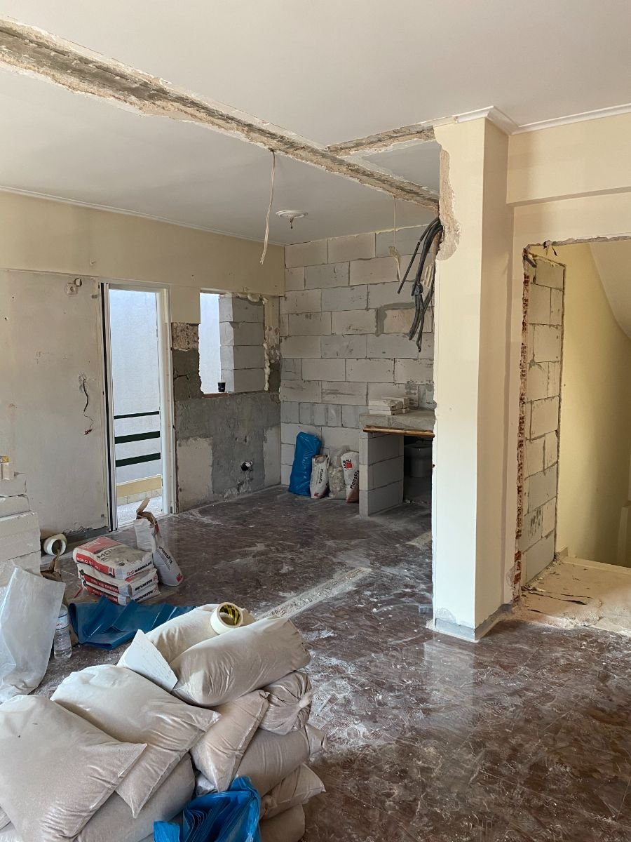 Αρχικά γκρεμίστηκαν κάποιοι τοίχοι και χτίστηκαν κάποιοι νέοι, έτσι ώστε να μεταφερθεί η κουζίνα σε άλλη θέση και να ενοποιηθεί με το σαλόνι. Επίσης έγινε μία μετατροπή και στο μπάνιο καθώς και στη δημιουργία μίας εσοχής για το πλυντήριο των ρούχων. Η κουζίνα μεταμορφώθηκε και έγινε με πάσο και πλέον είναι πολύ όμορφη και λειτουργική. Το μπάνιο δημιουργήθηκε με πλακάκια σε γήινες αποχρώσεις καθώς τοποθετήθηκαν και εντοιχισμοί.