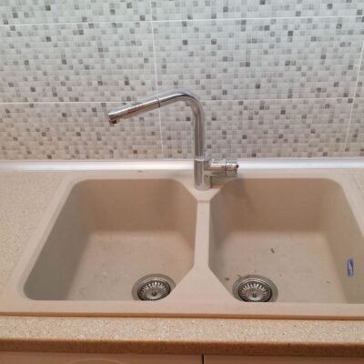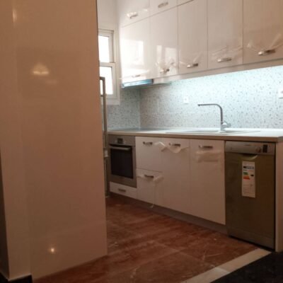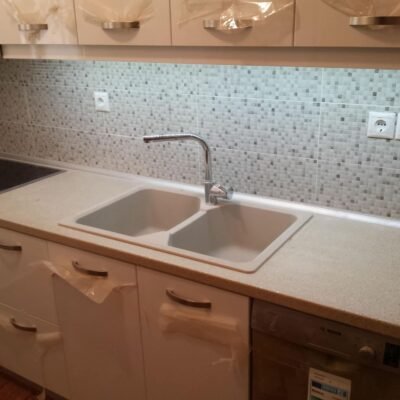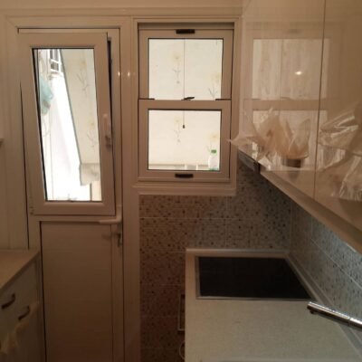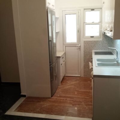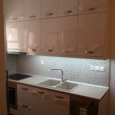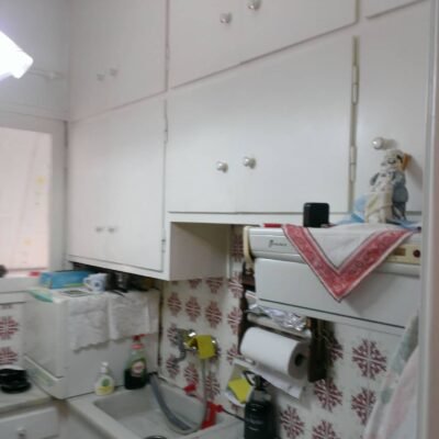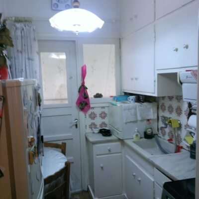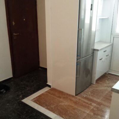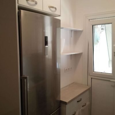 Κατά την επίσκεψη μας στο διαμέρισμα της Καλλιθέας διαπιστώσαμε ότι η κουζίνα ήταν πολύ παλαιά και δεν ήταν λειτουργική. Ειδικότερα η ανακαίνιση κουζίνας περιελάμβανε τις ακόλουθες εργασίες. Γκρεμιστήκαν κάποιοι τοίχοι και έγινε αντικατάσταση της παλαιάς κουζίνας με νέα σε λευκούς χρωματισμούς. Χρειάστηκε μια επιπλέον σειρά κρεμαστών ντουλαπιών για εξοικονόμηση χώρου. Η παλαιά πόρτα και το παράθυρο της κουζίνας καθώς επίσης και του μπάνιου αντικαταστάθηκαν με νέα κουφώματα αλουμινίου της εταιρείας alumil. Τέλος το σπίτι χρωματίστηκε με οικολογικά υλικά.