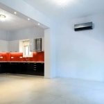 Οι αποχρώσεις της μεγάλης κουζίνας είναι δύο όμορφα γυαλιστερά χρώματα, το λευκό και το μαύρο. Στην πλάτη του πάγκου τοποθετήθηκε γυαλί ασφαλείας σε μία όμορφη κόκκινη απόχρωση και έδεσε αρμονικά με το υπόλοιπο σύνολο. Τα διαμερίσματα είχαν στα περισσότερα δάπεδα τους ξύλο, το οποίο αποξηλώθηκε και τοποθετήθηκε ένα όμορφο πλακάκι από γρανίτη σε μία μεγάλη διάσταση 1,20Χ60.