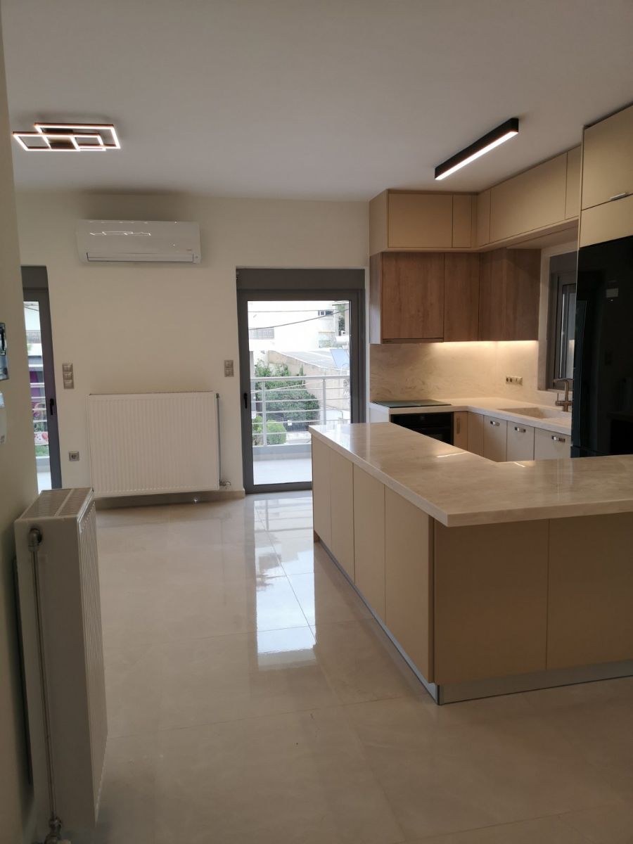 Η κουζίνα έγινε από βακελίτη και ο πάγκος και ο πλαινός τοίχος έγιναν από Corian σε μία όμορφη απόχρωση που δένει με όλο το σύνολο. Σε όλα τα δάπεδα και τα μπαλκόνια τοποθετήθηκαν πλακάκια από γρανίτη σε μεγάλη διάσταση. Οι ντουλάπες και οι εσωτερικές πόρτες αντικαταστάθηκαν με νέες, ενώ τοποθετήθηκαν και νέα ενεργειακά κουφώματα αλουμινίου. Το μπάνιο ανακαινίστηκε πλήρως και τοποθετήθηκε μία χτιστή ντουζιέρα και συστήματα εντοιχισμού. Το σπίτι εξοπλίστηκε με σύστημα συναγερμού και μία πόρτα ασφαλείας.