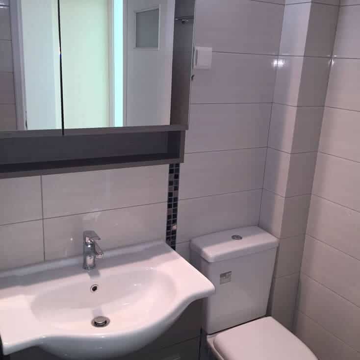 Αφού τελειώσαμε με την κουζίνα δε θα μπορούσαμε να αφήσουμε το παλαιό μπάνιο. Στο νέο ανακαινισμένο μπάνιο, η μπανιέρα αντικαταστάθηκε με ασύμμετρη ντουζιέρα και τοποθετήθηκε καμπίνα από κρύσταλλο ασφαλείας.