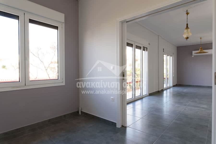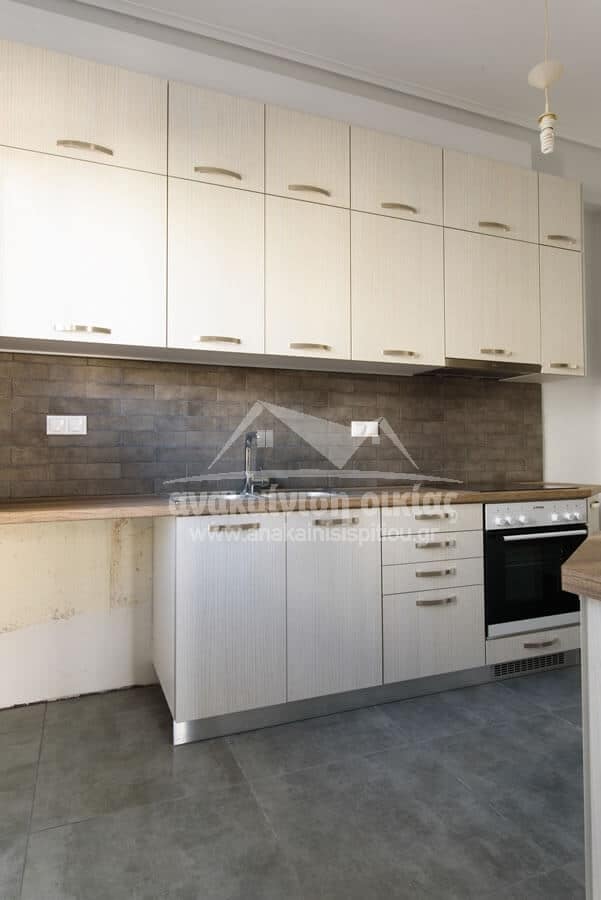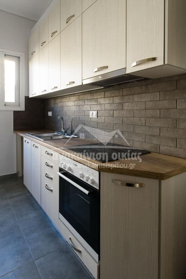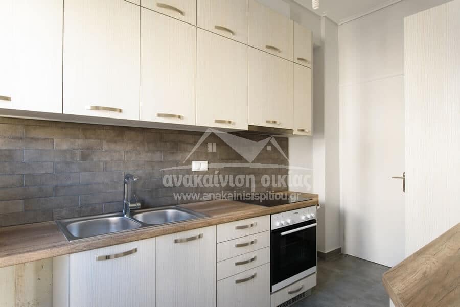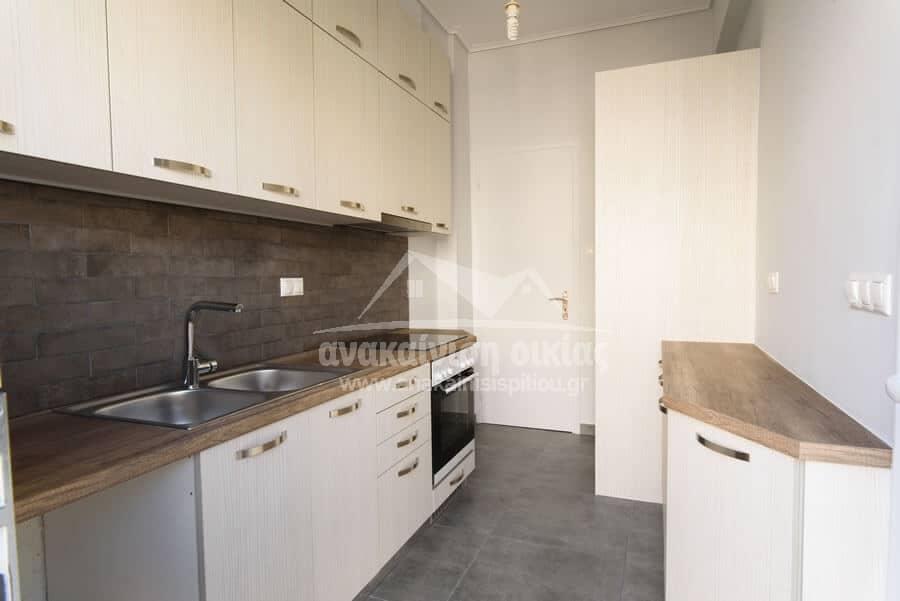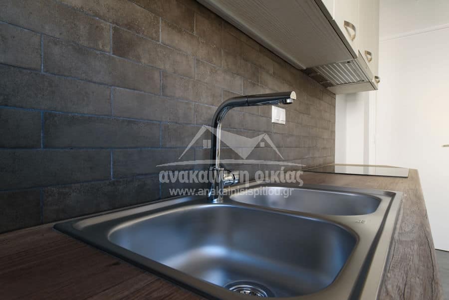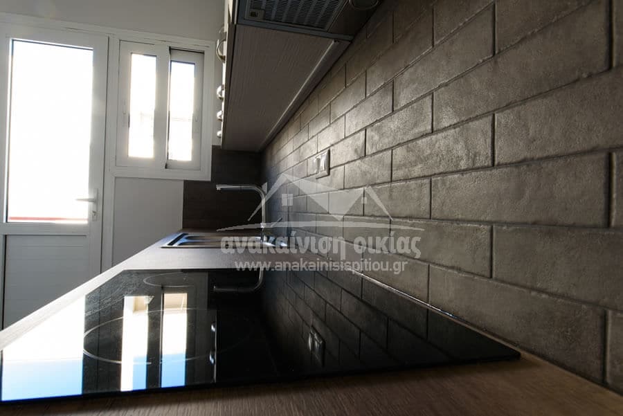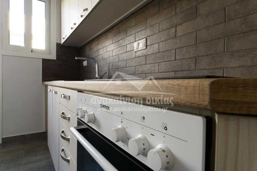 Η κουζίνα αντικαταστάθηκε με νέα σε γήινες αποχρώσεις και τοποθετήθηκαν ενεργειακά κουφώματα αλουμινίου της εταιρείας Alumil. Τα παλαιά πλακάκια αποξηλώθηκαν και τοποθετήθηκαν νέα σε μία όμορφη γκρι απόχρωση.
