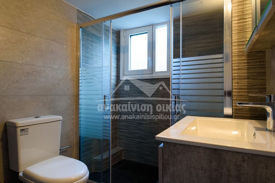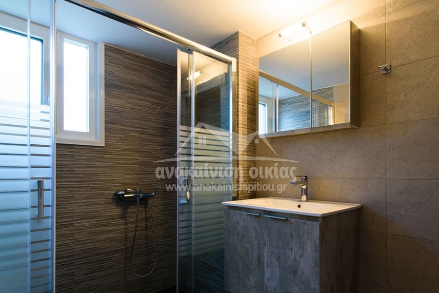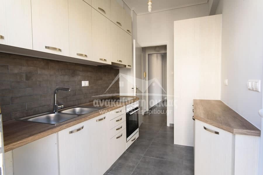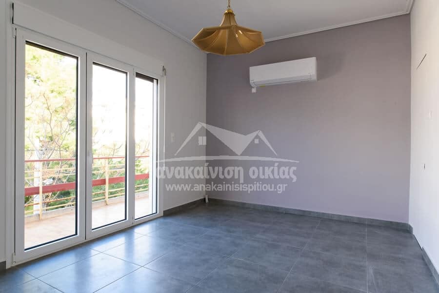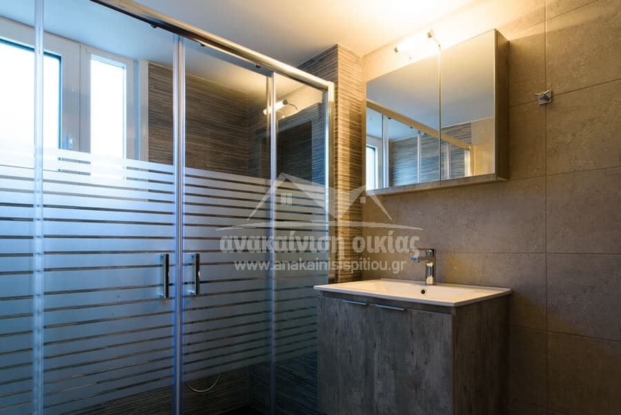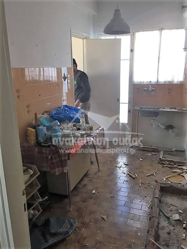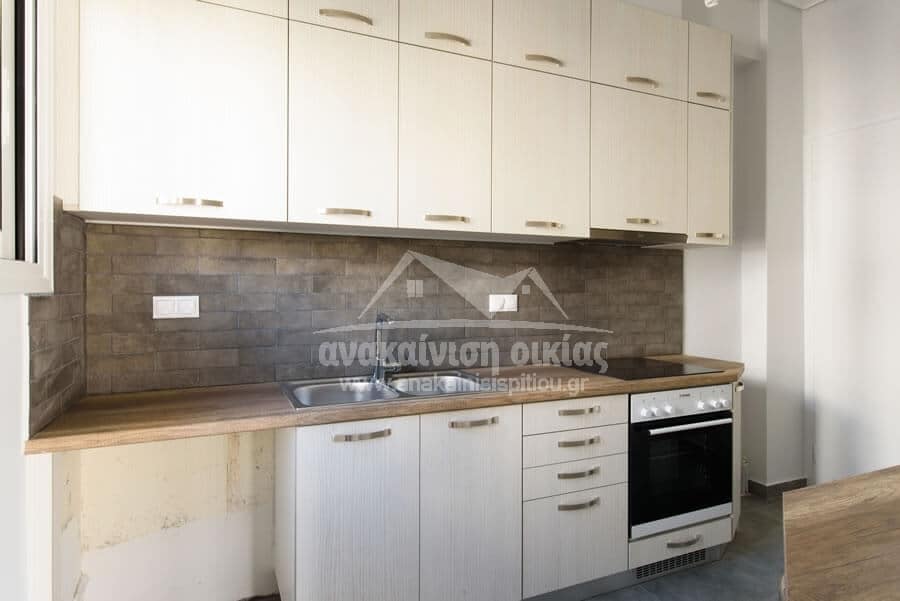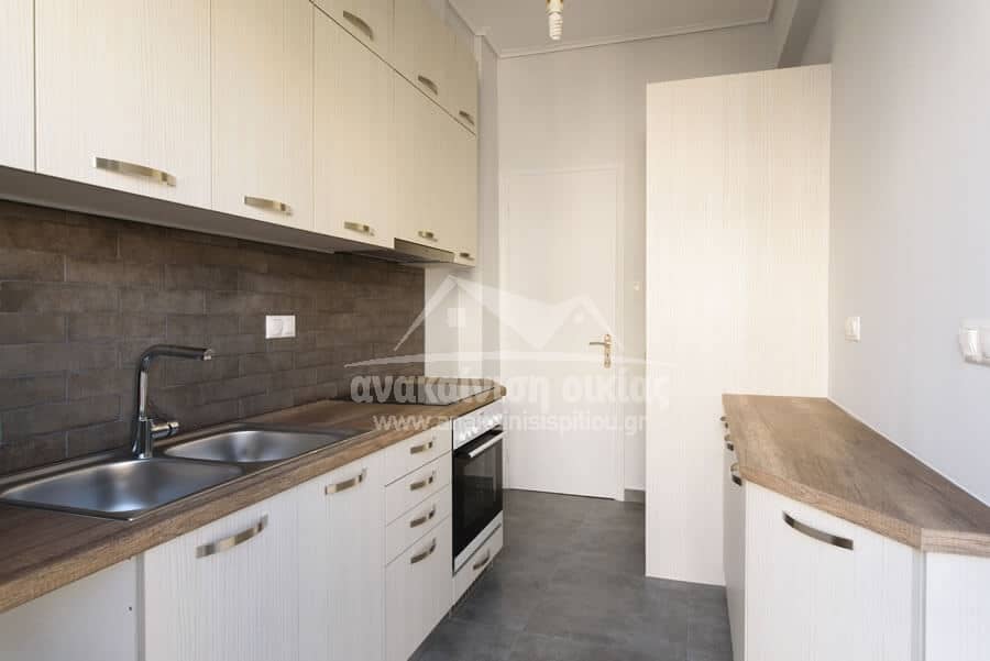 Η κουζίνα αντικαταστάθηκε με νέα σε γήινες αποχρώσεις και τοποθετήθηκαν ενεργειακά κουφώματα αλουμινίου της εταιρείας Alumil. Τα παλαιά πλακάκια αποξηλώθηκαν και τοποθετήθηκαν νέα σε μία όμορφη γκρι απόχρωση.