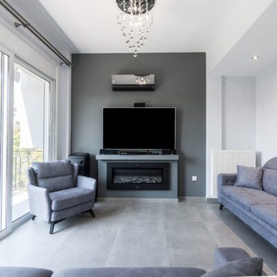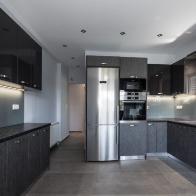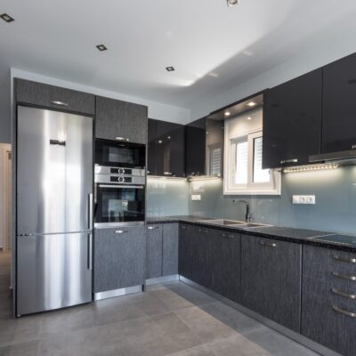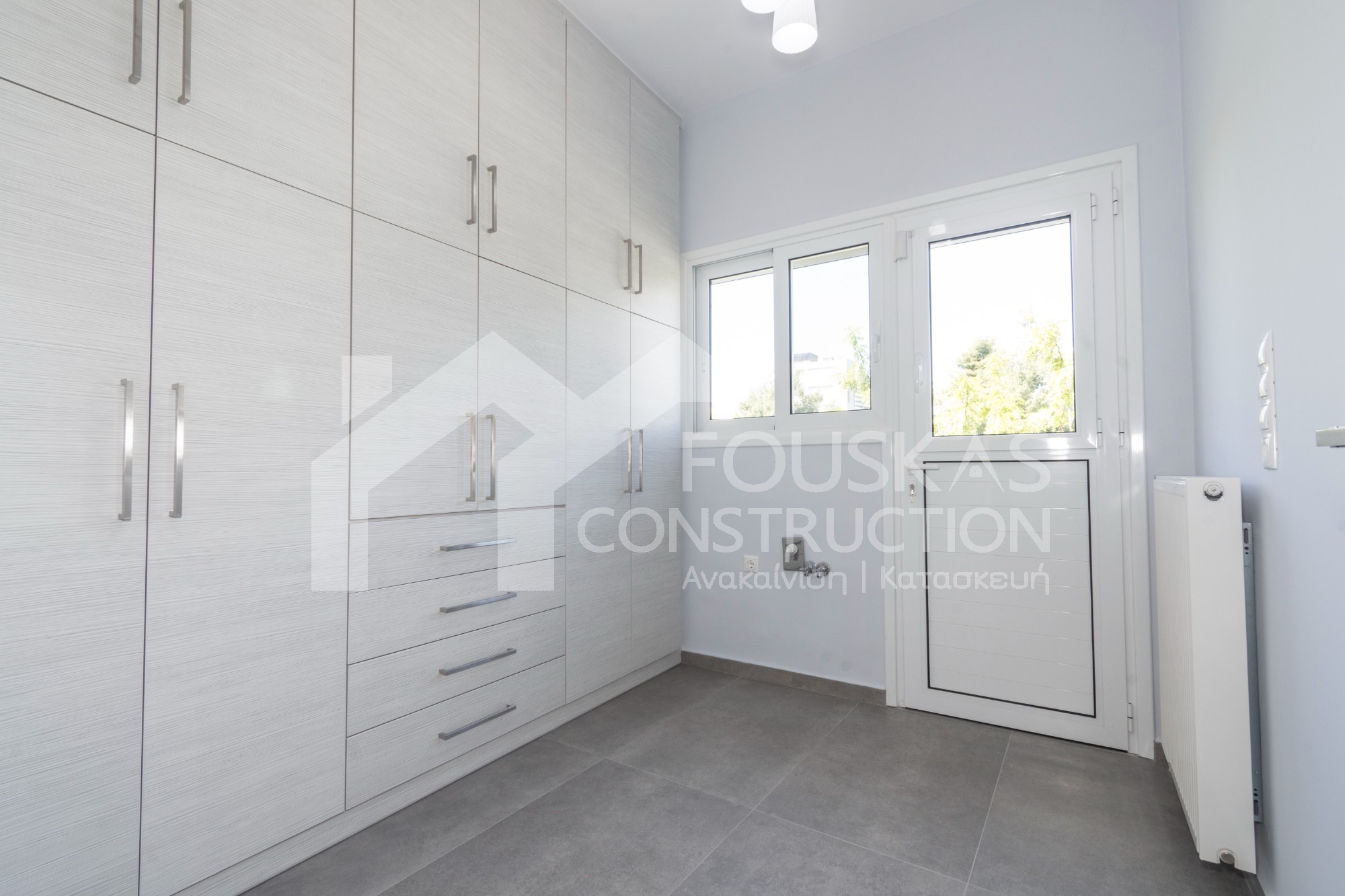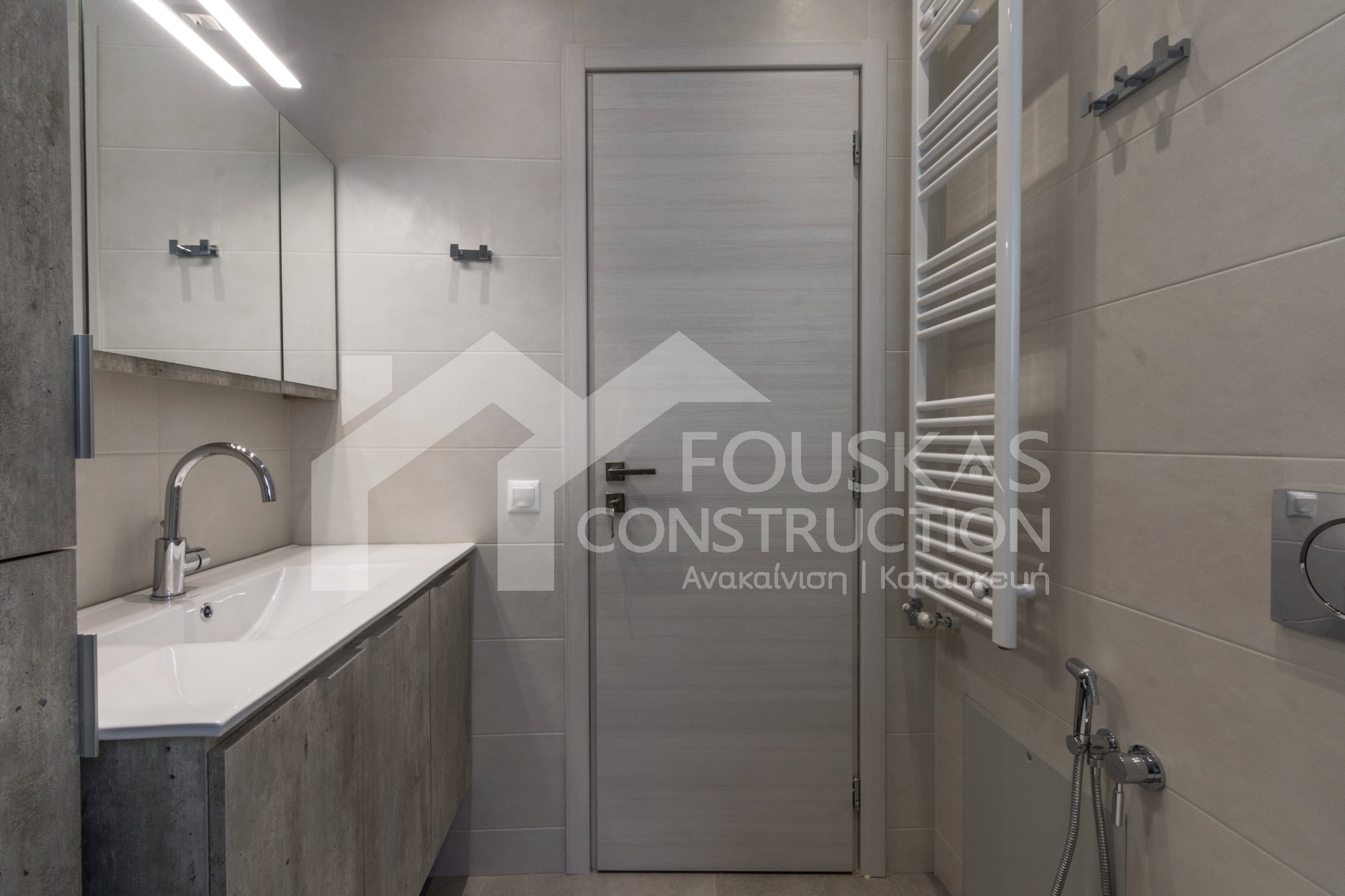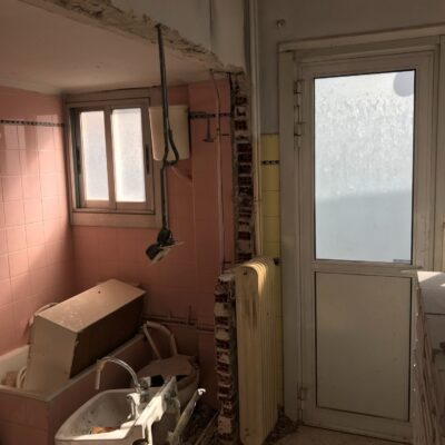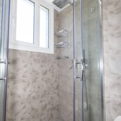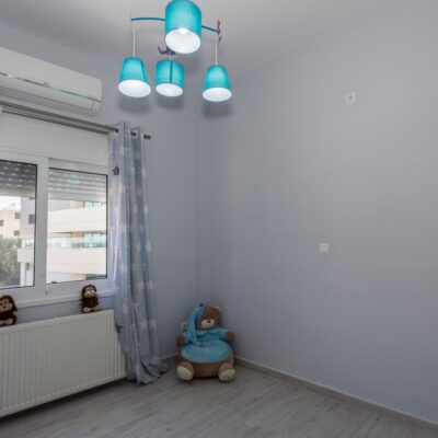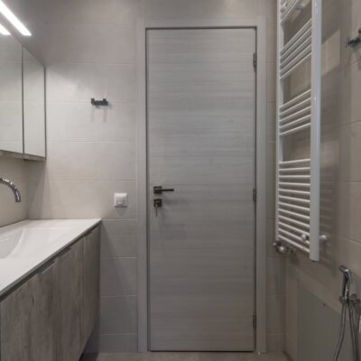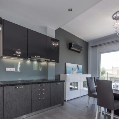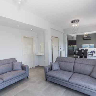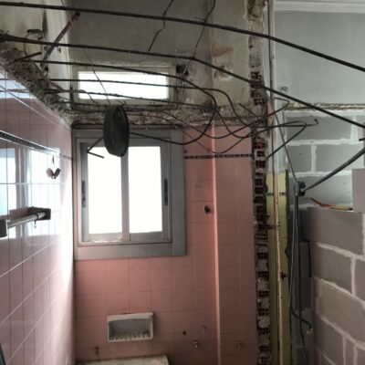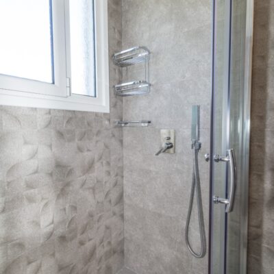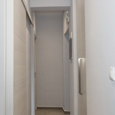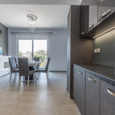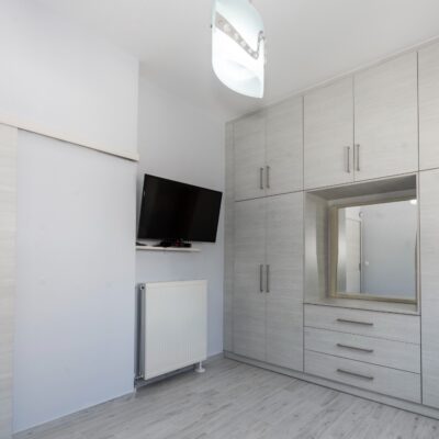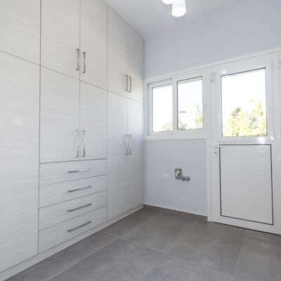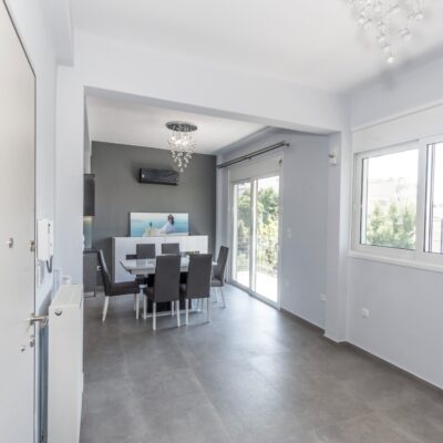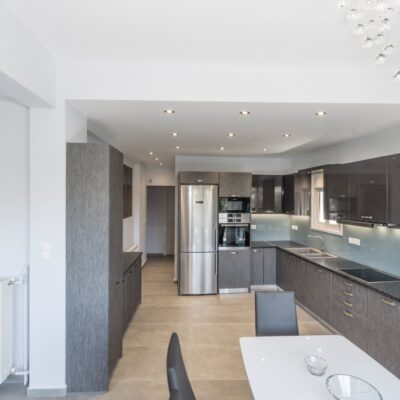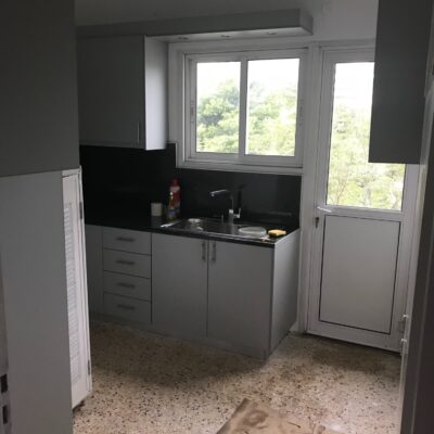 Η ανακαίνιση συνεχίστηκε με τη δημιουργία δύο μπάνιων με ντουζιέρες και εντοιχισμούς. Η κουζίνα έγινε από βακελίτη και στην πλάτη του πάγκου τοποθετήθηκε κρύσταλλο ασφαλείας. Δημιουργήθηκε ένας χώρος για πλυντήριο και στεγνωτήριο αυτόνομος καθώς και σιδερωτήριο. Στη μία πλευρά του σαλονιού δημιουργήθηκε μία κατασκευή από γυψοσανίδες και τοποθετήθηκε ηλεκτρικό τζάκι. Τα εξωτερικά κουφώματα αντικαταστάθηκαν με νέα ενεργειακά κουφώματα αλουμινίου και τοποθετήθηκαν νέες εσωτερικές πόρτες σε λευκή απόχρωση. Το διαμέρισμα με τους εσωτερικούς και εξωτερικούς χρωματισμούς και τέλος έγινε μελέτη για τοποθέτηση μελλοντικά εξωτερικού ανελκυστήρα. Το αποτέλεσμα της συγκεκριμένης ανακαίνισης κατοικίας μας δικαίωσε και ευχόμαστε καλή διαμονή στην οικογένεια!