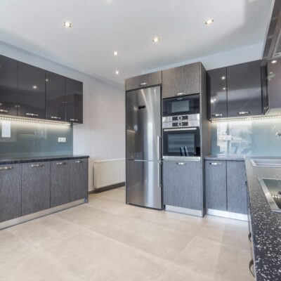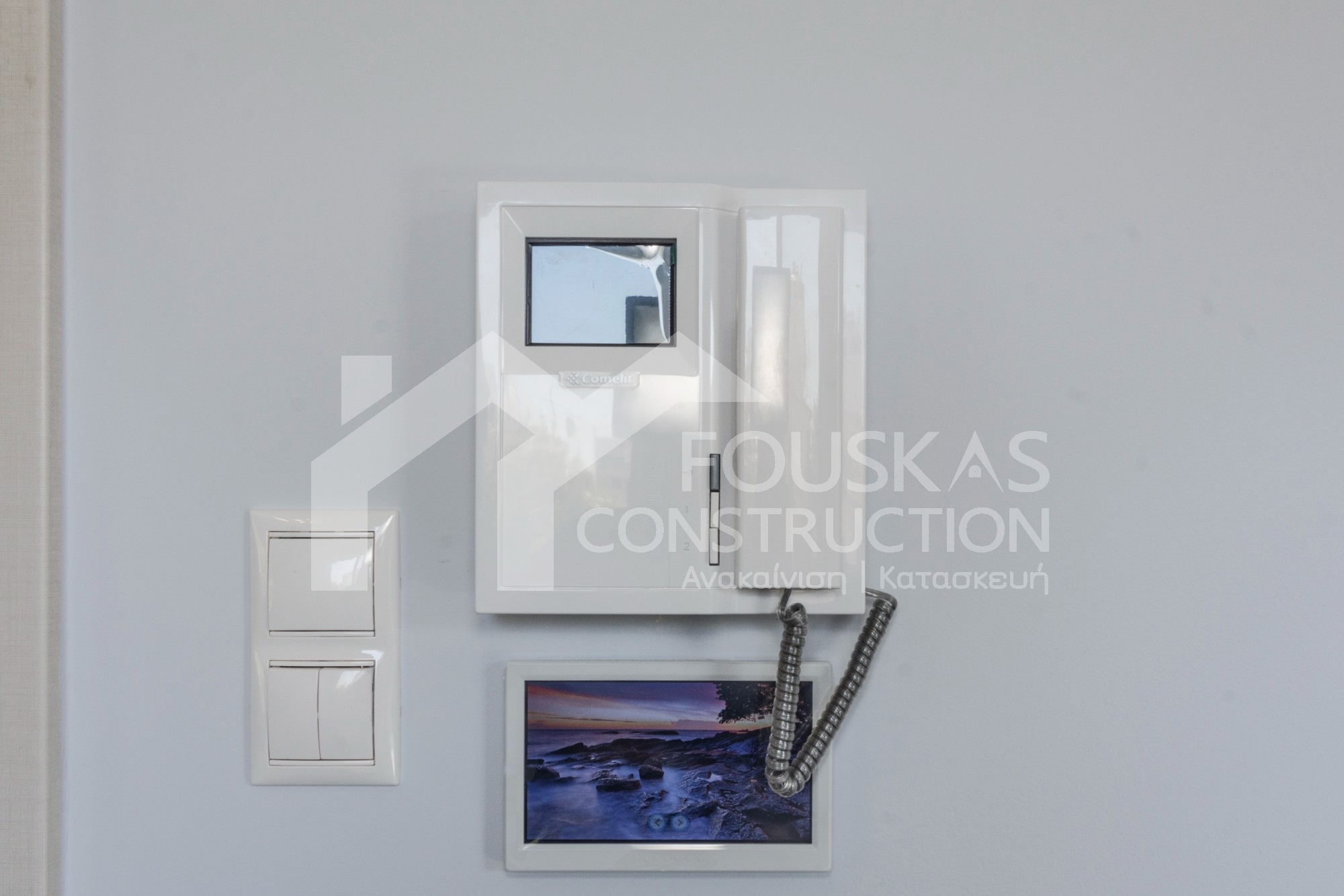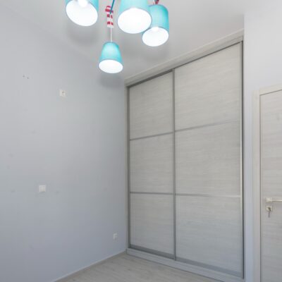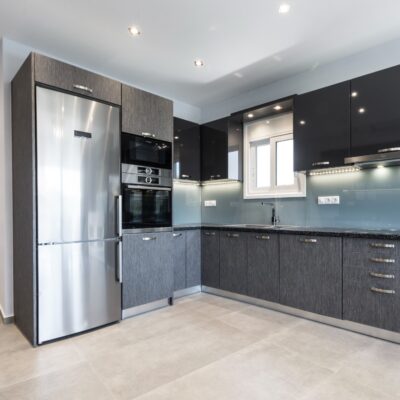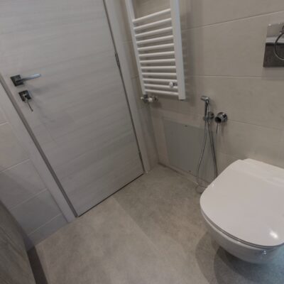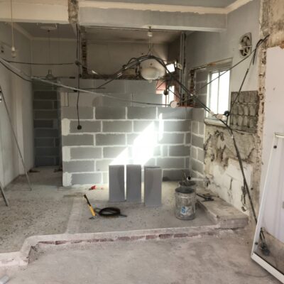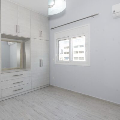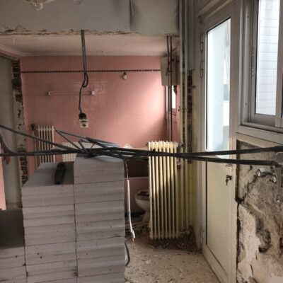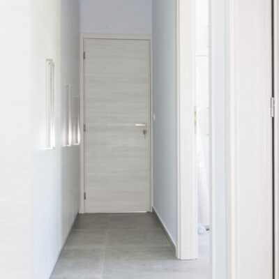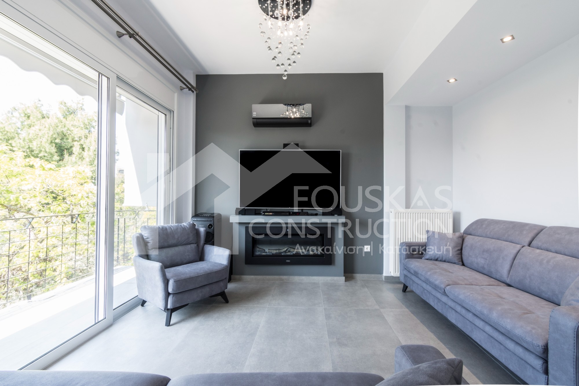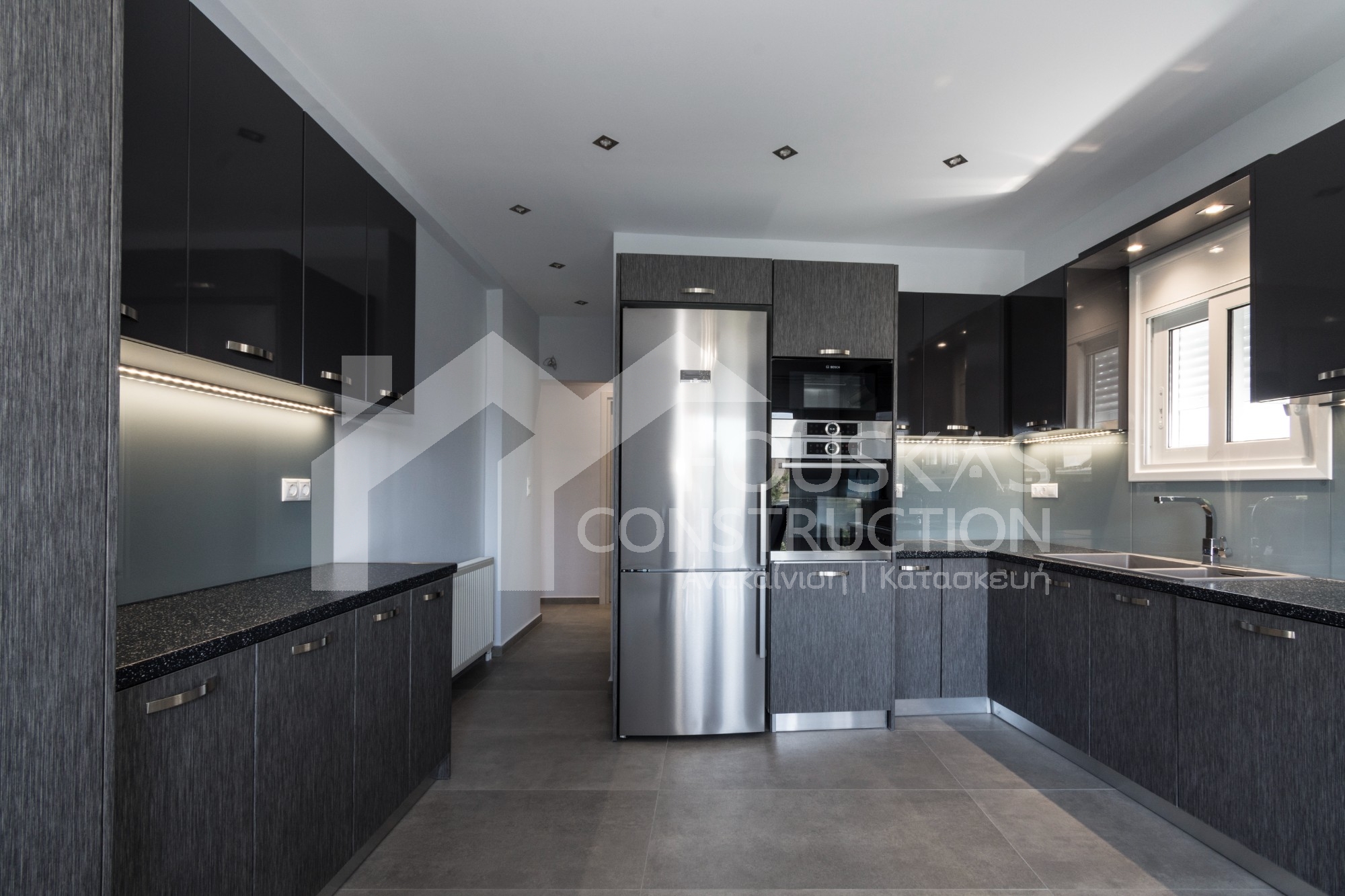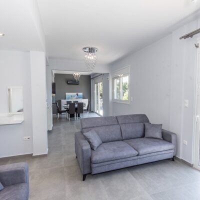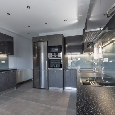 Η ανακαίνιση συνεχίστηκε με τη δημιουργία δύο μπάνιων με ντουζιέρες και εντοιχισμούς. Η κουζίνα έγινε από βακελίτη και στην πλάτη του πάγκου τοποθετήθηκε κρύσταλλο ασφαλείας. Δημιουργήθηκε ένας χώρος για πλυντήριο και στεγνωτήριο αυτόνομος καθώς και σιδερωτήριο. Στη μία πλευρά του σαλονιού δημιουργήθηκε μία κατασκευή από γυψοσανίδες και τοποθετήθηκε ηλεκτρικό τζάκι. Τα εξωτερικά κουφώματα αντικαταστάθηκαν με νέα ενεργειακά κουφώματα αλουμινίου και τοποθετήθηκαν νέες εσωτερικές πόρτες σε λευκή απόχρωση. Το διαμέρισμα με τους εσωτερικούς και εξωτερικούς χρωματισμούς και τέλος έγινε μελέτη για τοποθέτηση μελλοντικά εξωτερικού ανελκυστήρα. Το αποτέλεσμα της συγκεκριμένης ανακαίνισης κατοικίας μας δικαίωσε και ευχόμαστε καλή διαμονή στην οικογένεια!