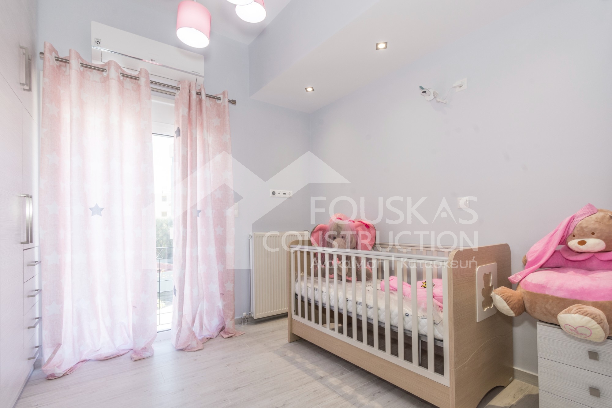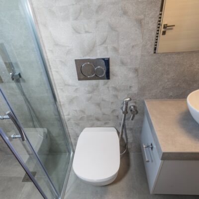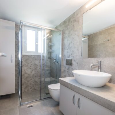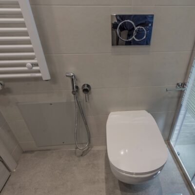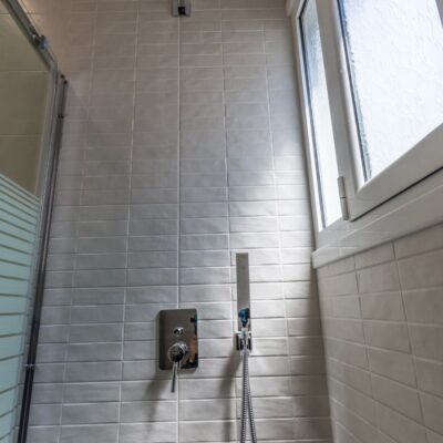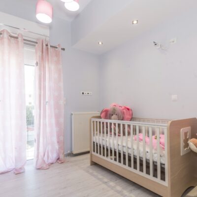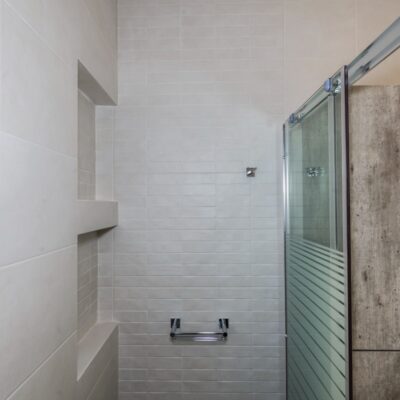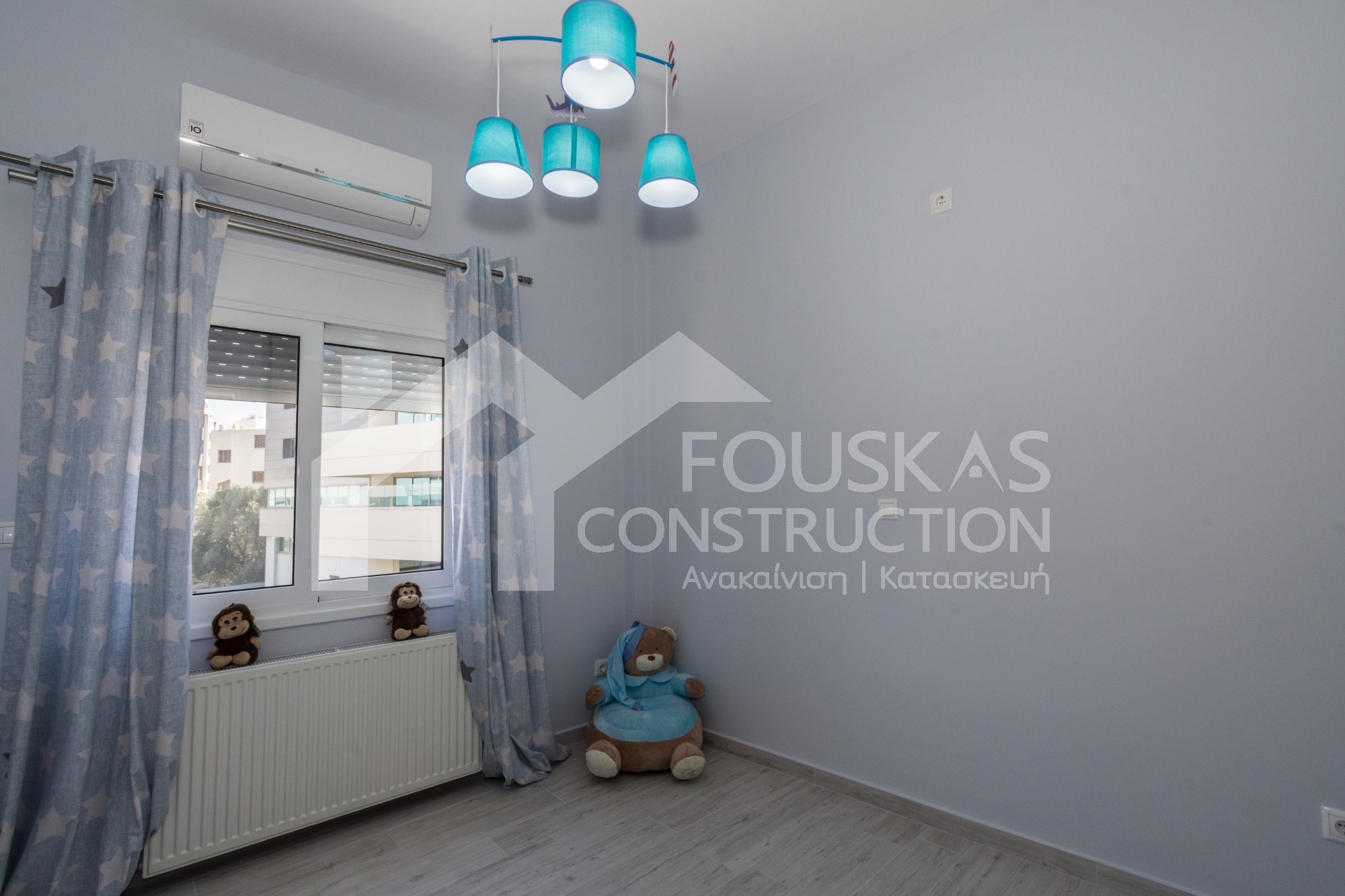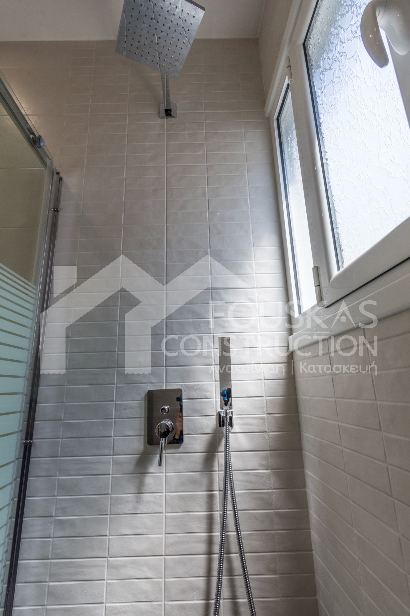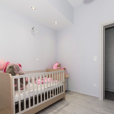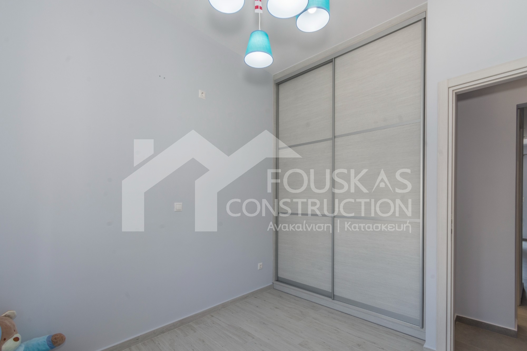 Η ανακαίνιση συνεχίστηκε με τη δημιουργία δύο μπάνιων με ντουζιέρες και εντοιχισμούς. Η κουζίνα έγινε από βακελίτη και στην πλάτη του πάγκου τοποθετήθηκε κρύσταλλο ασφαλείας. Δημιουργήθηκε ένας χώρος για πλυντήριο και στεγνωτήριο αυτόνομος καθώς και σιδερωτήριο. Στη μία πλευρά του σαλονιού δημιουργήθηκε μία κατασκευή από γυψοσανίδες και τοποθετήθηκε ηλεκτρικό τζάκι. Τα εξωτερικά κουφώματα αντικαταστάθηκαν με νέα ενεργειακά κουφώματα αλουμινίου και τοποθετήθηκαν νέες εσωτερικές πόρτες σε λευκή απόχρωση. Το διαμέρισμα με τους εσωτερικούς και εξωτερικούς χρωματισμούς και τέλος έγινε μελέτη για τοποθέτηση μελλοντικά εξωτερικού ανελκυστήρα. Το αποτέλεσμα της συγκεκριμένης ανακαίνισης κατοικίας μας δικαίωσε και ευχόμαστε καλή διαμονή στην οικογένεια!