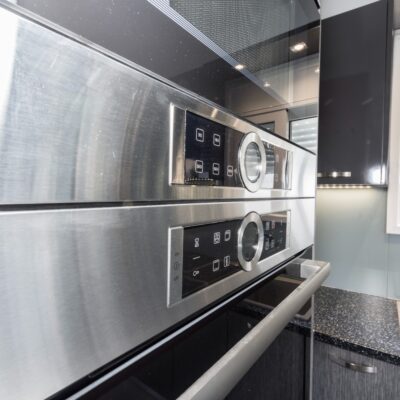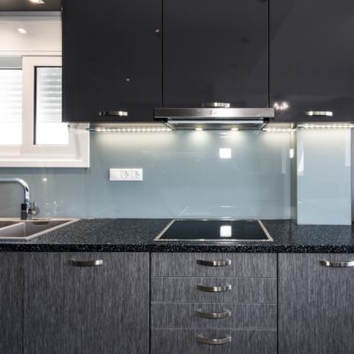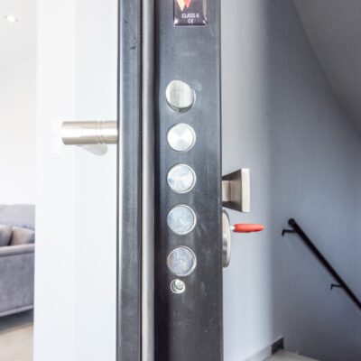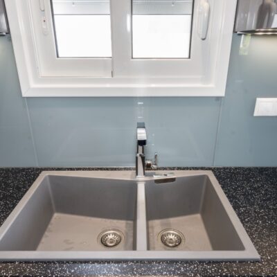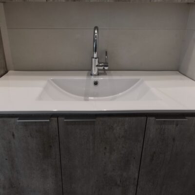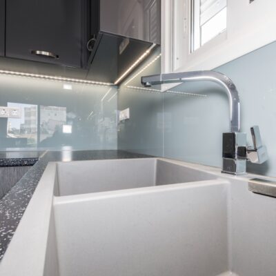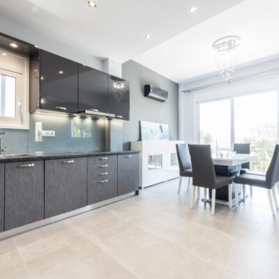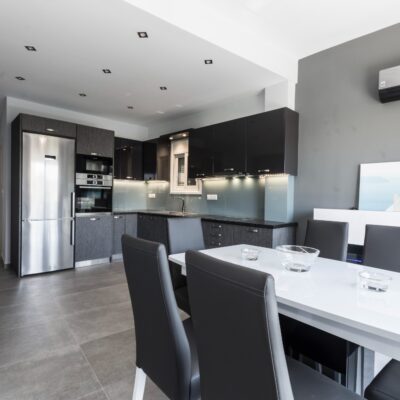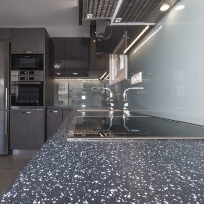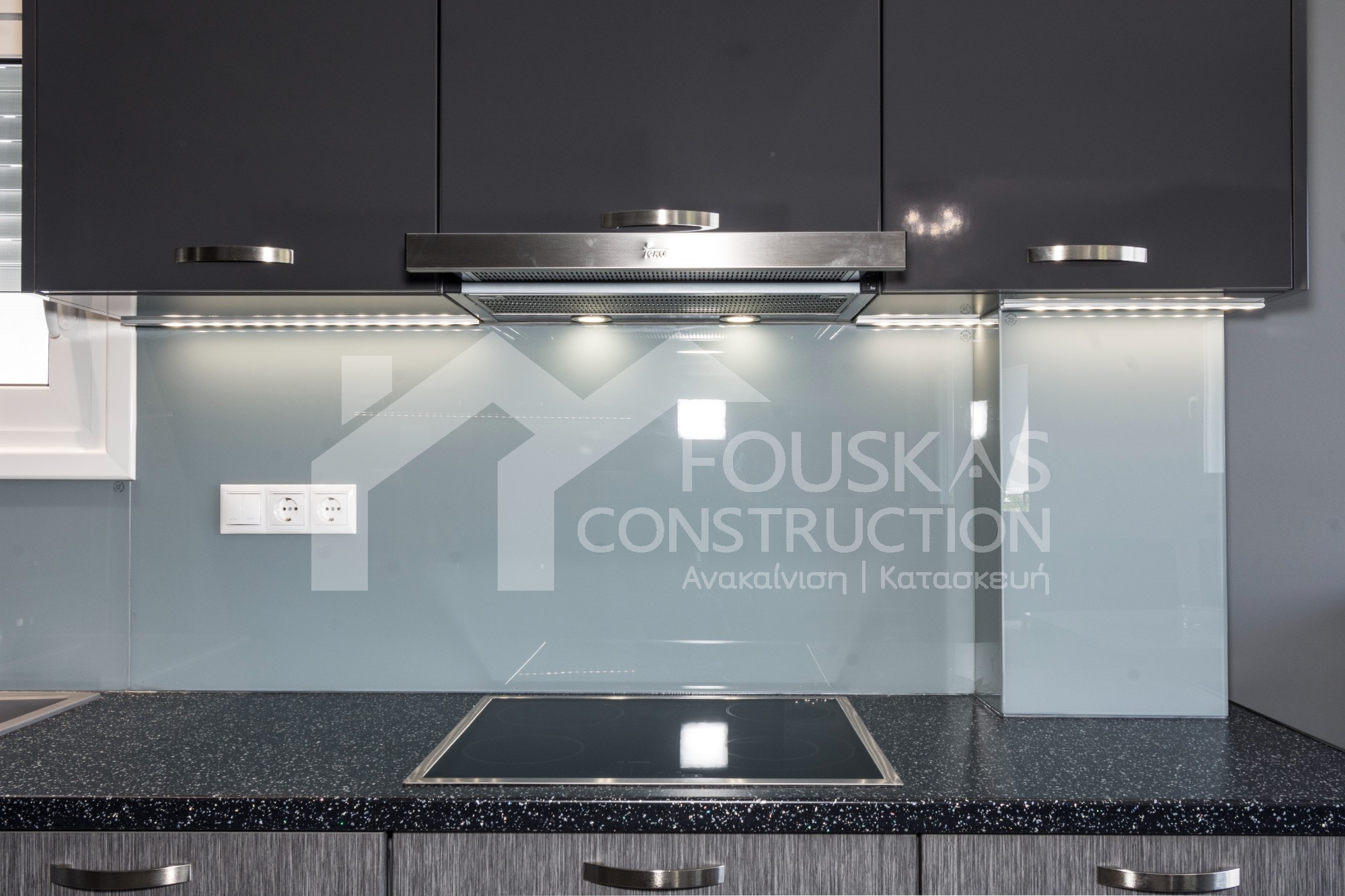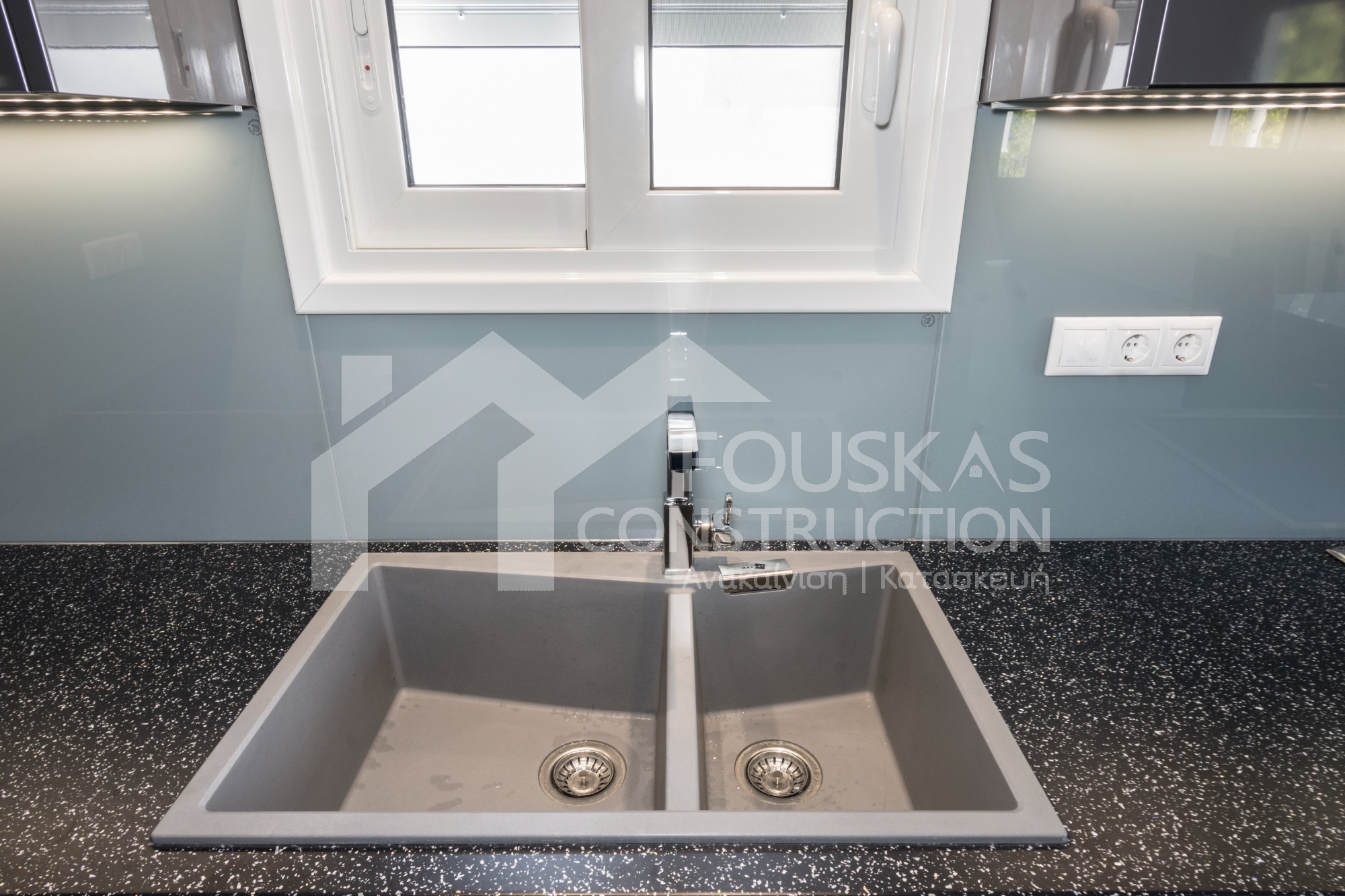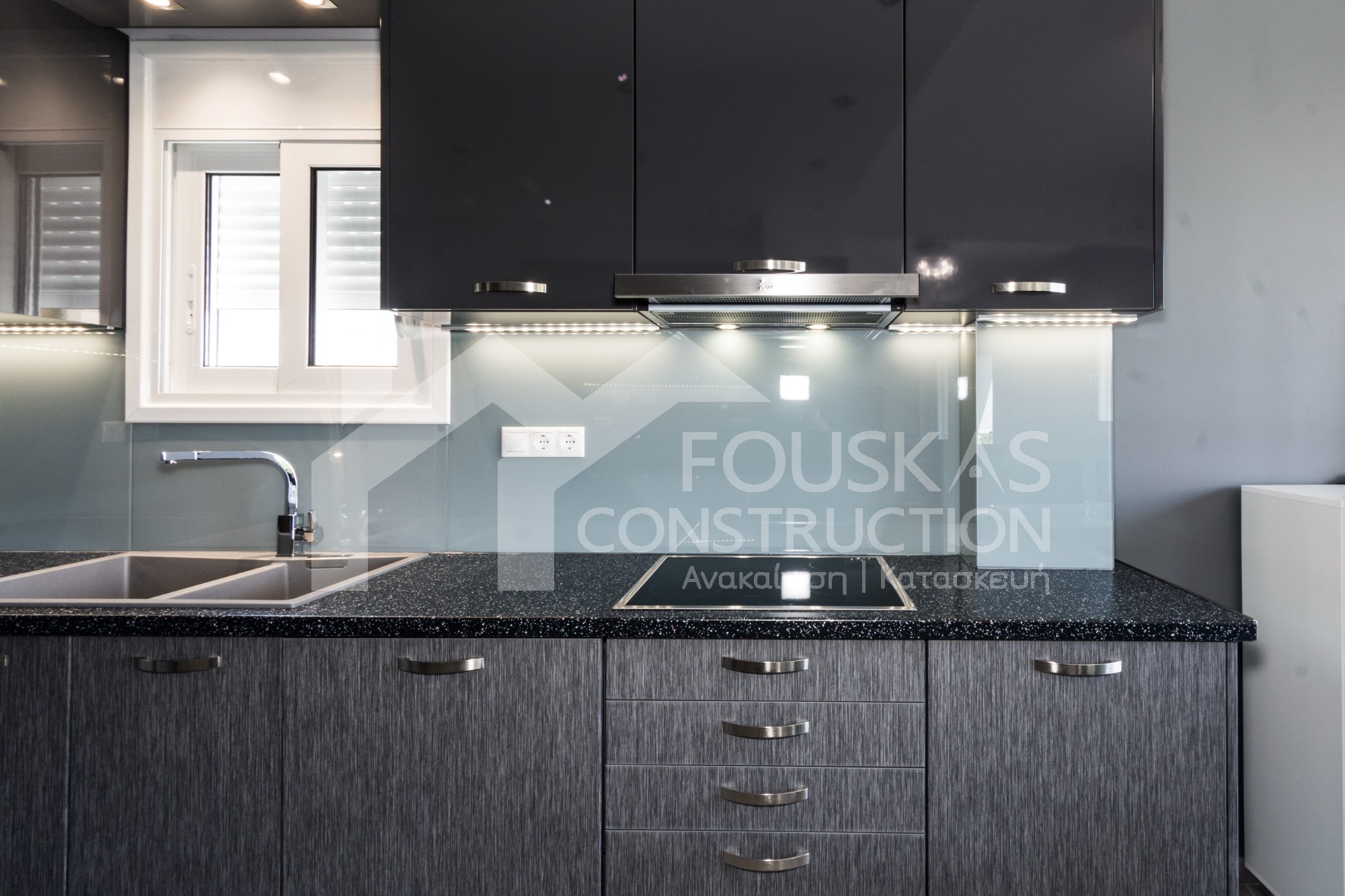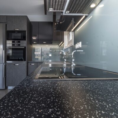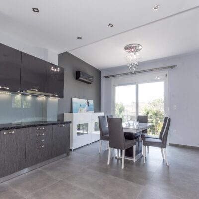 Η ανακαίνιση συνεχίστηκε με τη δημιουργία δύο μπάνιων με ντουζιέρες και εντοιχισμούς. Η κουζίνα έγινε από βακελίτη και στην πλάτη του πάγκου τοποθετήθηκε κρύσταλλο ασφαλείας. Δημιουργήθηκε ένας χώρος για πλυντήριο και στεγνωτήριο αυτόνομος καθώς και σιδερωτήριο. Στη μία πλευρά του σαλονιού δημιουργήθηκε μία κατασκευή από γυψοσανίδες και τοποθετήθηκε ηλεκτρικό τζάκι. Τα εξωτερικά κουφώματα αντικαταστάθηκαν με νέα ενεργειακά κουφώματα αλουμινίου και τοποθετήθηκαν νέες εσωτερικές πόρτες σε λευκή απόχρωση. Το διαμέρισμα με τους εσωτερικούς και εξωτερικούς χρωματισμούς και τέλος έγινε μελέτη για τοποθέτηση μελλοντικά εξωτερικού ανελκυστήρα. Το αποτέλεσμα της συγκεκριμένης ανακαίνισης κατοικίας μας δικαίωσε και ευχόμαστε καλή διαμονή στην οικογένεια!