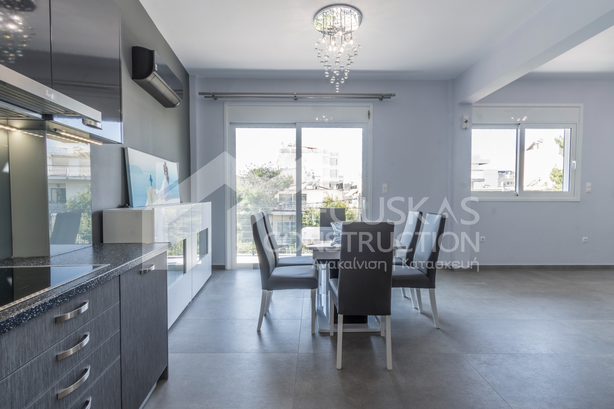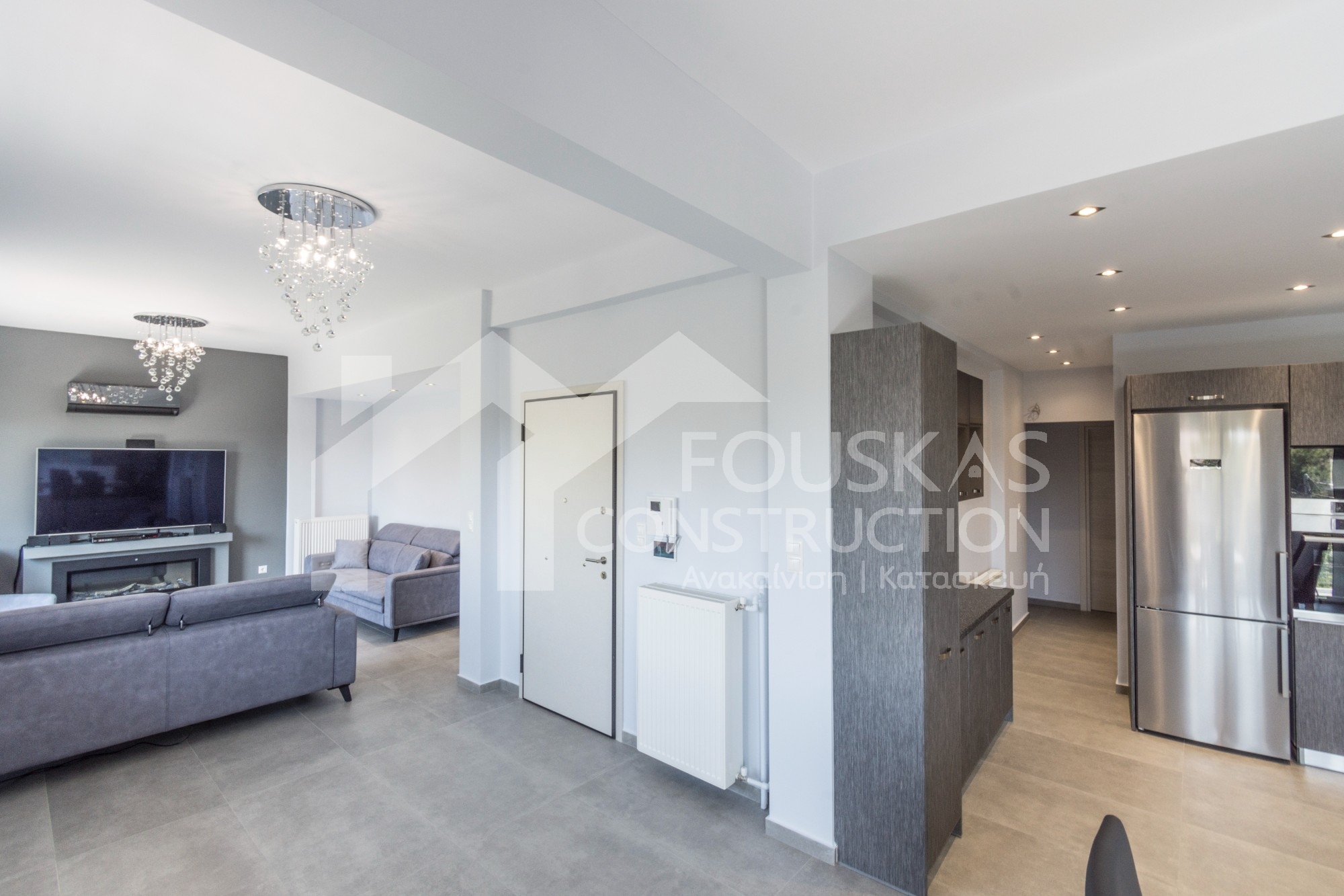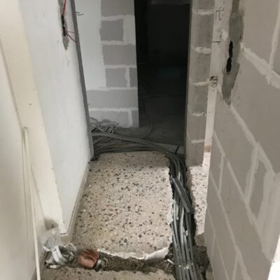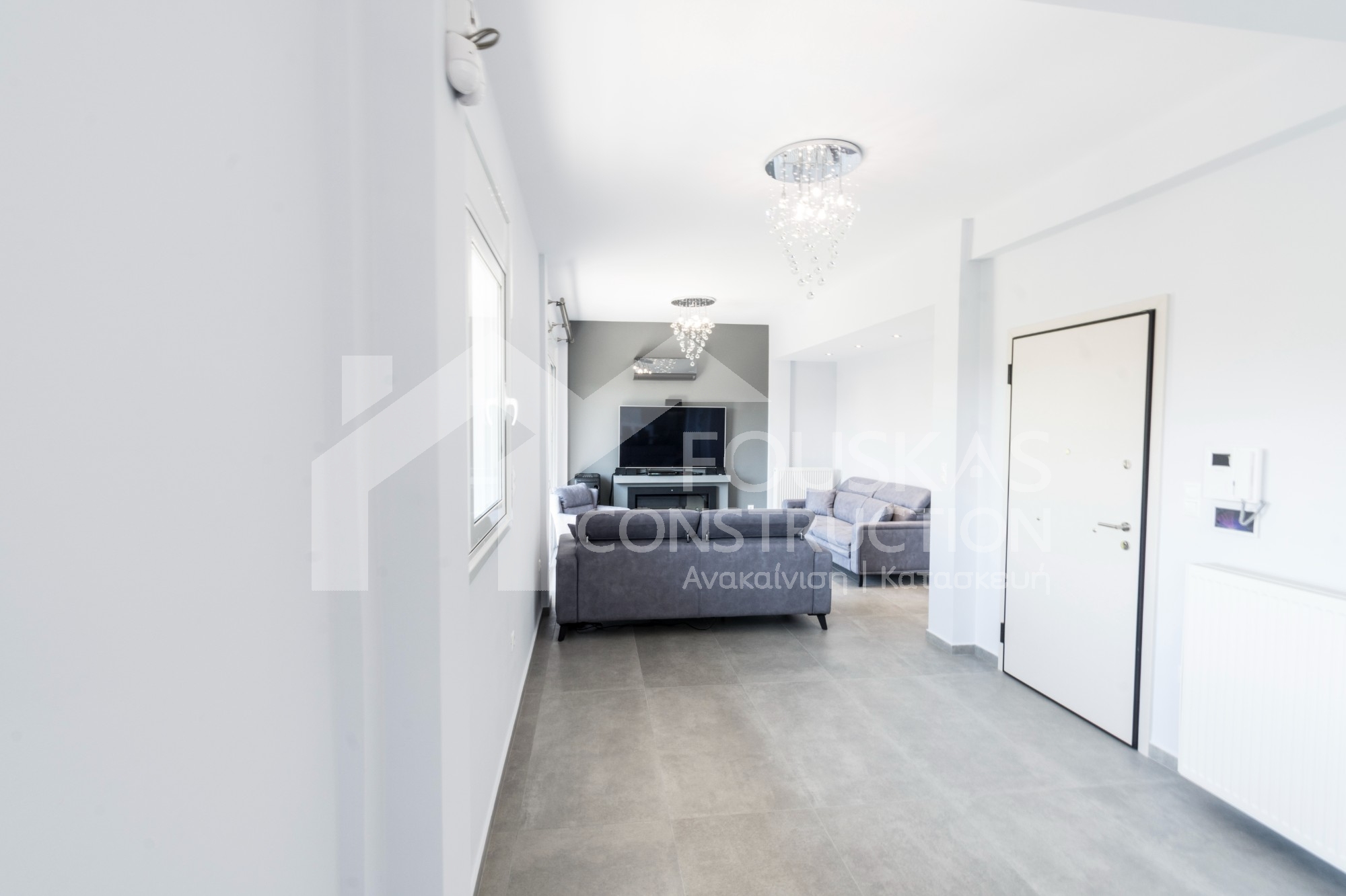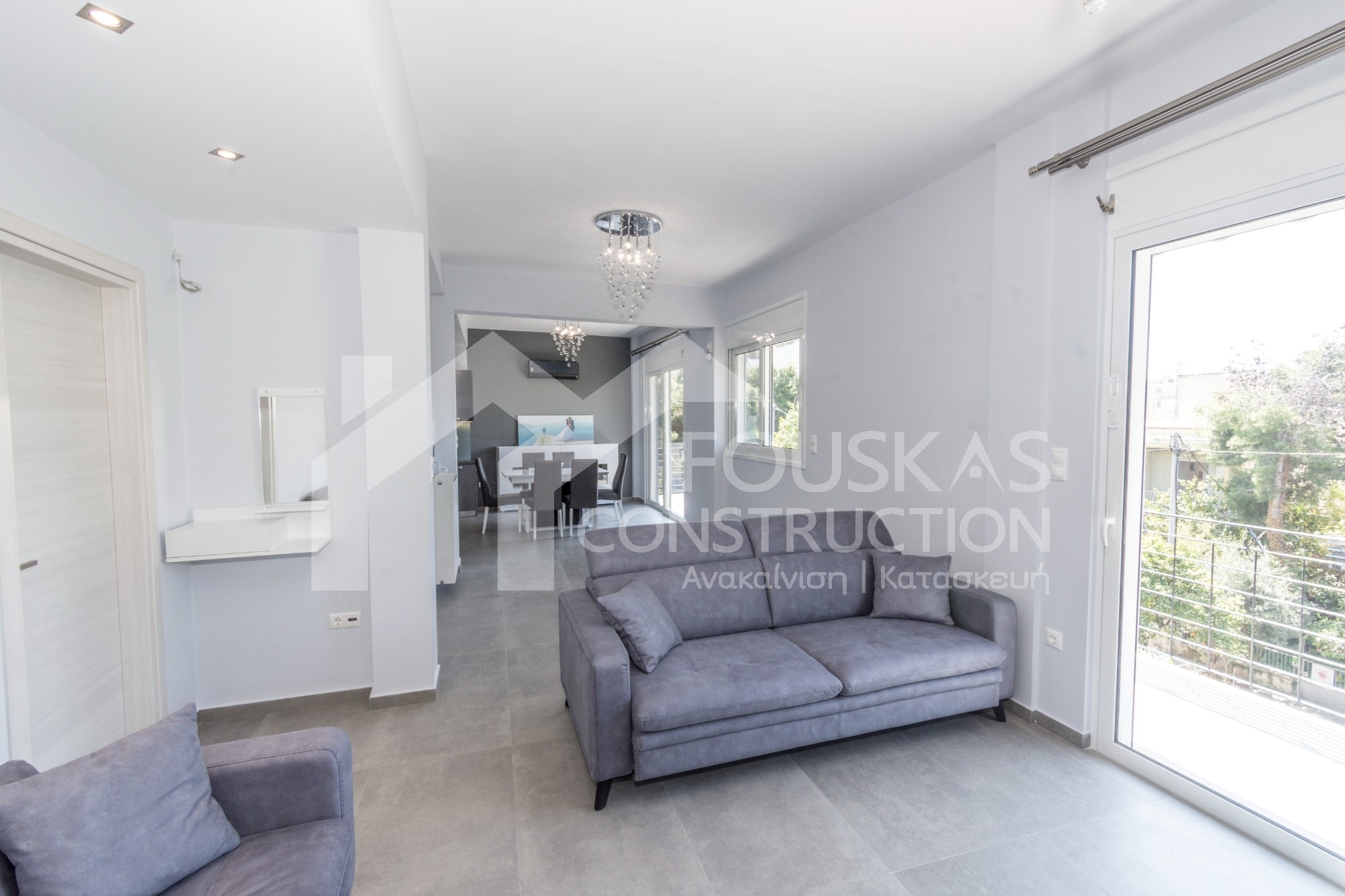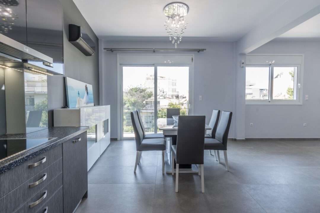Η εταιρεία μας ολοκλήρωσε μία δύσκολη και περίπλοκη ανακαίνιση κατοικίας στο Παλαιό Φάληρο. Ο όροφος είχε δύο διαμερίσματα αρκετά παλαιά και έπρεπε να δημιουργήσουμε ένα με αυξημένες απαιτήσεις. Αρχικά γκρεμίστηκαν αρκετοί τοίχοι και δημιουργήθηκαν νέοι, έτσι ώστε να σχηματιστούν οι χώροι που έπρεπε. Έγιναν πάρα πολλές αλλαγές στα εξωτερικά κουφώματα και γενικά σε όλο τον όροφο. Δημιουργήθηκαν νέες υδραυλικές και ηλεκτρολογικές εγκαταστάσεις σύμφωνα με τις απαιτήσεις του πελάτη. Αφού ξηλώθηκαν τα δάπεδα έπρεπε να γεμιστούς με νέα τσιμεντοκονία από περλίτη για να έχουμε ηχομονωτικές ιδιότητες αλλά και μειωμένο βάρος. Τα δάπεδα καλυφτήκαν με πλακάκια μεγάλης διάστασης από γρανίτη σε μία όμορφη γκρι γήινη απόχρωση.