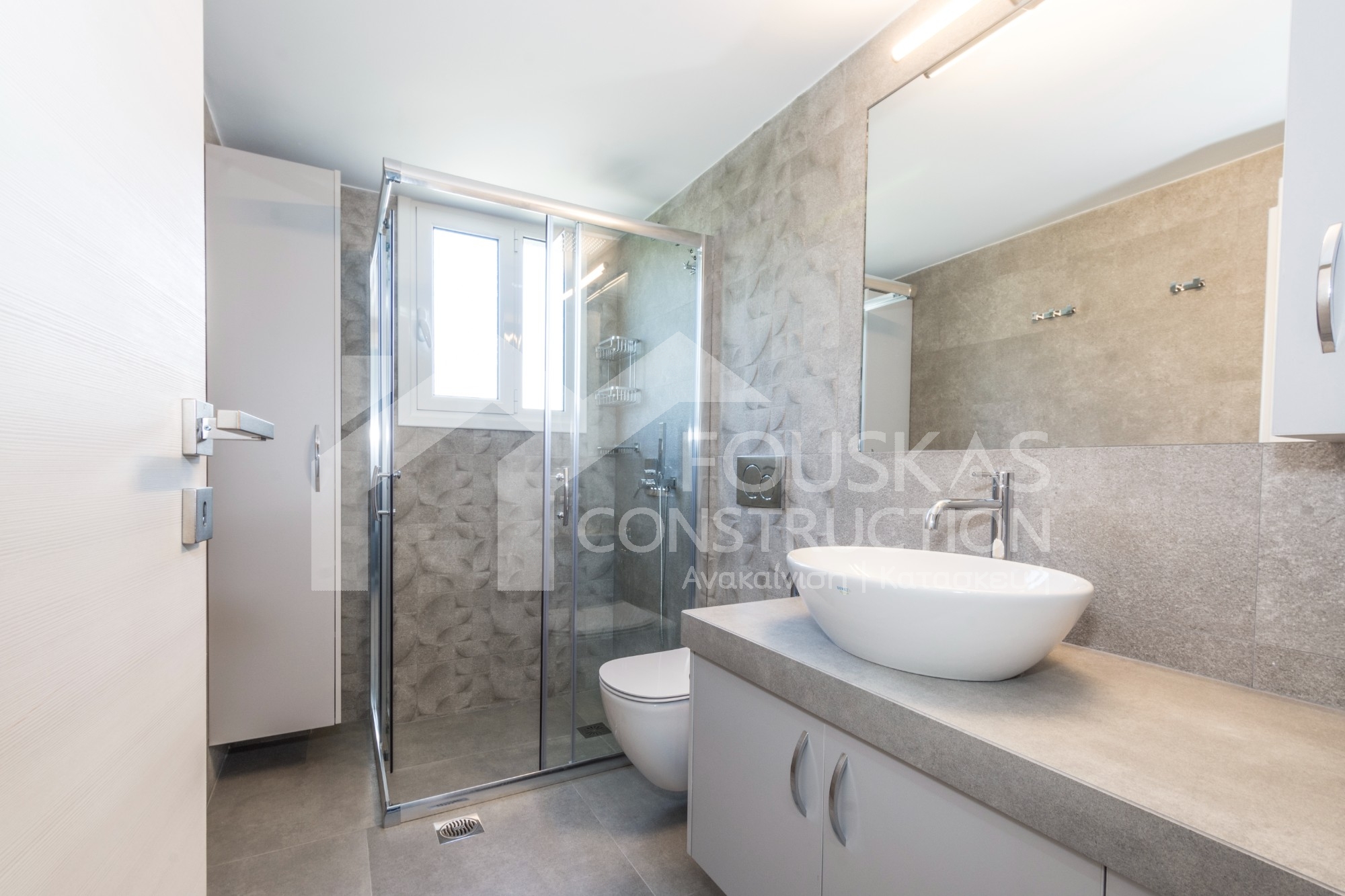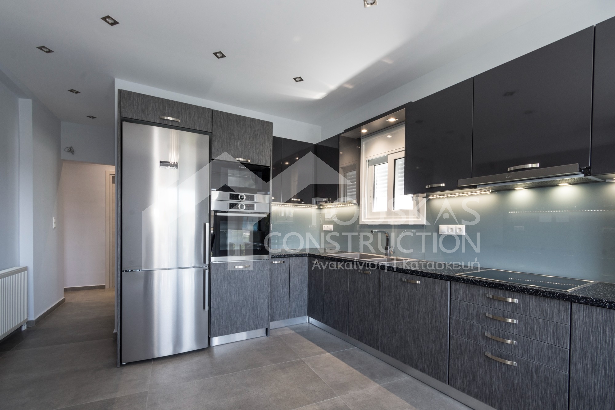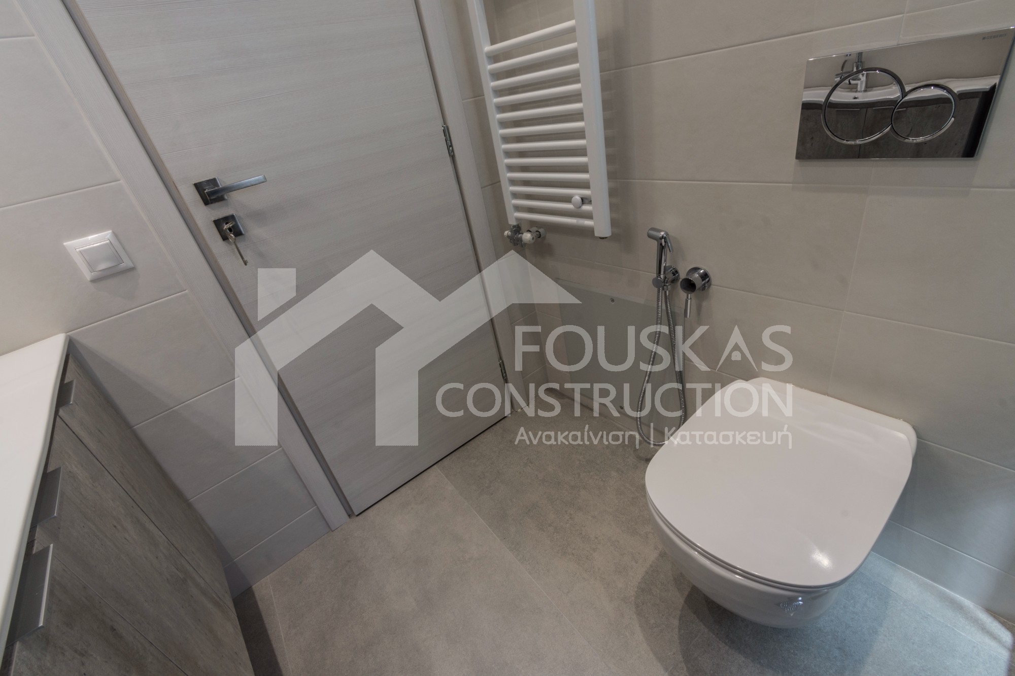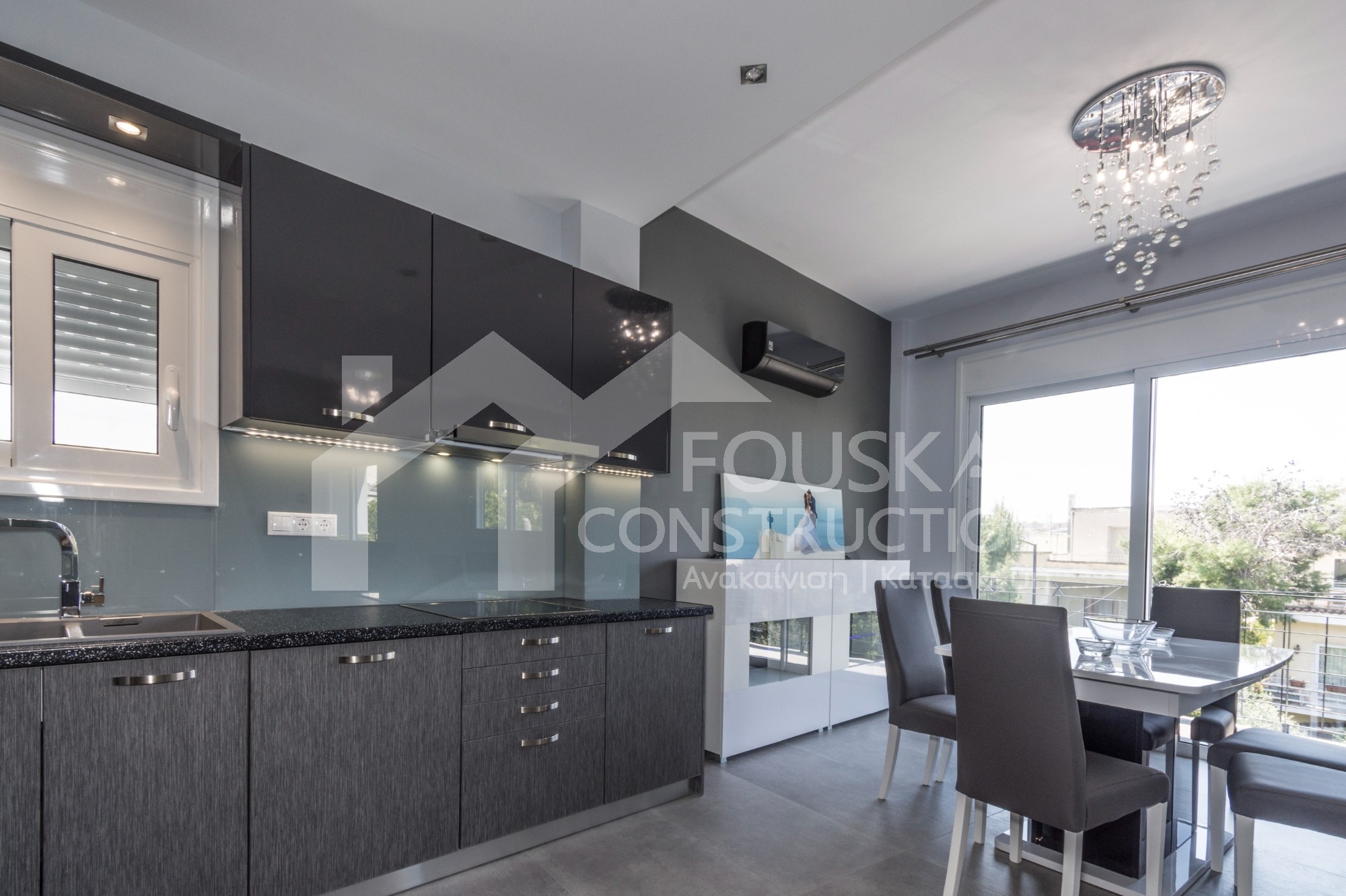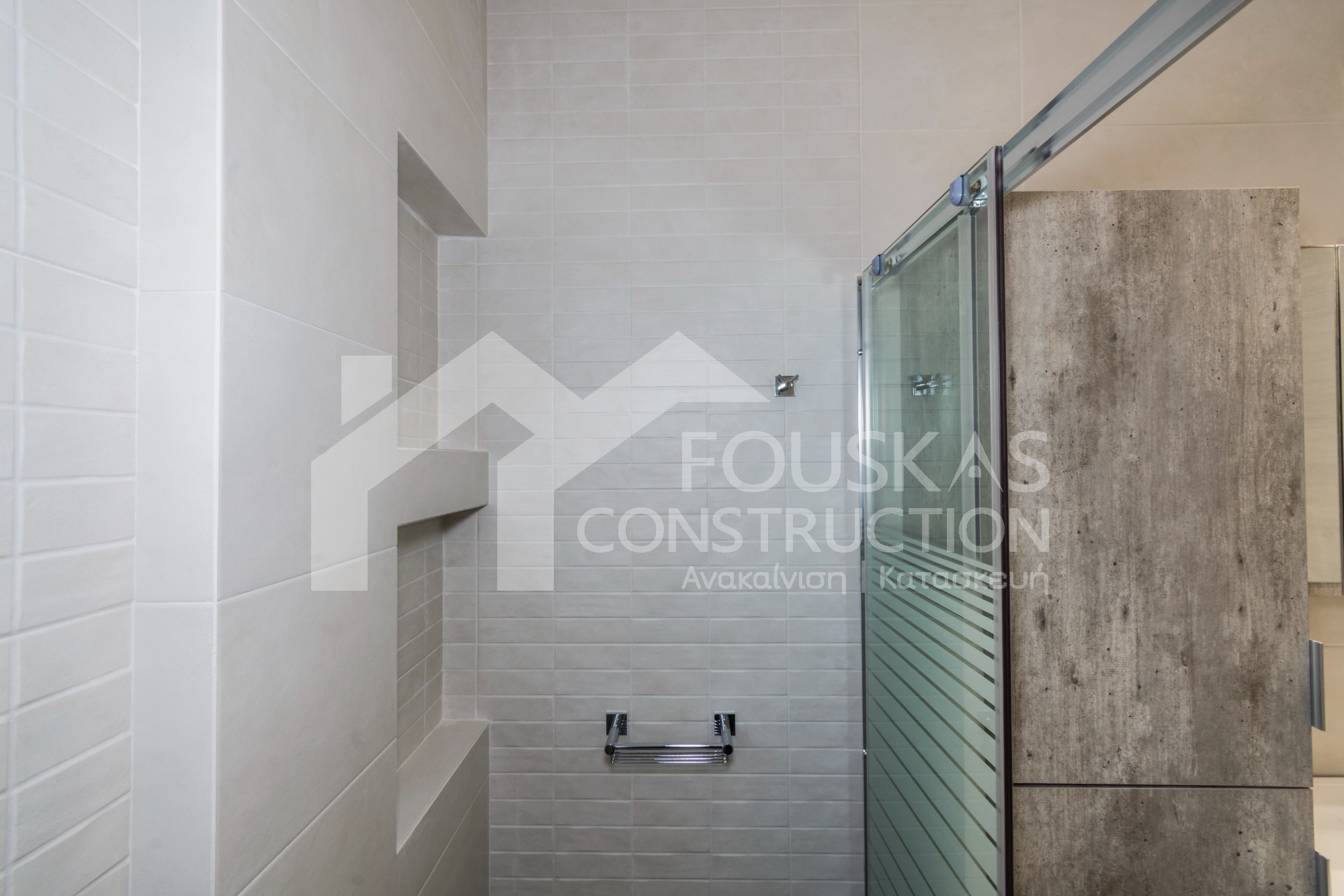 Η εταιρεία μας ολοκλήρωσε μία δύσκολη και περίπλοκη ανακαίνιση κατοικίας στο Παλαιό Φάληρο. Ο όροφος είχε δύο διαμερίσματα αρκετά παλαιά και έπρεπε να δημιουργήσουμε ένα με αυξημένες απαιτήσεις. Αρχικά γκρεμίστηκαν αρκετοί τοίχοι και δημιουργήθηκαν νέοι, έτσι ώστε να σχηματιστούν οι χώροι που έπρεπε. Έγιναν πάρα πολλές αλλαγές στα εξωτερικά κουφώματα και γενικά σε όλο τον όροφο. Δημιουργήθηκαν νέες υδραυλικές και ηλεκτρολογικές εγκαταστάσεις σύμφωνα με τις απαιτήσεις του πελάτη. Αφού ξηλώθηκαν τα δάπεδα έπρεπε να γεμιστούς με νέα τσιμεντοκονία από περλίτη για να έχουμε ηχομονωτικές ιδιότητες αλλά και μειωμένο βάρος. Τα δάπεδα καλυφτήκαν με πλακάκια μεγάλης διάστασης από γρανίτη σε μία όμορφη γκρι γήινη απόχρωση.