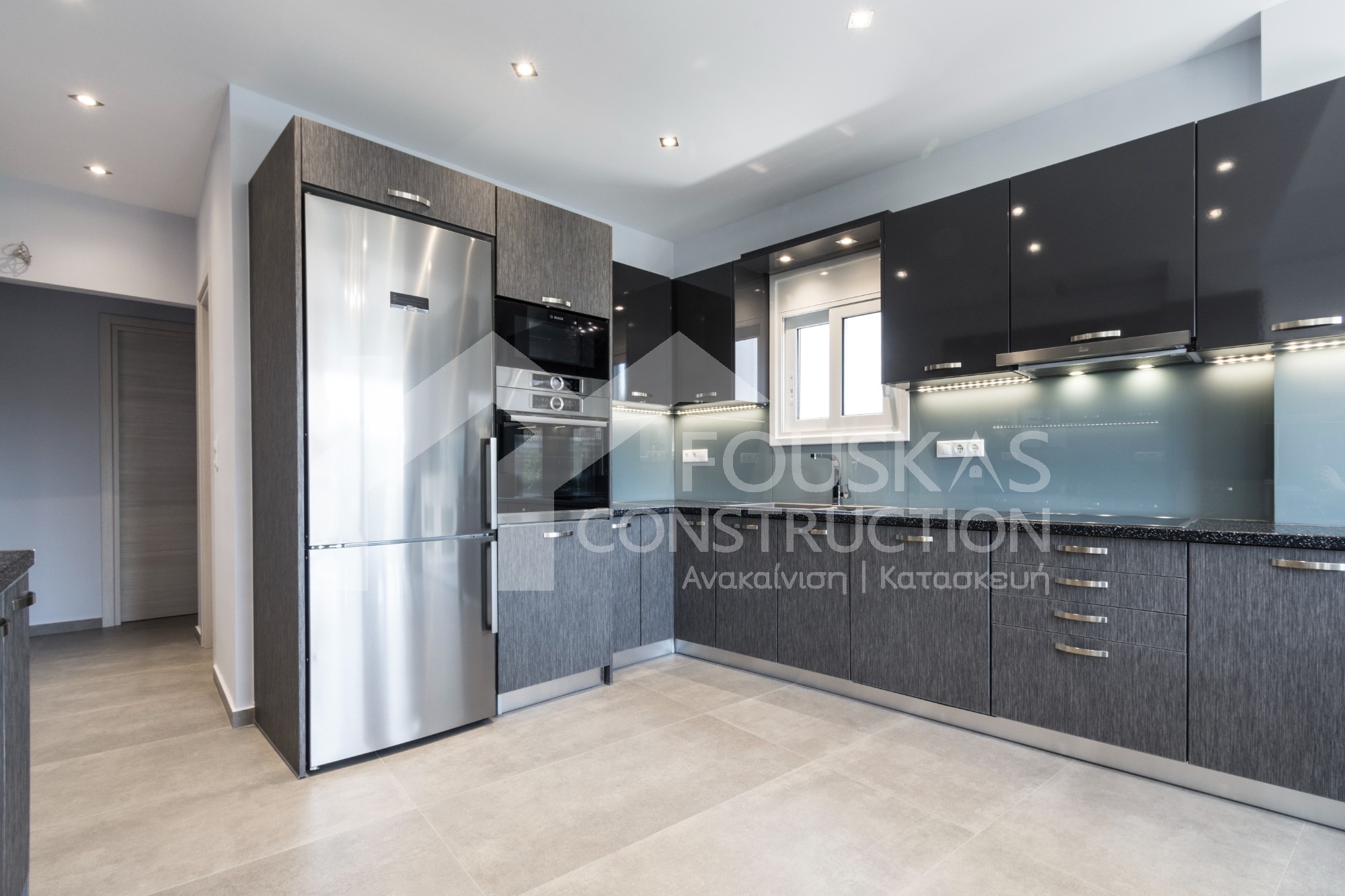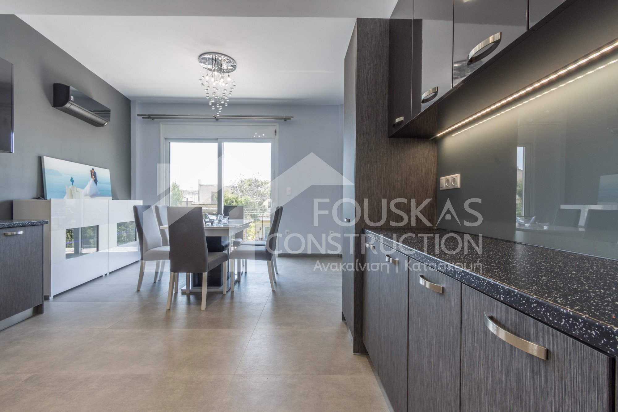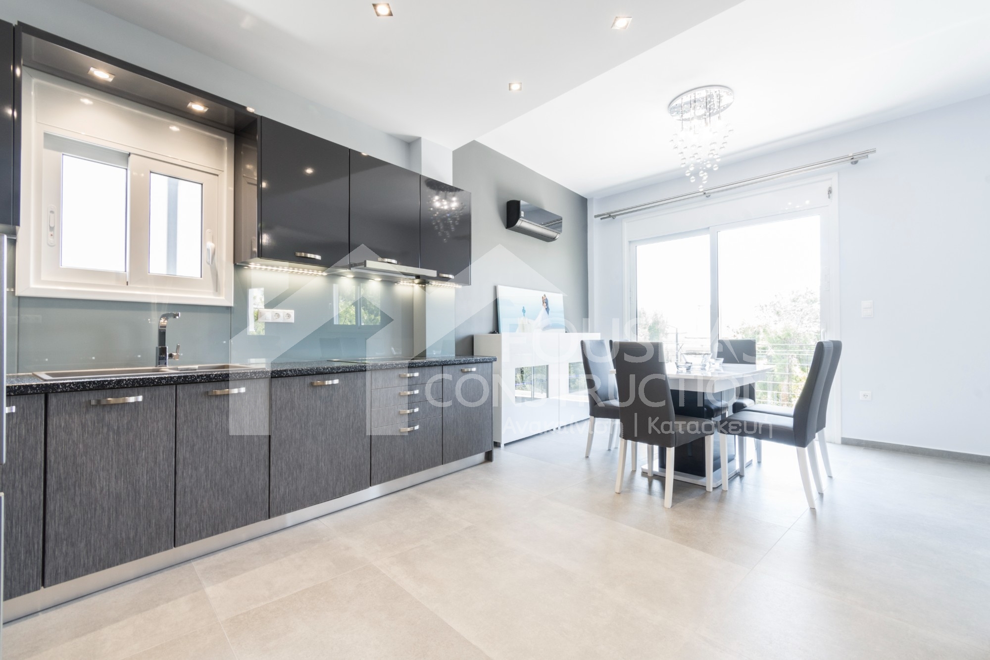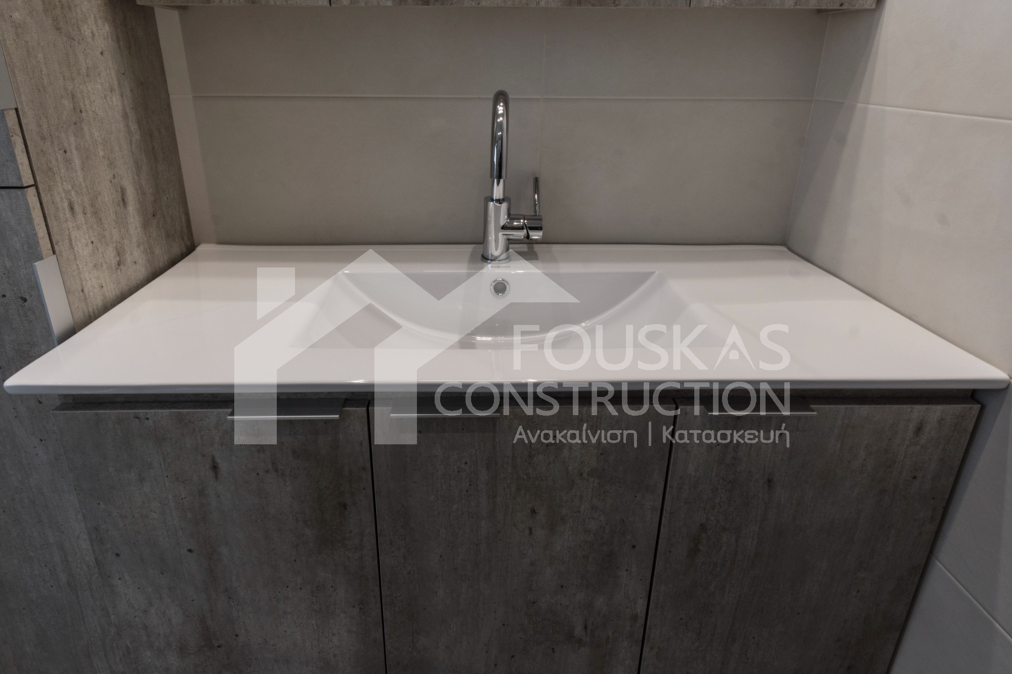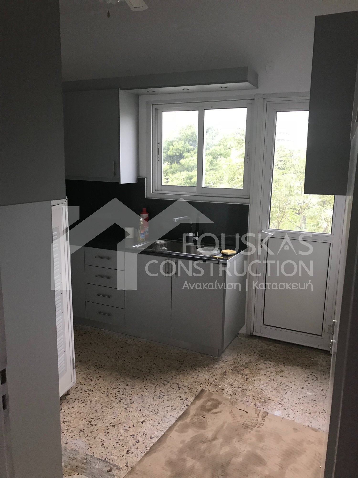 Η εταιρεία μας ολοκλήρωσε μία δύσκολη και περίπλοκη ανακαίνιση κατοικίας στο Παλαιό Φάληρο. Ο όροφος είχε δύο διαμερίσματα αρκετά παλαιά και έπρεπε να δημιουργήσουμε ένα με αυξημένες απαιτήσεις. Αρχικά γκρεμίστηκαν αρκετοί τοίχοι και δημιουργήθηκαν νέοι, έτσι ώστε να σχηματιστούν οι χώροι που έπρεπε. Έγιναν πάρα πολλές αλλαγές στα εξωτερικά κουφώματα και γενικά σε όλο τον όροφο. Δημιουργήθηκαν νέες υδραυλικές και ηλεκτρολογικές εγκαταστάσεις σύμφωνα με τις απαιτήσεις του πελάτη. Αφού ξηλώθηκαν τα δάπεδα έπρεπε να γεμιστούς με νέα τσιμεντοκονία από περλίτη για να έχουμε ηχομονωτικές ιδιότητες αλλά και μειωμένο βάρος. Τα δάπεδα καλυφτήκαν με πλακάκια μεγάλης διάστασης από γρανίτη σε μία όμορφη γκρι γήινη απόχρωση.