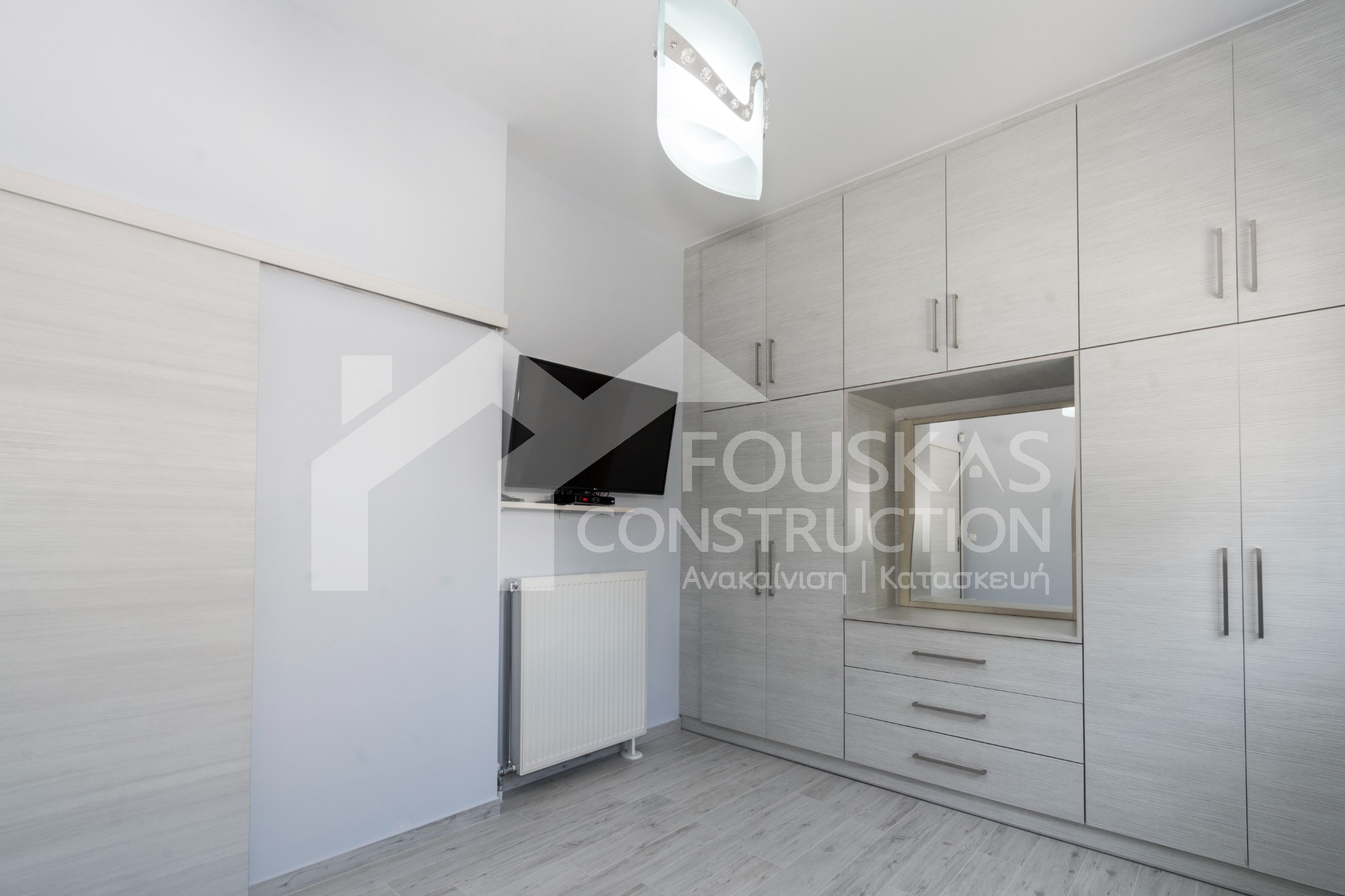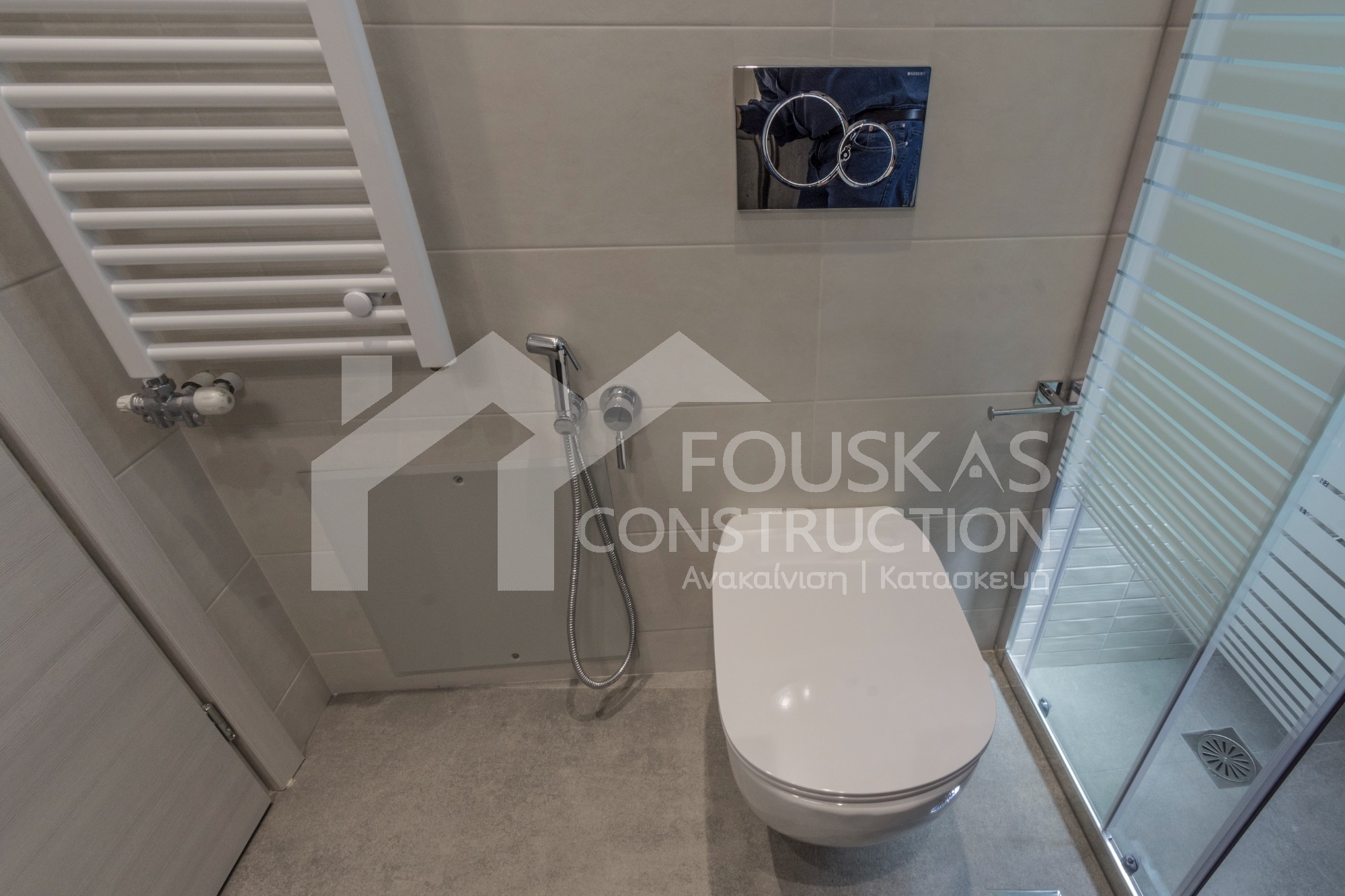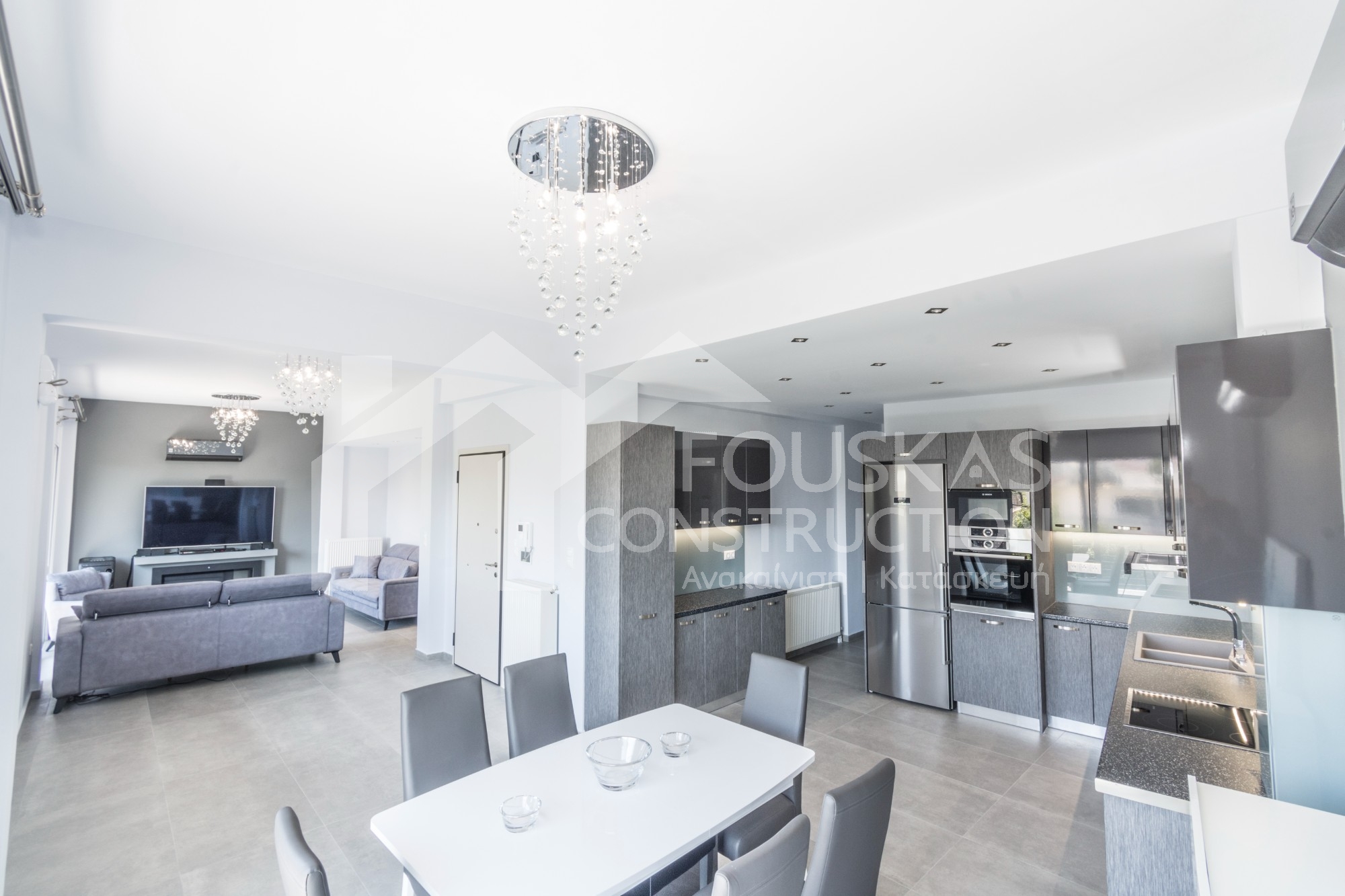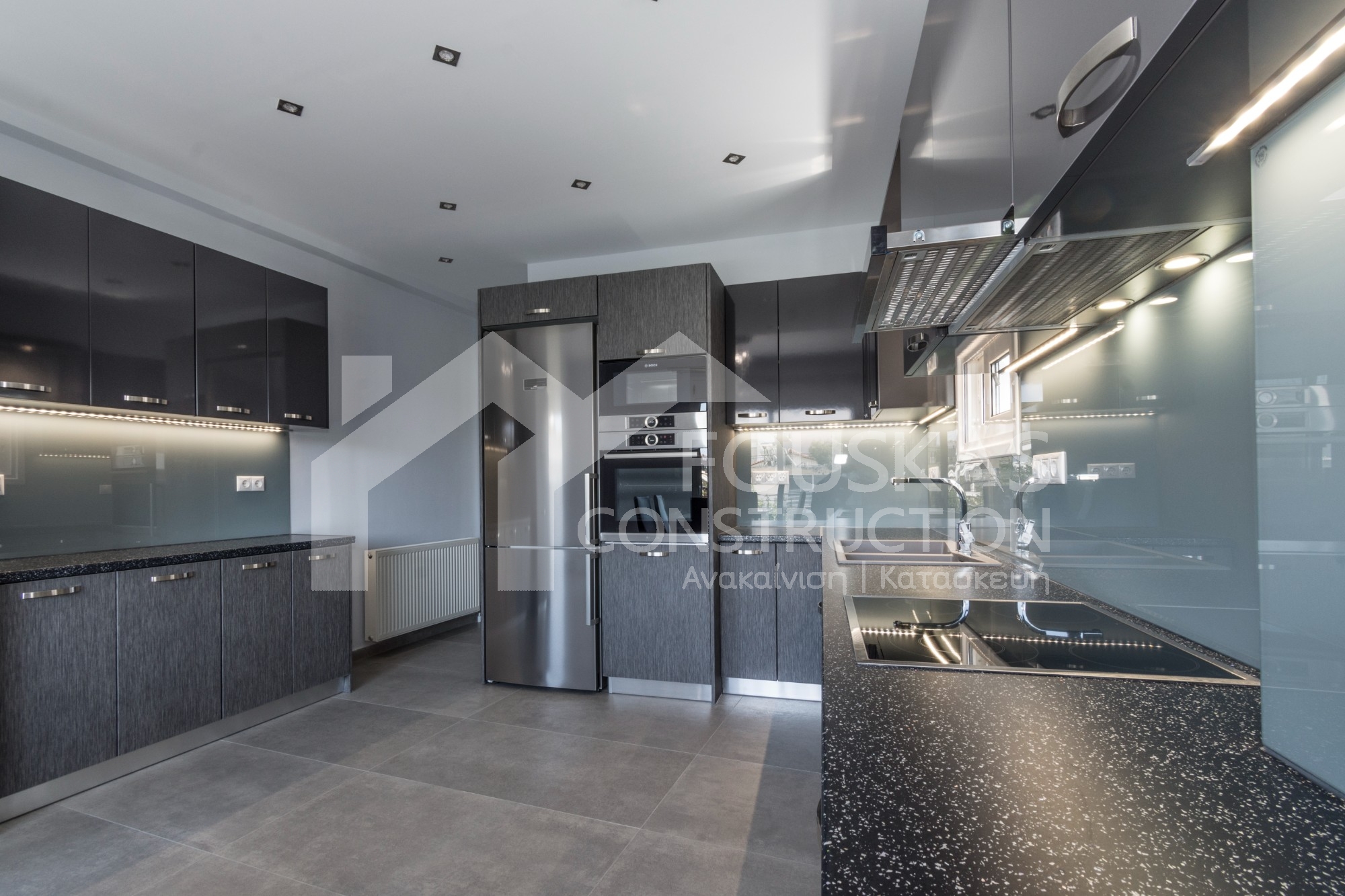 Η εταιρεία μας ολοκλήρωσε μία δύσκολη και περίπλοκη ανακαίνιση κατοικίας στο Παλαιό Φάληρο. Ο όροφος είχε δύο διαμερίσματα αρκετά παλαιά και έπρεπε να δημιουργήσουμε ένα με αυξημένες απαιτήσεις. Αρχικά γκρεμίστηκαν αρκετοί τοίχοι και δημιουργήθηκαν νέοι, έτσι ώστε να σχηματιστούν οι χώροι που έπρεπε. Έγιναν πάρα πολλές αλλαγές στα εξωτερικά κουφώματα και γενικά σε όλο τον όροφο. Δημιουργήθηκαν νέες υδραυλικές και ηλεκτρολογικές εγκαταστάσεις σύμφωνα με τις απαιτήσεις του πελάτη. Αφού ξηλώθηκαν τα δάπεδα έπρεπε να γεμιστούς με νέα τσιμεντοκονία από περλίτη για να έχουμε ηχομονωτικές ιδιότητες αλλά και μειωμένο βάρος. Τα δάπεδα καλυφτήκαν με πλακάκια μεγάλης διάστασης από γρανίτη σε μία όμορφη γκρι γήινη απόχρωση.