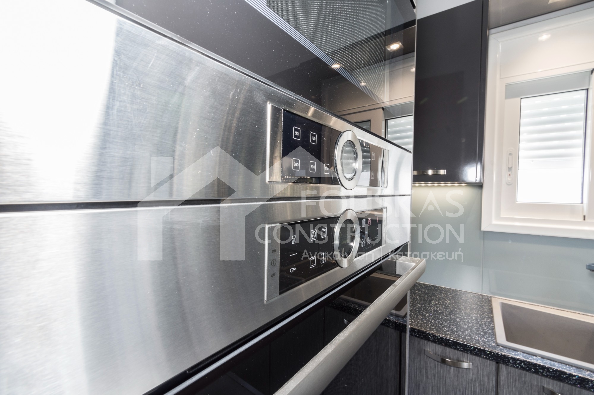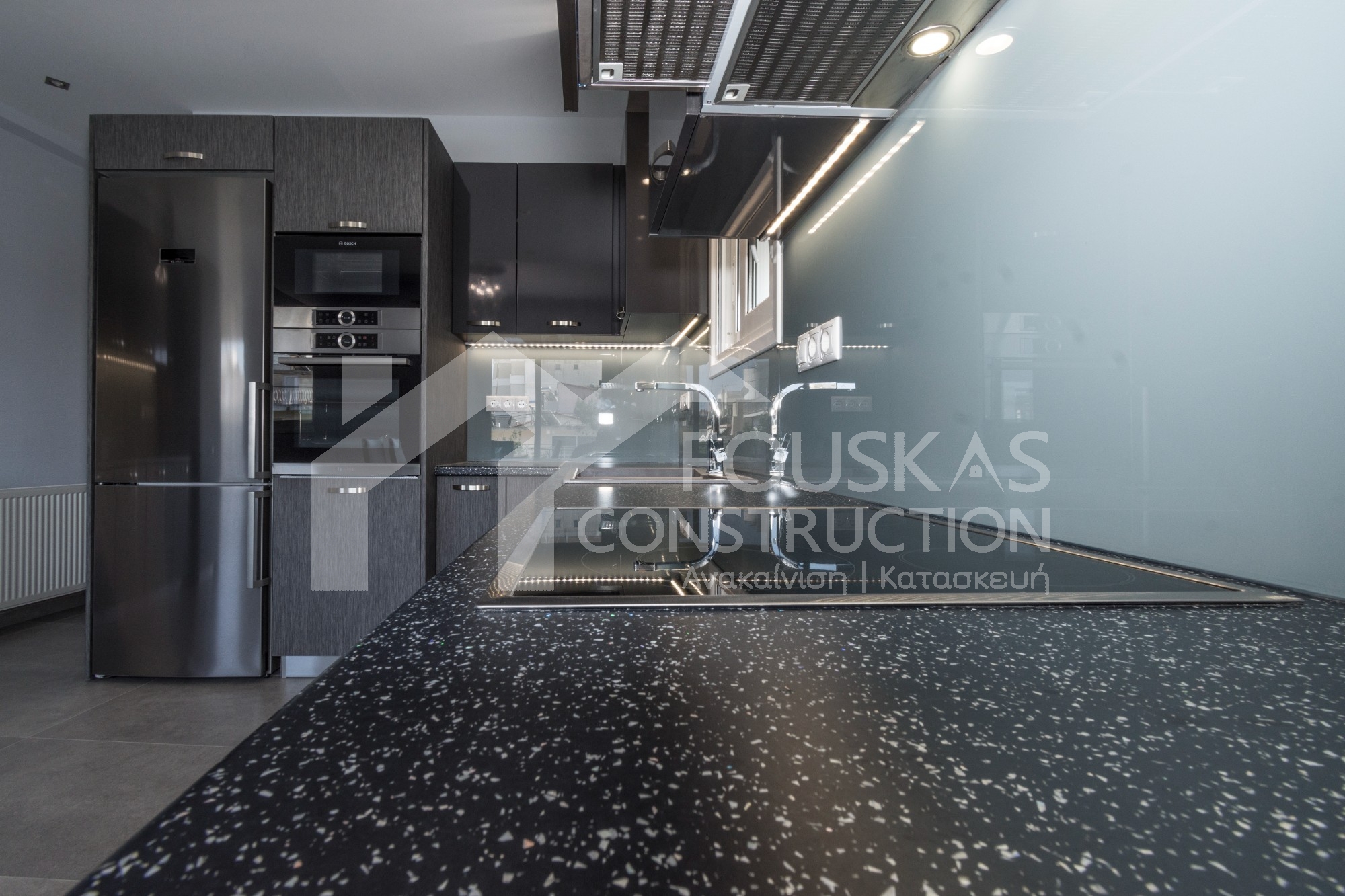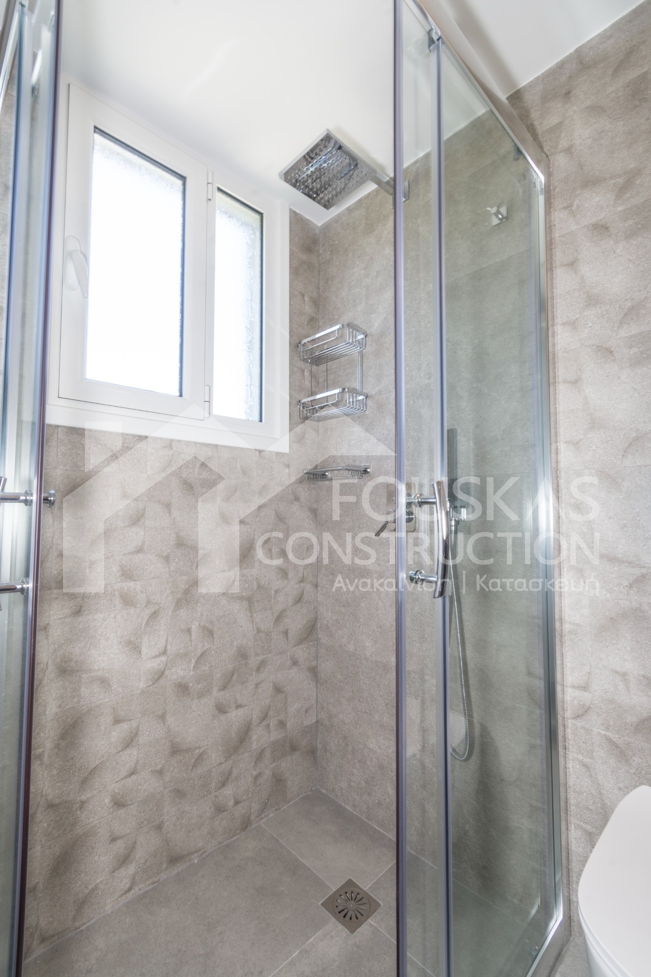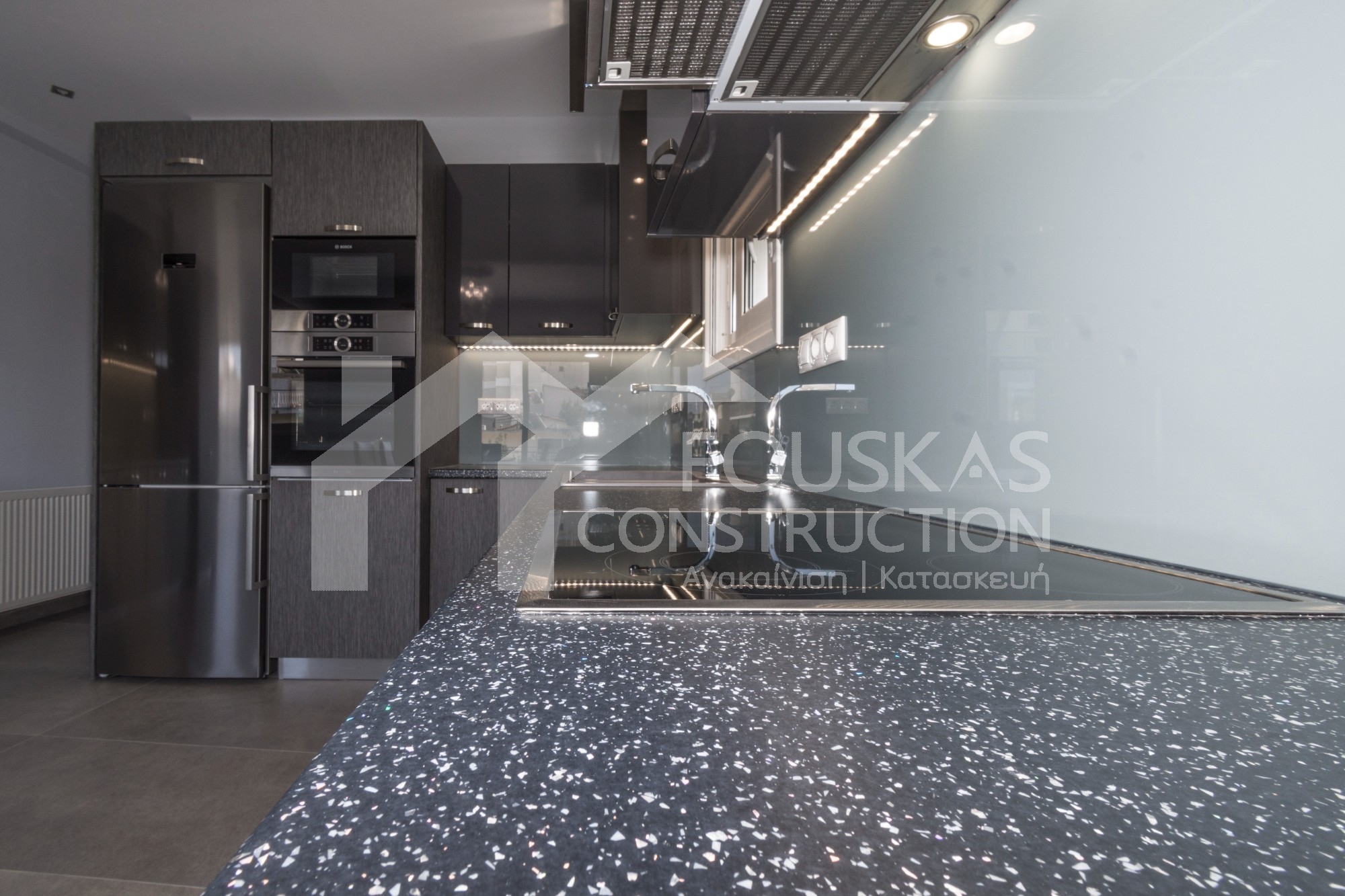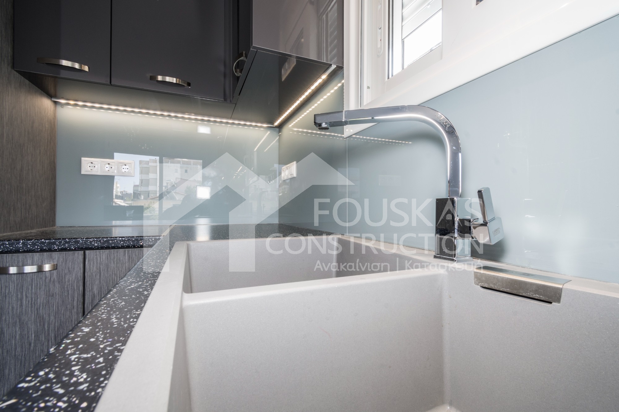 Η εταιρεία μας ολοκλήρωσε μία δύσκολη και περίπλοκη ανακαίνιση κατοικίας στο Παλαιό Φάληρο. Ο όροφος είχε δύο διαμερίσματα αρκετά παλαιά και έπρεπε να δημιουργήσουμε ένα με αυξημένες απαιτήσεις. Αρχικά γκρεμίστηκαν αρκετοί τοίχοι και δημιουργήθηκαν νέοι, έτσι ώστε να σχηματιστούν οι χώροι που έπρεπε. Έγιναν πάρα πολλές αλλαγές στα εξωτερικά κουφώματα και γενικά σε όλο τον όροφο. Δημιουργήθηκαν νέες υδραυλικές και ηλεκτρολογικές εγκαταστάσεις σύμφωνα με τις απαιτήσεις του πελάτη. Αφού ξηλώθηκαν τα δάπεδα έπρεπε να γεμιστούς με νέα τσιμεντοκονία από περλίτη για να έχουμε ηχομονωτικές ιδιότητες αλλά και μειωμένο βάρος. Τα δάπεδα καλυφτήκαν με πλακάκια μεγάλης διάστασης από γρανίτη σε μία όμορφη γκρι γήινη απόχρωση.