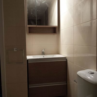 Κατά την επίσκεψη μας στο διαμέρισμα του πολυγώνου και μετά την αρχική εκδήλωση ενδιαφέροντος του ιδιοκτήτη του διαμερίσματος να προχωρήσει σε μερική ανακαίνιση οικίας, διαπιστώσαμε ότι η διαρρύθμιση του μπάνιου δεν ήταν λειτουργική και έχρηζε ριζικής ανακαίνισης. Γι αυτό προχωρήσαμε στις ακόλουθες εργασίες με κύριο στόχο την πλήρη ανακαίνιση μπάνιου :