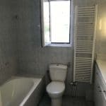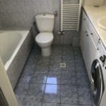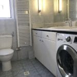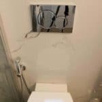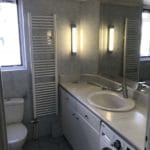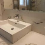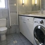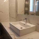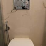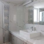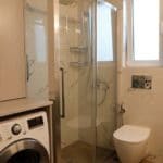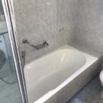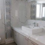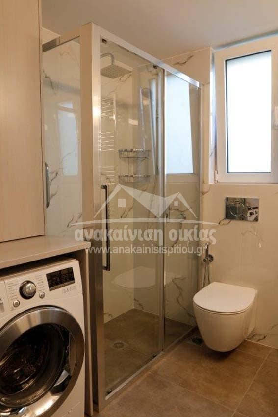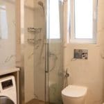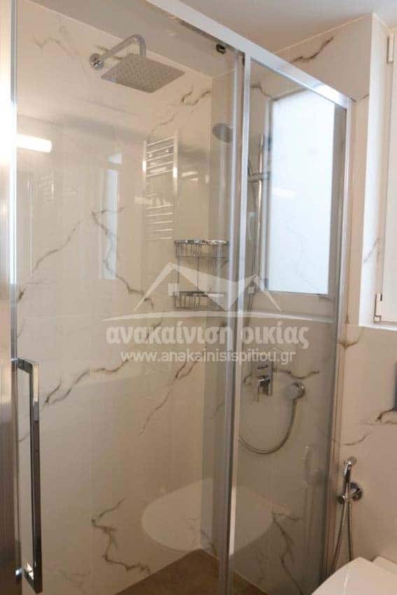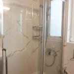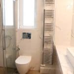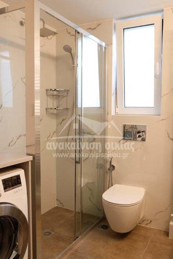 Καταρχάς αντικαταστάθηκαν οι παλαιές υδραυλικές εγκαταστάσεις με νέες και μετατράπηκαν κάποιες ηλεκτρολογικές γραμμές. Η μπανιέρα αντικαταστάθηκε με μία ασύμμετρη χτιστή ντουζιέρα που περικλείεται από μία όμορφη καμπίνα από κρύσταλλα. Στη συγκεκριμένη ανακαίνιση δεν τοποθετήθηκε συμβατική λεκάνη αλλά μία λεκάνη κρεμαστή με εντοιχισμένο καζανάκι. Τα πλακάκια που τοποθετήθηκαν είναι μεγάλης διάστασης από γρανίτη σε μία λευκή απόχρωση με γκρίζα νερά που θυμίζουν μάρμαρο.