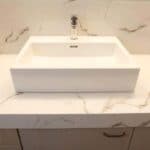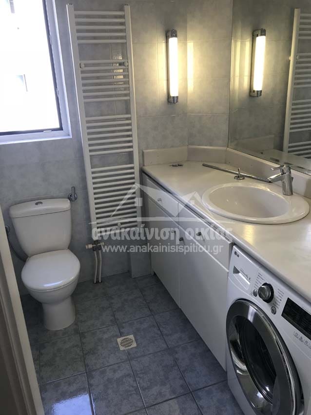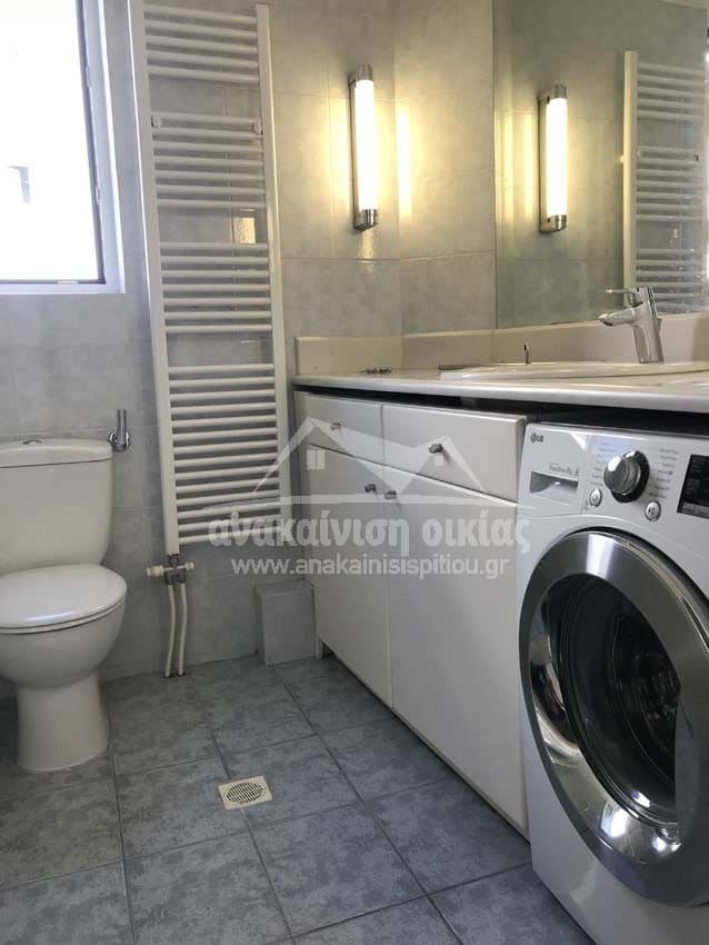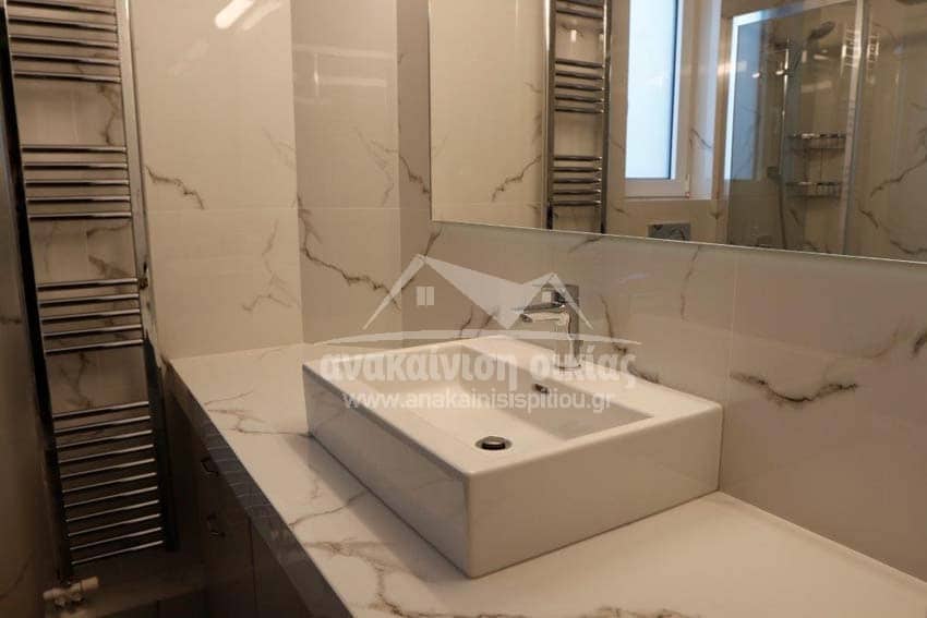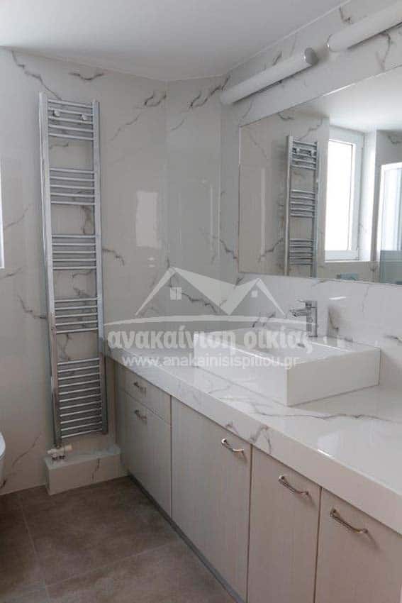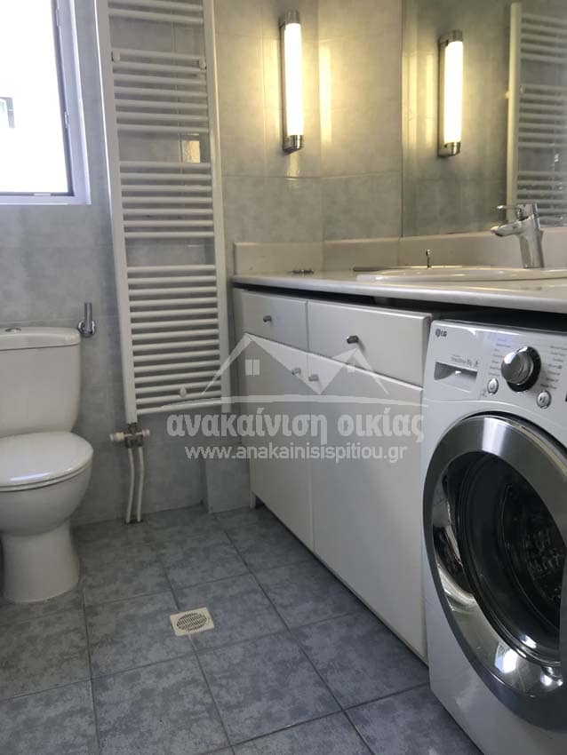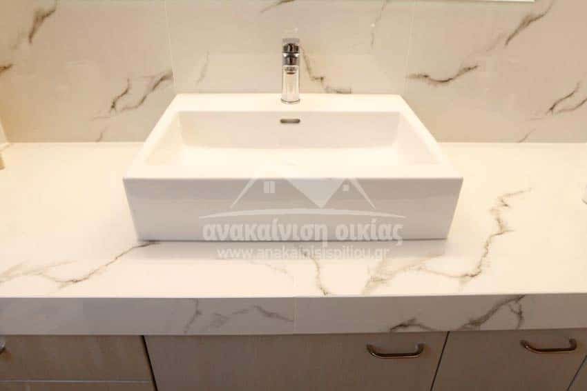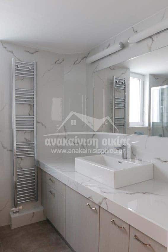 Δώσαμε μεγάλη έμφαση στις λεπτομέρειες στον τρόπο τοποθέτησης των πλακιδίων. Στην ντουζιέρα τοποθετήθηκε εντοιχισμένο σύστημα μπαταρίας με ταψί rain. Στη συνέχεια κατασκευάσαμε μεγάλο χτιστό πάγκο με έναν επιτραπέζιο νιπτήρα και κάτω από τον πάγκο ένα ευρύχωρο ντουλάπι σε μία όμορφη απόχρωση που δένει με όλο το υπόλοιπο σύνολο. Τέλος την τελευταία πινελιά στην ανακαίνιση μπάνιου την έδωσε η inox πετσετοκρεμάστρα.