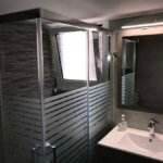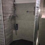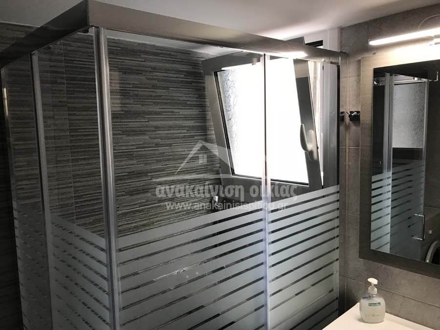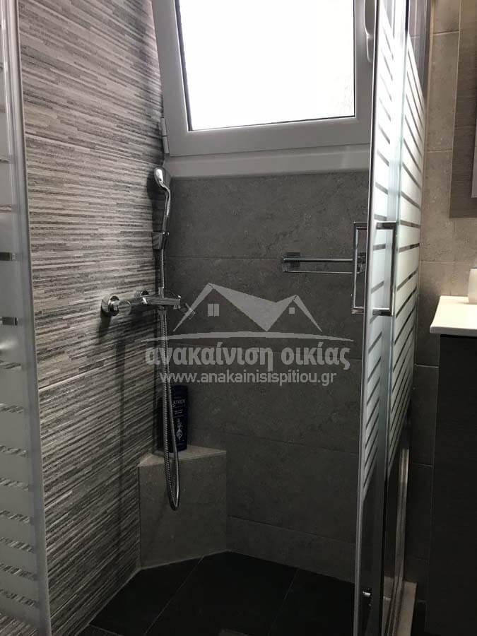 Η παλαιά μπανιέρα αντικαταστάθηκε και δημιουργήθηκε μία όμορφη χτιστή ντουζιέρα που περικλείεται από μία καμπίνα με συρόμενες πόρτες. Η ανακαίνιση μπάνιου συνεχίστηκε με την αντικατάσταση του παλαιού παραθύρου με νέο κούφωμα αλουμινίου. Η διάταξη του μπάνιου άλλαξε όπως θα δείτε από τις φωτογραφίες και έγινε αρκετά πιο λειτουργικό. Τα πλακάκια που χρησιμοποιήθηκαν είναι γρανίτης σε όμορφες γήινες αποχρώσεις του γκρι. Τέλος έγιναν κάποιες μετατροπές στα ηλεκτρολογικά του μπάνιου και χρωματίστηκε η οροφή του.