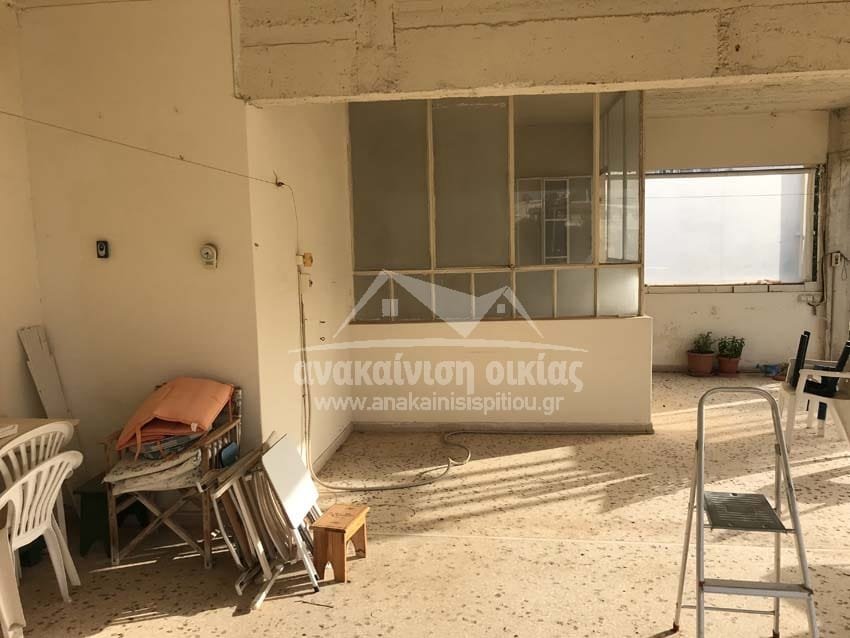 Η ανακαίνιση σπιτιού συνεχίστηκε με αλλαγή όλων των ηλεκτρολογικών και υδραυλικών εγκαταστάσεων με νέες σύμφωνα με τις σημερινές απαιτήσεις. Τα εξωτερικά κουφώματα αντικαταστάθηκαν με νέα κουφώματα αλουμινίου. Η κουζίνα στο ένα διαμέρισμα έγινε ενιαία με το σαλόνι και ξεχωρίζει πλέον από έναν χαμηλό διαχωριστικό τολιχο. Στο άλλο διαμέρισμα είναι ενιαία με ένα μακρύ πάσο. Στη συνέχεια προχωρήσαμε στην ανακαίνιση μπάνιου στο ένα διαμέρισμα και στην κατασκευή νέου μπάνιου στο άλλο.