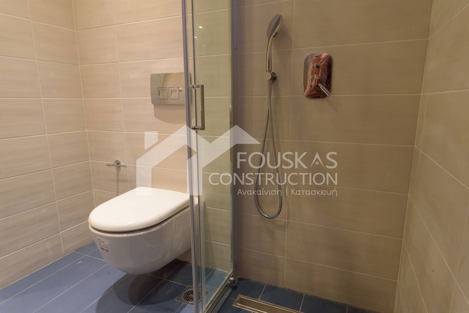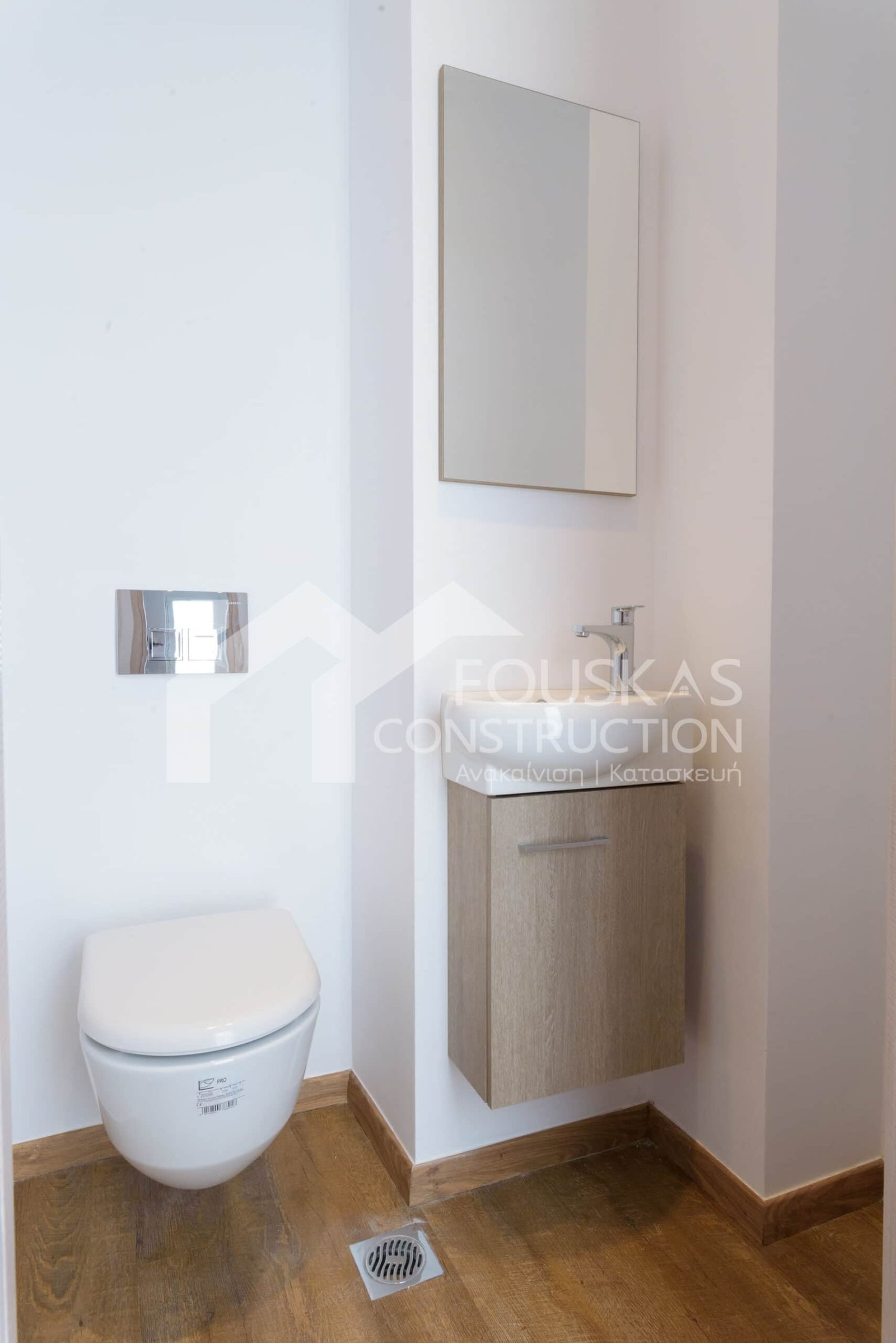 Στο μπάνιο και το wc τοποθετήθηκαν κρεμαστές λεκάνες με εντοιχισμένα καζανάκια, ενώ στο πρώτο τοποθετήθηκαν εντοιχισμένα στοιχεία στην ντουζιέρα. Η ανακαίνιση μπάνιου ολοκληρώθηκε με τους όμορφους συνδυασμούς των πλακιδίων. Τα παλαιά εξωτερικά ξύλινα κουφώματα αντικαταστάθηκαν με νέα κουφώματα αλουμινίου σε λευκή απόχρωση.