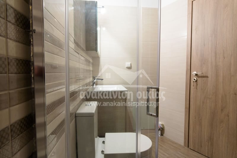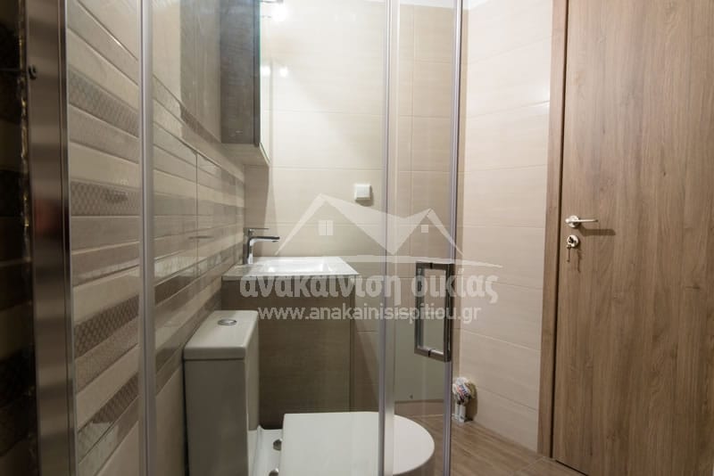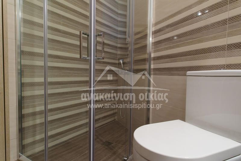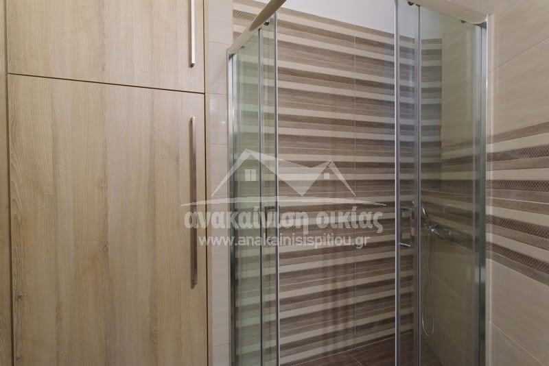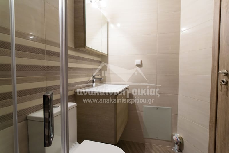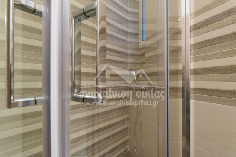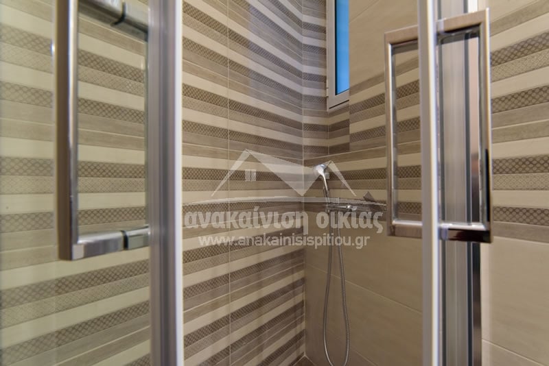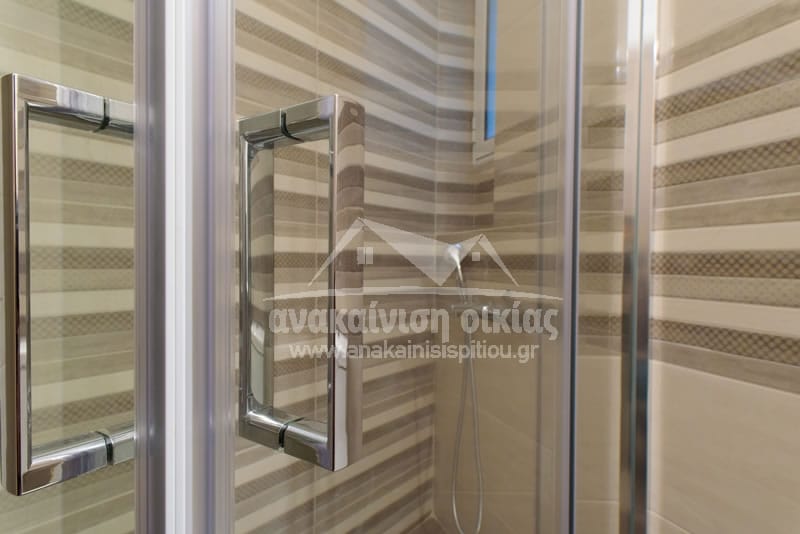 Υπήρχε δυσκολία στην υλοποίησή του επειδή ήταν παράγωνο και έπρεπε να γίνει όσο πιο λειτουργικό γίνεται. Τελικά όπως θα δείτε το αποτέλεσμα μας δικαίωσε και έγινε μία όμορφη ανακαίνιση μπάνιου με μία χτιστή ντουζιέρα ντυμένη με πλακάκια. Τα παλαιά εξωτερικά κουφώματα αντικαταστάθηκαν με νέα κουφώματα αλουμινίου σε λευκή απόχρωση.